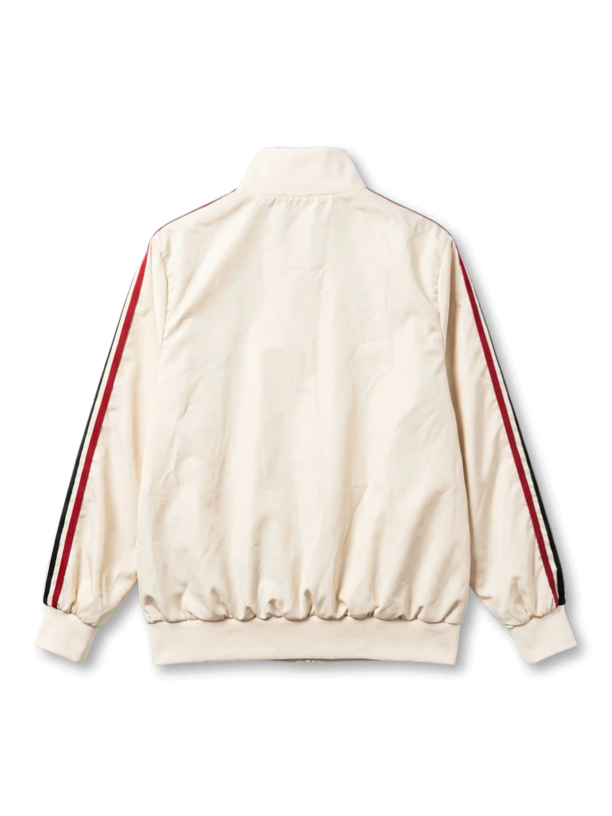 オフホワイト(クリーム)のトラックジャケット素材に肩から袖にかけてレッド×ブラック×レッドのトリプルストライプを配し、adidas Originalsの70〜80年代アーカイブシルエットを忠実に再現。フルジップ+スタンドカラー、リブ袖口・裾を採用した正統なトラックトップフォルム。左胸にadidas Originalsトレフォイルロゴ(ゴールド)、右胸に錨と交差オールをモチーフにしたCRFゴールドエンブレムを刺繍配置。左袖口に特製ウーブンラベルを縫い付けた未使用タグ付きデッドストック状態の稀少モデル。