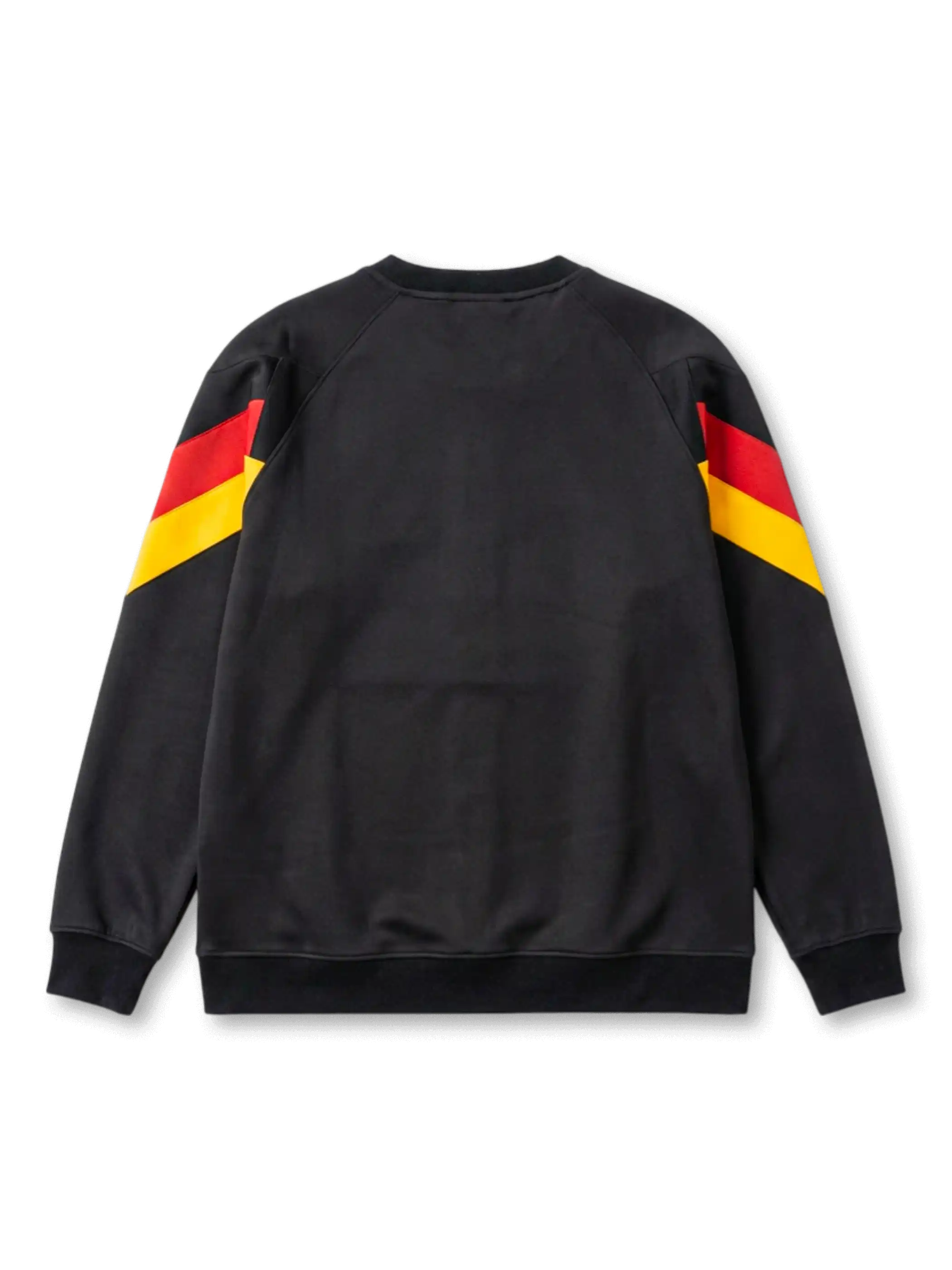 ブラックのスウェット素材ベースに肩から袖にかけてレッド×イエローのダブルシェブロンストライプを左右対称に配置し、1990年代adidas製ドイツ代表トレーニングウェアのアーカイブデザインを参照。クルーネック+ブラックリブカラー・袖口・裾リブ採用の長袖シルエット。胸部中央にadidas Originalsトレフォイルロゴ(白)、その直下にDFB(ドイツサッカー連盟)ワシモノクロ円形エンブレムを縦一列配置した格調あるOriginals限定モデル。