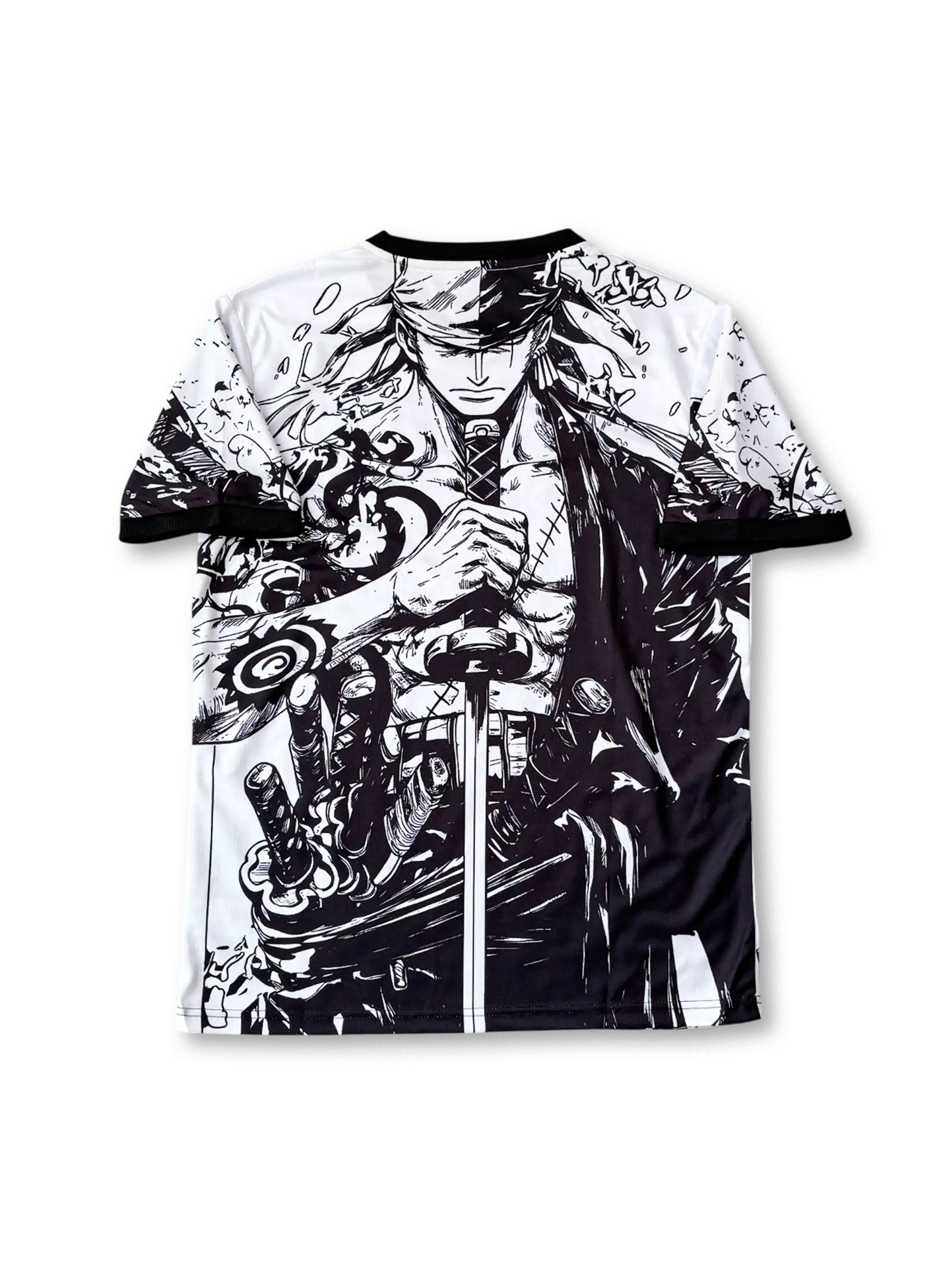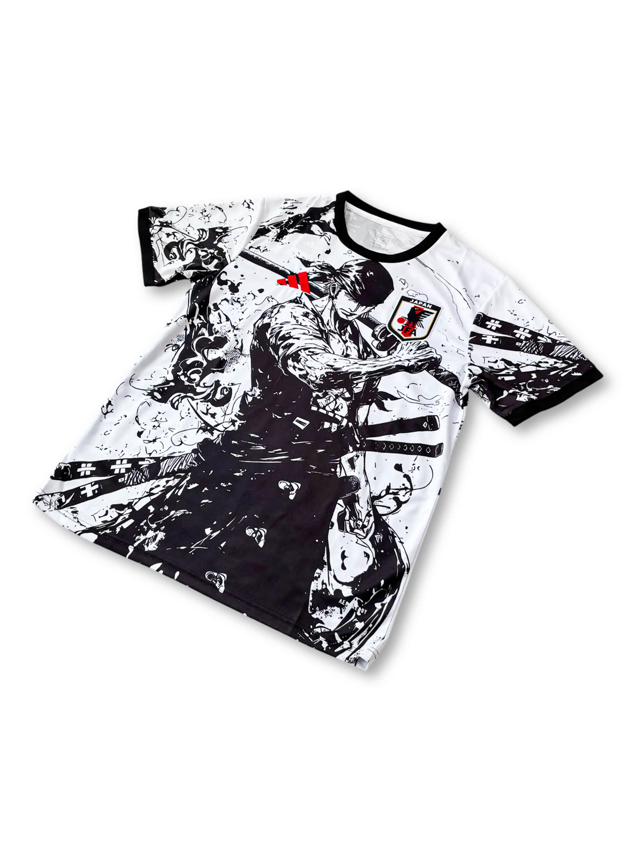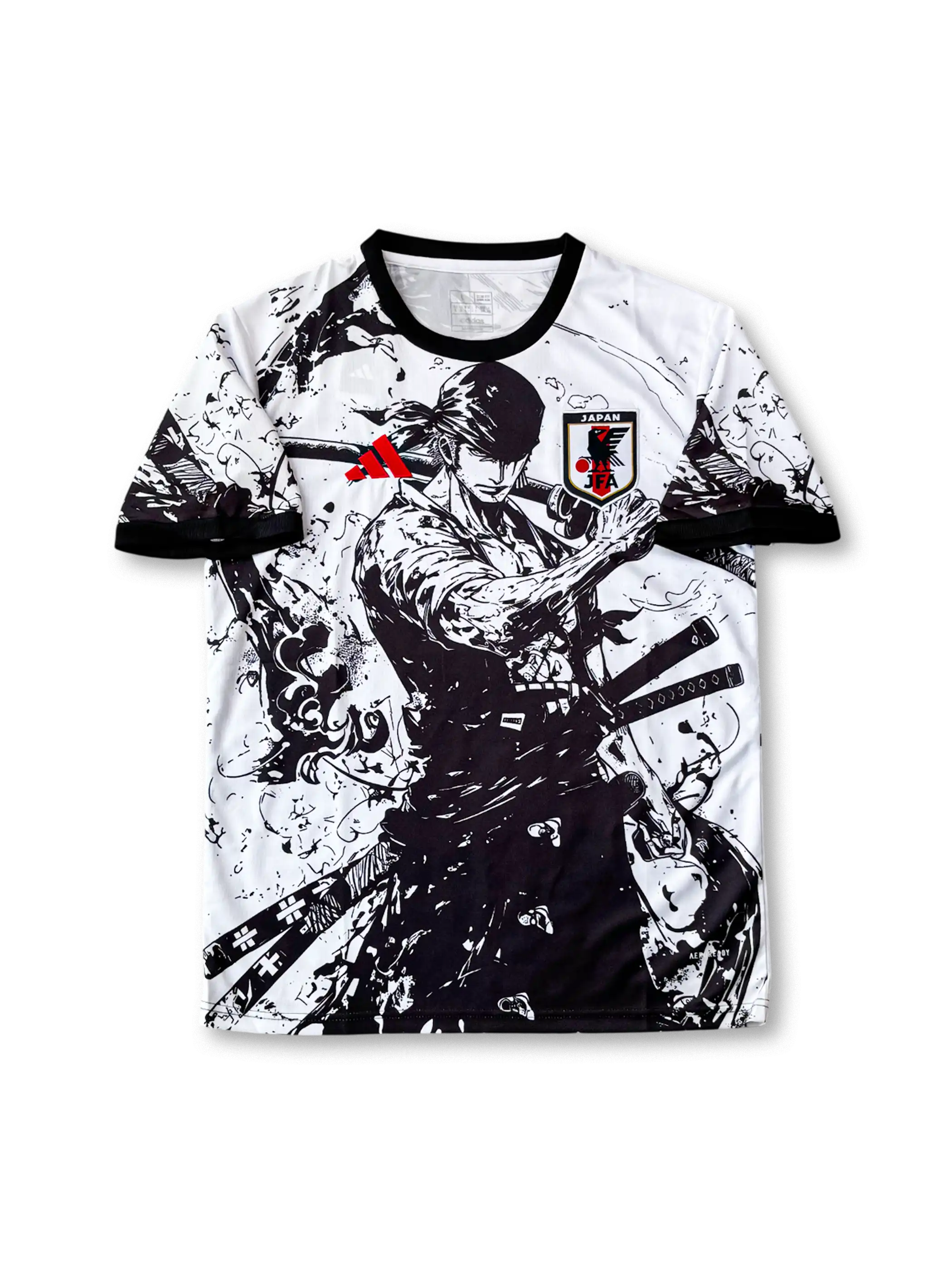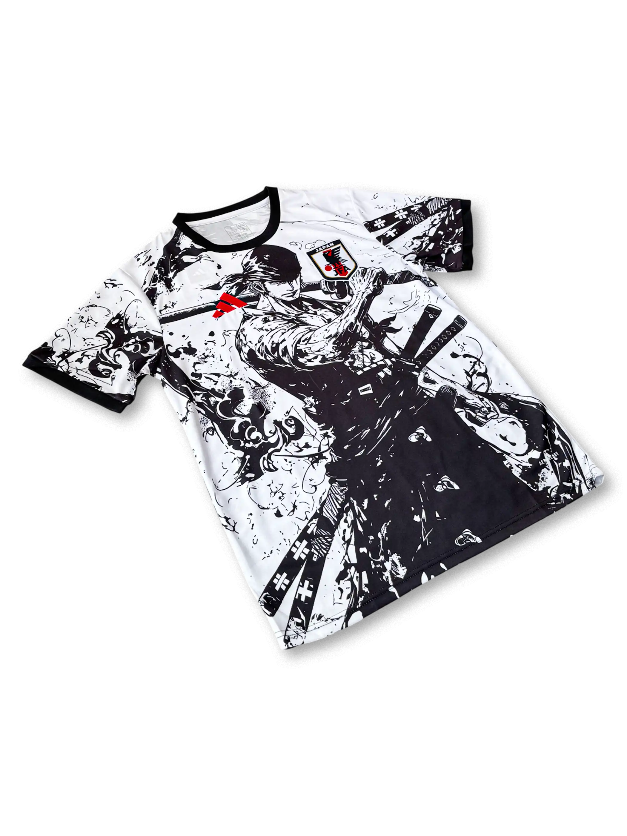 全体を白と黒で統一したモノクローム構成に墨飛沫の筆致を加え、前面には刀を構える武士像、背面には静かに刀を納める後ろ姿を描いたコンセプト仕様。胸には日本サッカー協会エンブレム、アクセントとして赤のアディダスロゴを配置し、武士道とアートが融合した視覚的インパクトの強いデザイン。