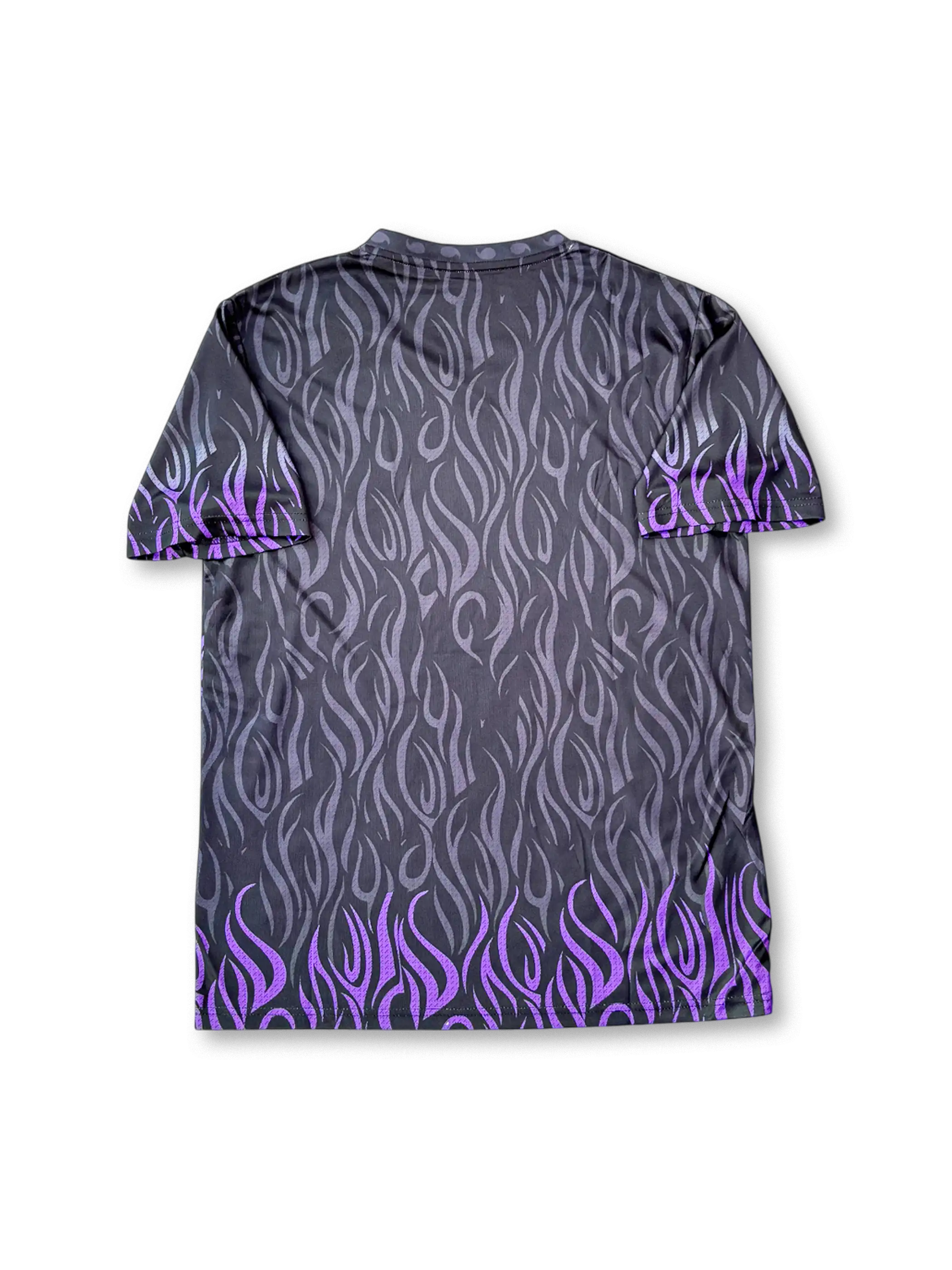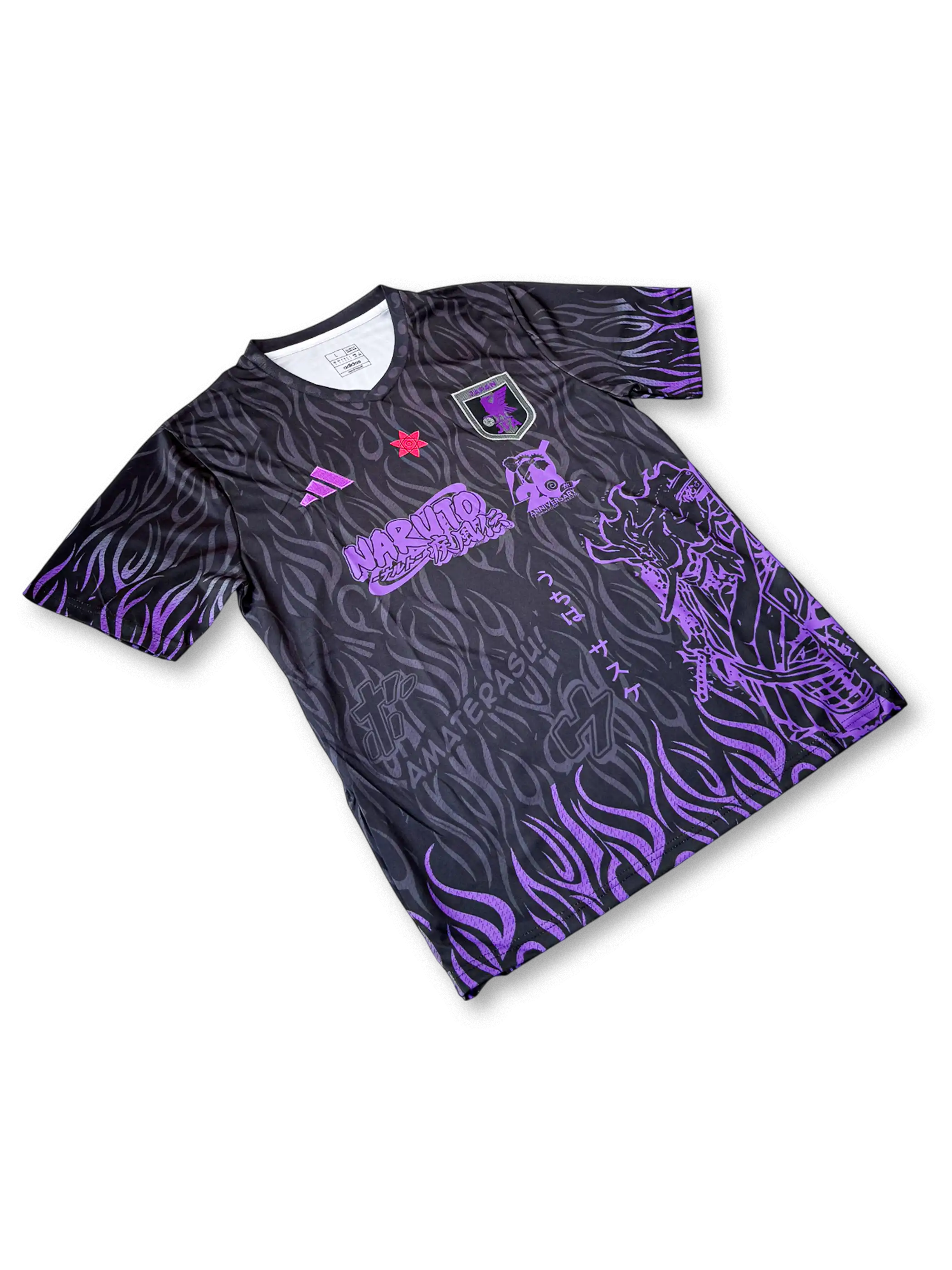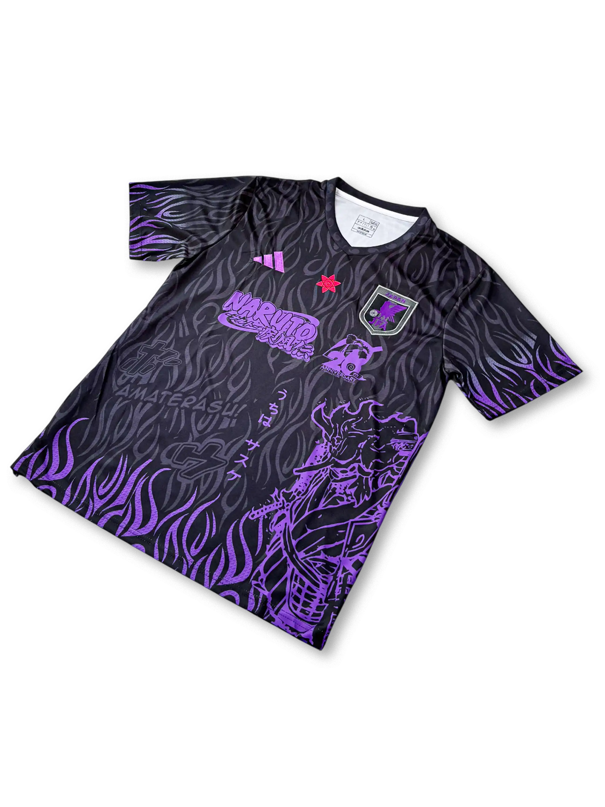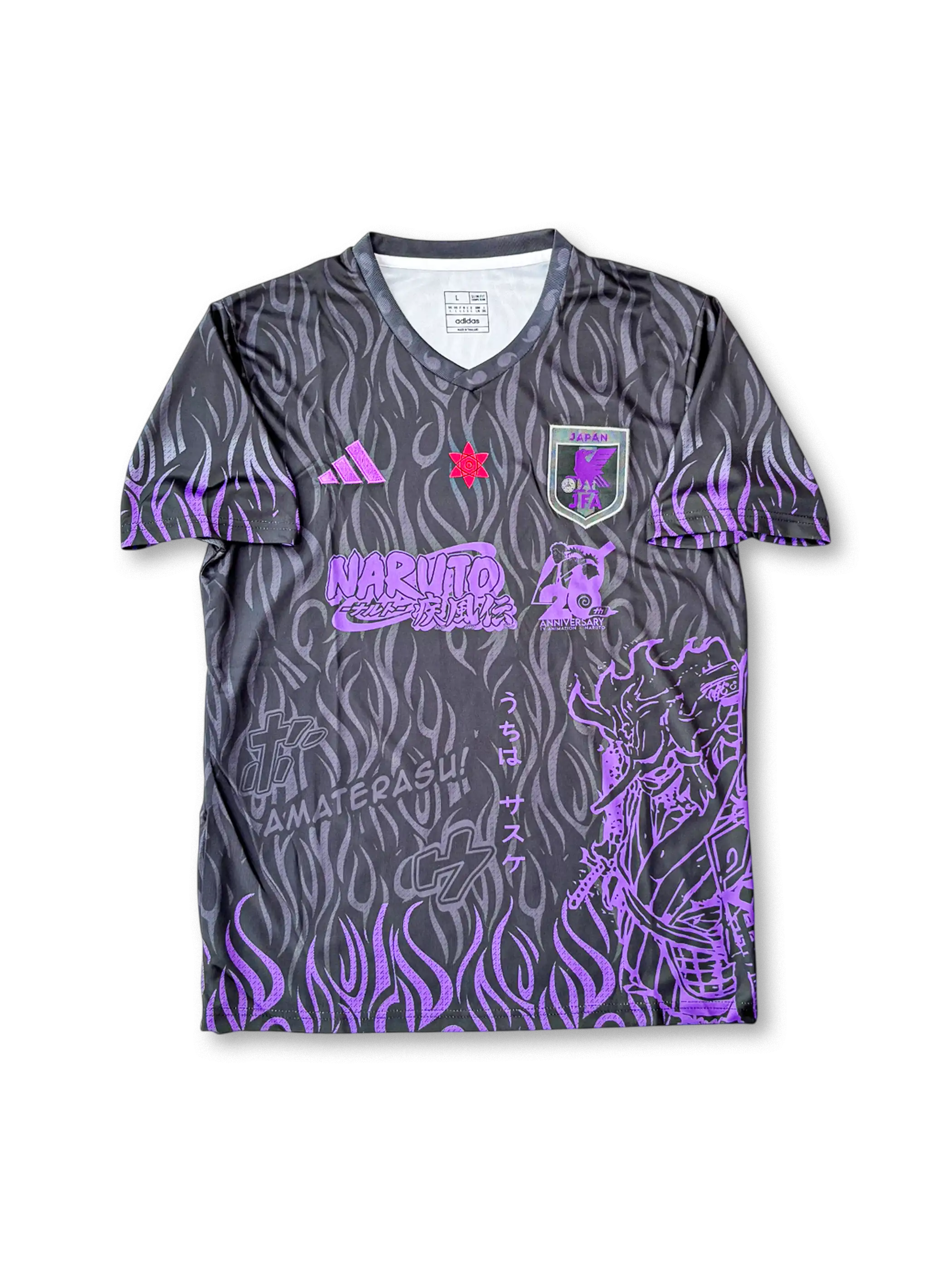 黒地に揺らぐ紫炎を全面に配し、左下にはうちはサスケの墨線イラスト、中央には「NARUTO 疾風伝」ロゴと20周年マークを配置した特別構成で、胸にはパープル仕様の日本サッカー協会エンブレムを搭載。うちは一族の象徴や天照を示すモチーフが散りばめられ、アニメ性とデザイン性を融合した独自のコンセプトモデルとなっている。