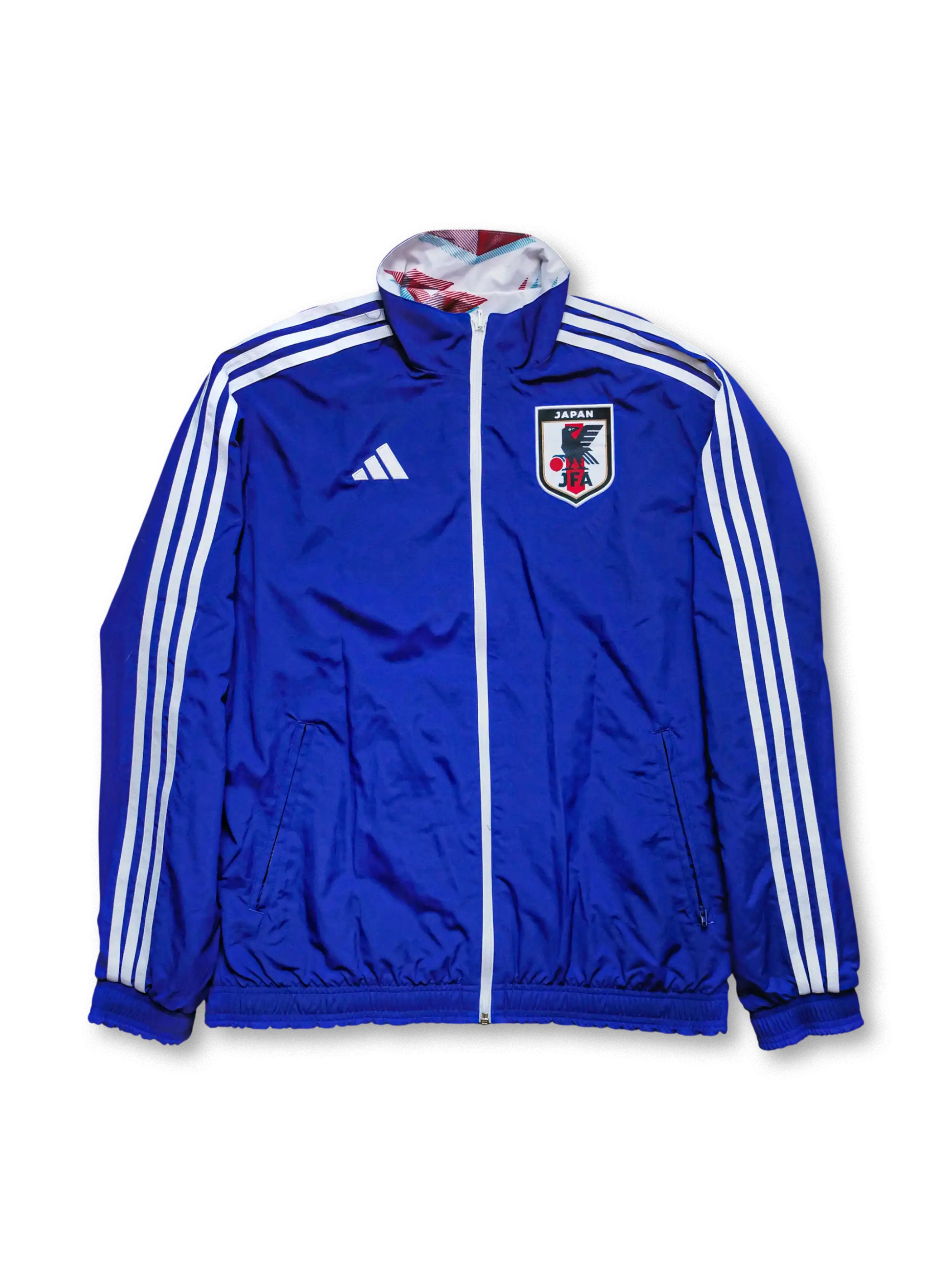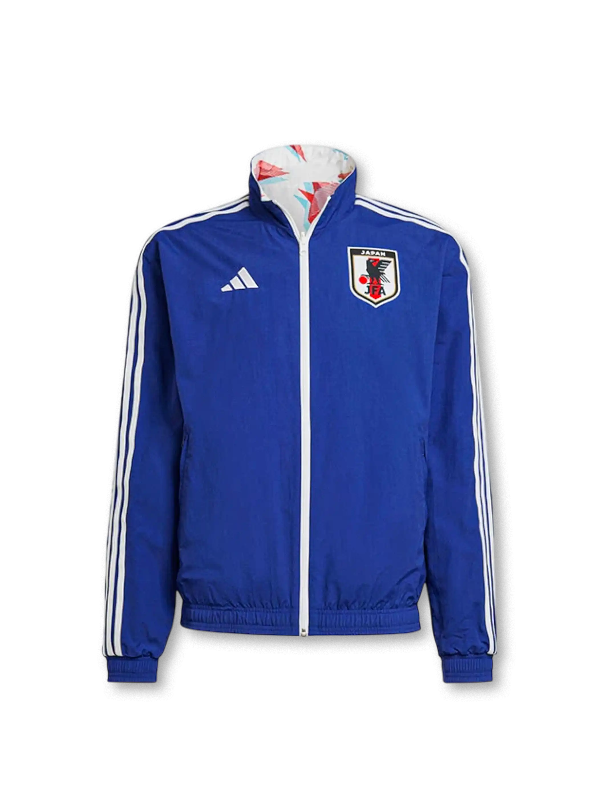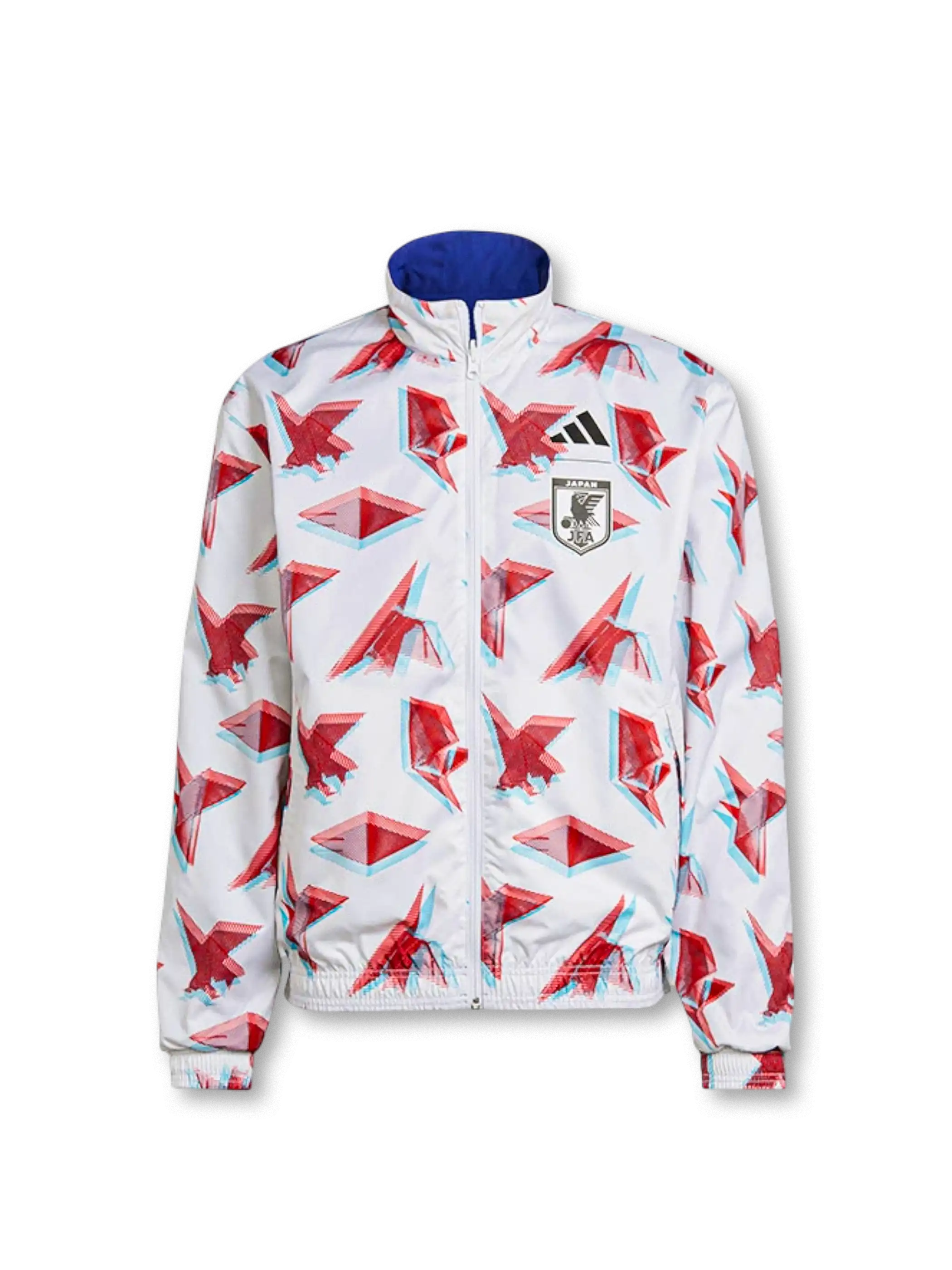 アディダスのスリーストライプと日本代表エンブレムを配したブルー面と、折り紙をモチーフにした幾何学グラフィック面を切り替え可能な構造で、軽量生地と防風性を確保しつつ二つのデザインを楽しめる実用的なリバーシブルモデルに仕上がっている。