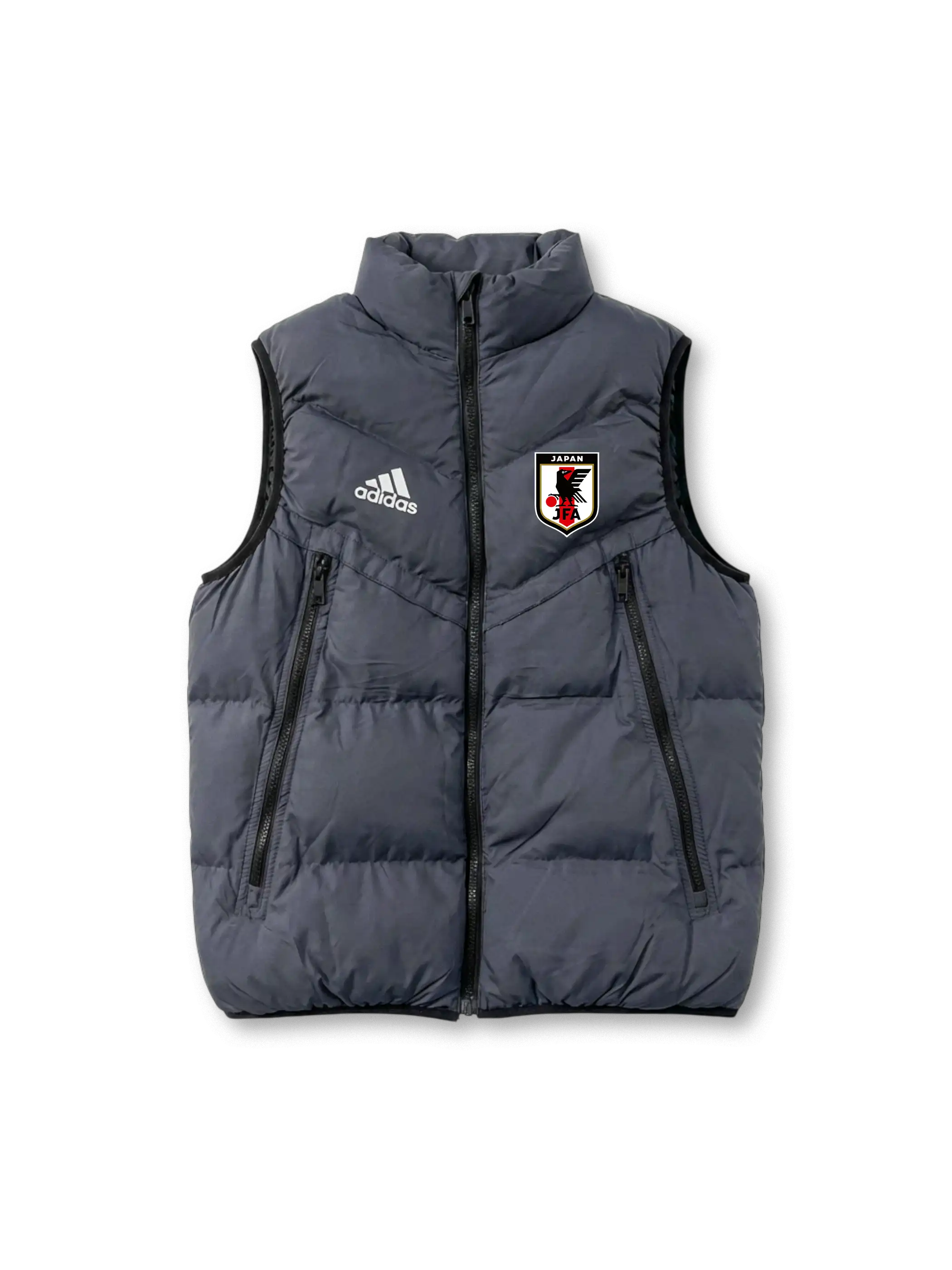 中綿入りの軽量構造により体幹部を効率的に保温しつつ、腕の可動域を確保したトレーニング用ベスト。フロントはフルジップ仕様で、両サイドにジップポケットを配置。日本代表エンブレムとadidasロゴを胸部に配した実用性重視のデザイン。