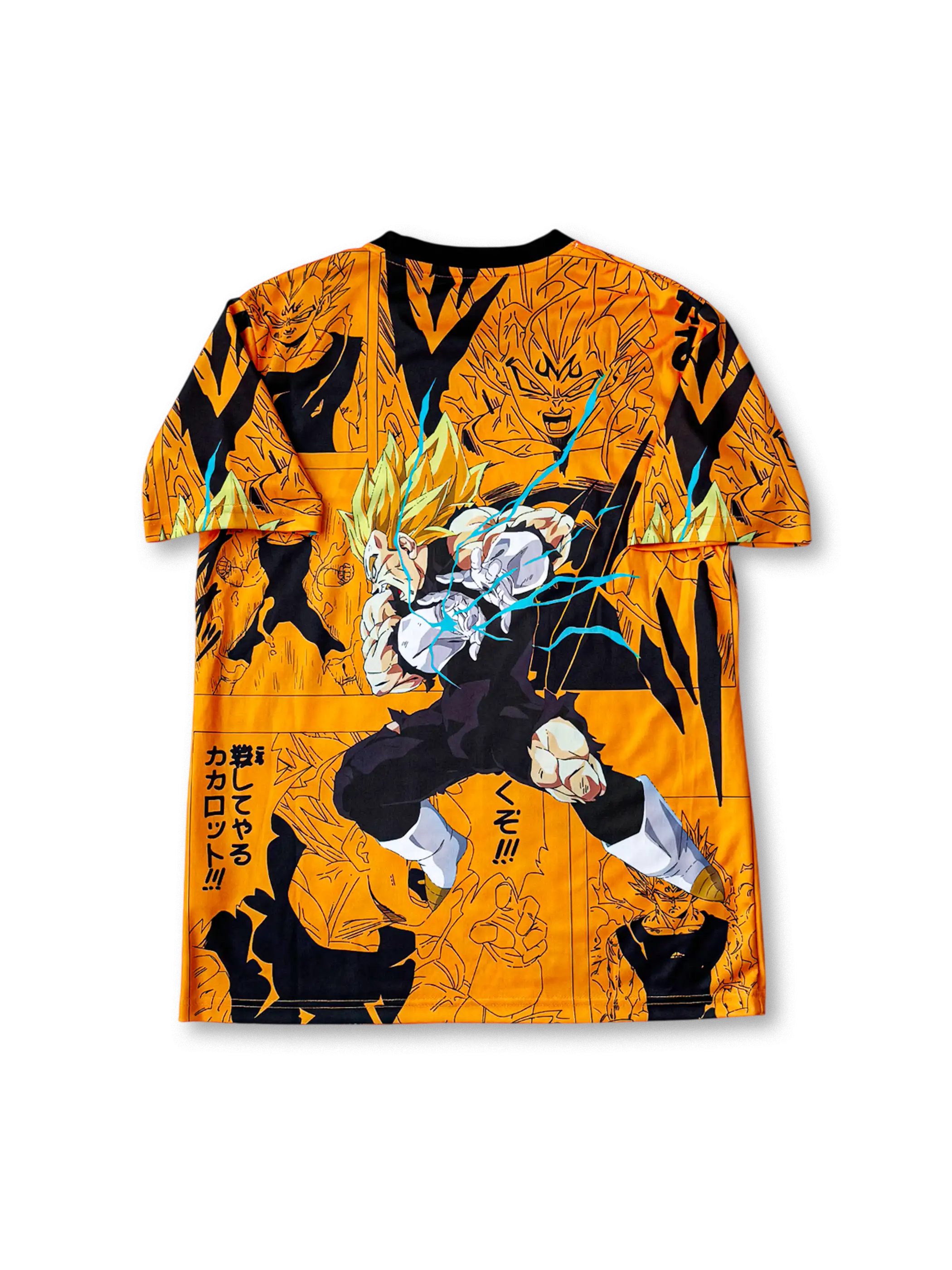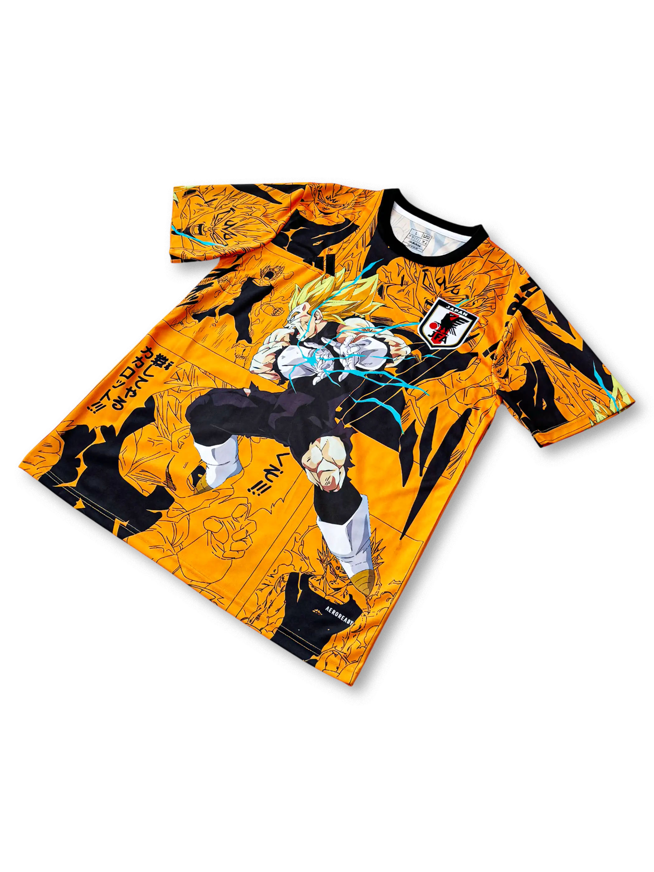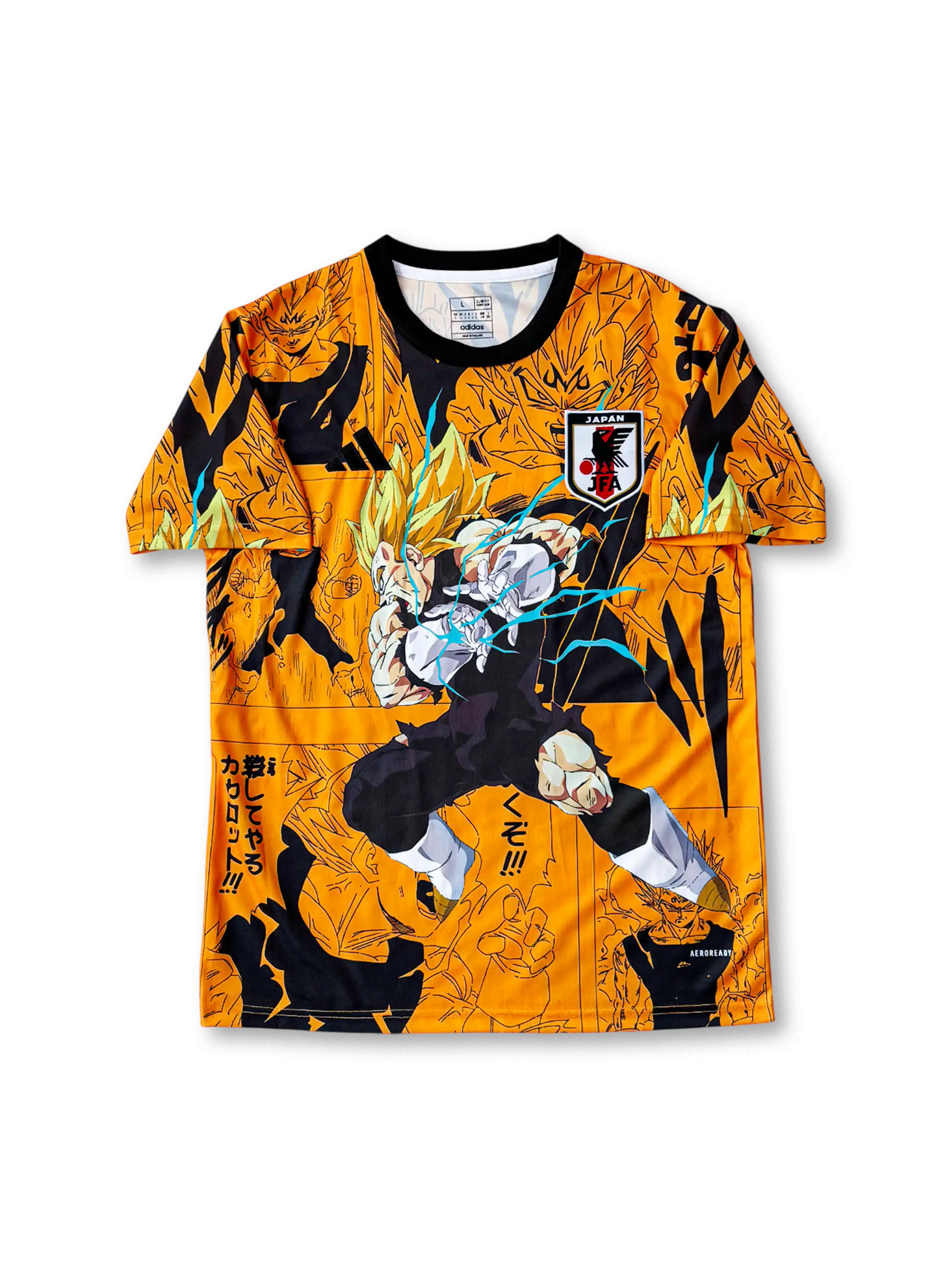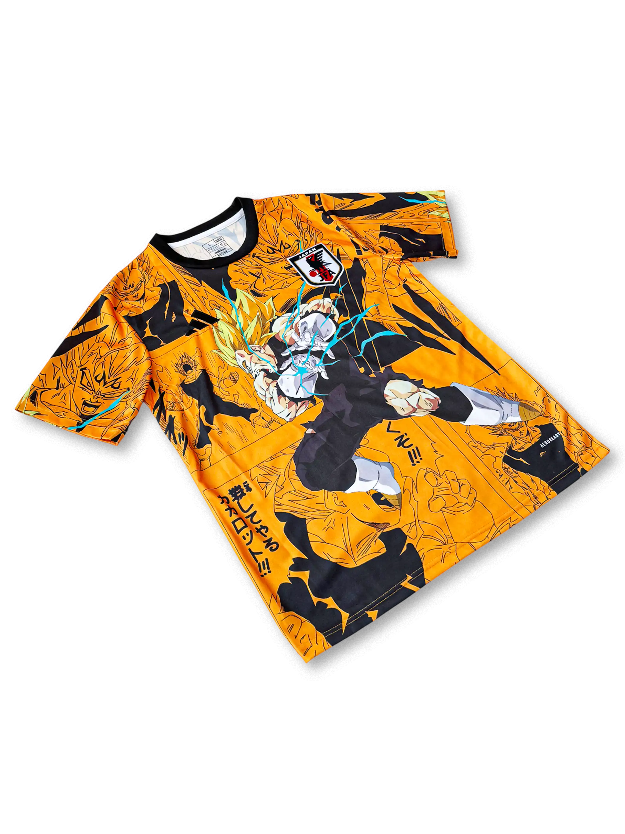 オレンジを基調に漫画コマを全面へ重ね、中央には超サイヤ人ベジータの戦闘シーンを大きく配置した特別仕様で、胸には日本サッカー協会エンブレム、肩にはブラックのアディダスロゴを配した構成。激しい筆致とエネルギーエフェクトが生む高密度グラフィックは視覚的インパクトが強く、コレクション用途に適したコンセプトデザイン。