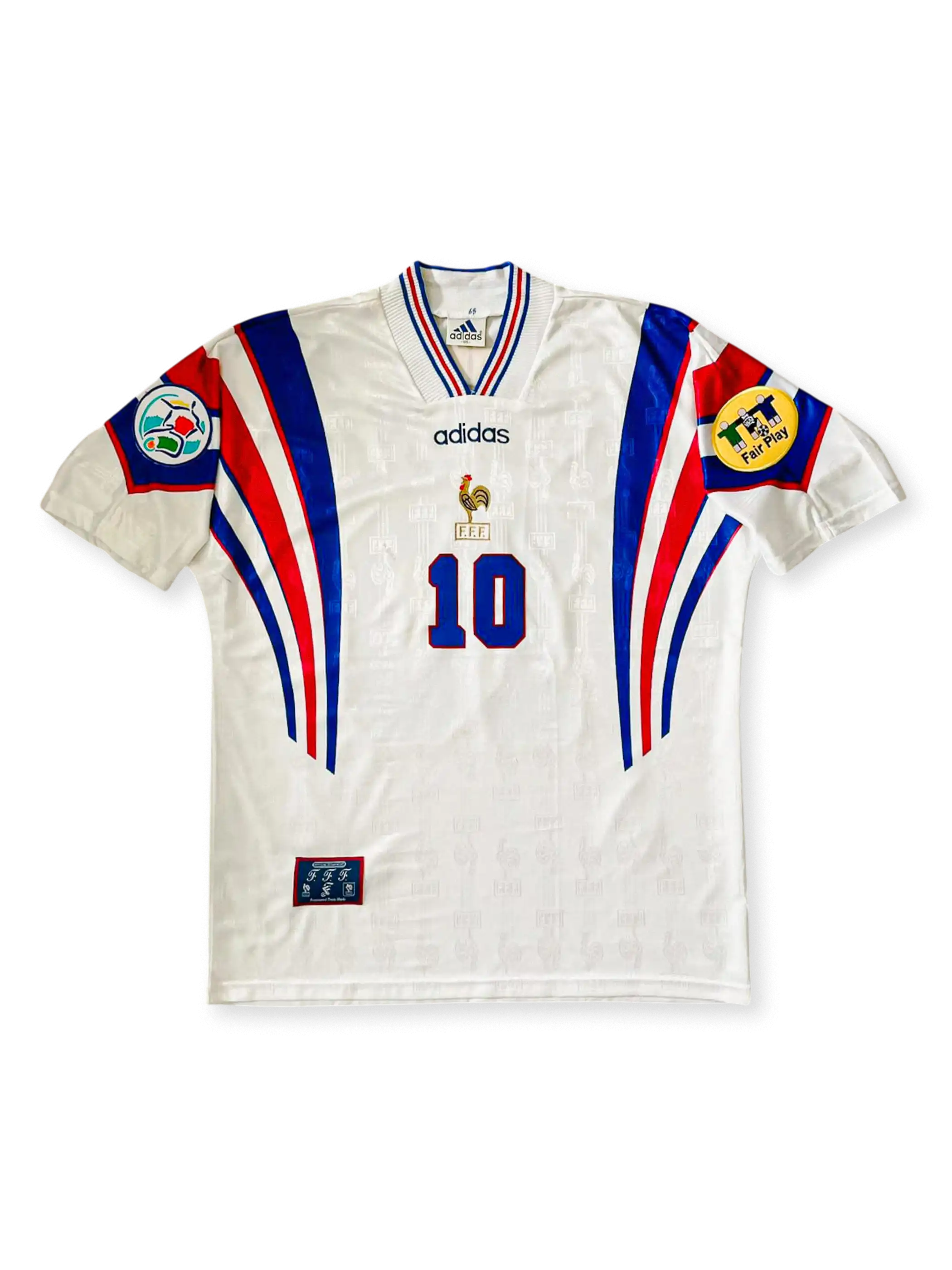 EURO 1996のグループステージ3試合でジダン10番が着用し、準決勝進出を支えた公式マッチユニフォーム。