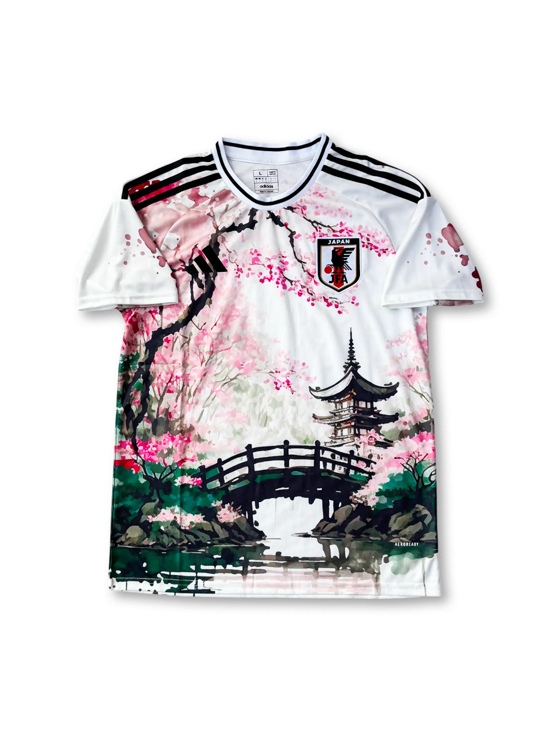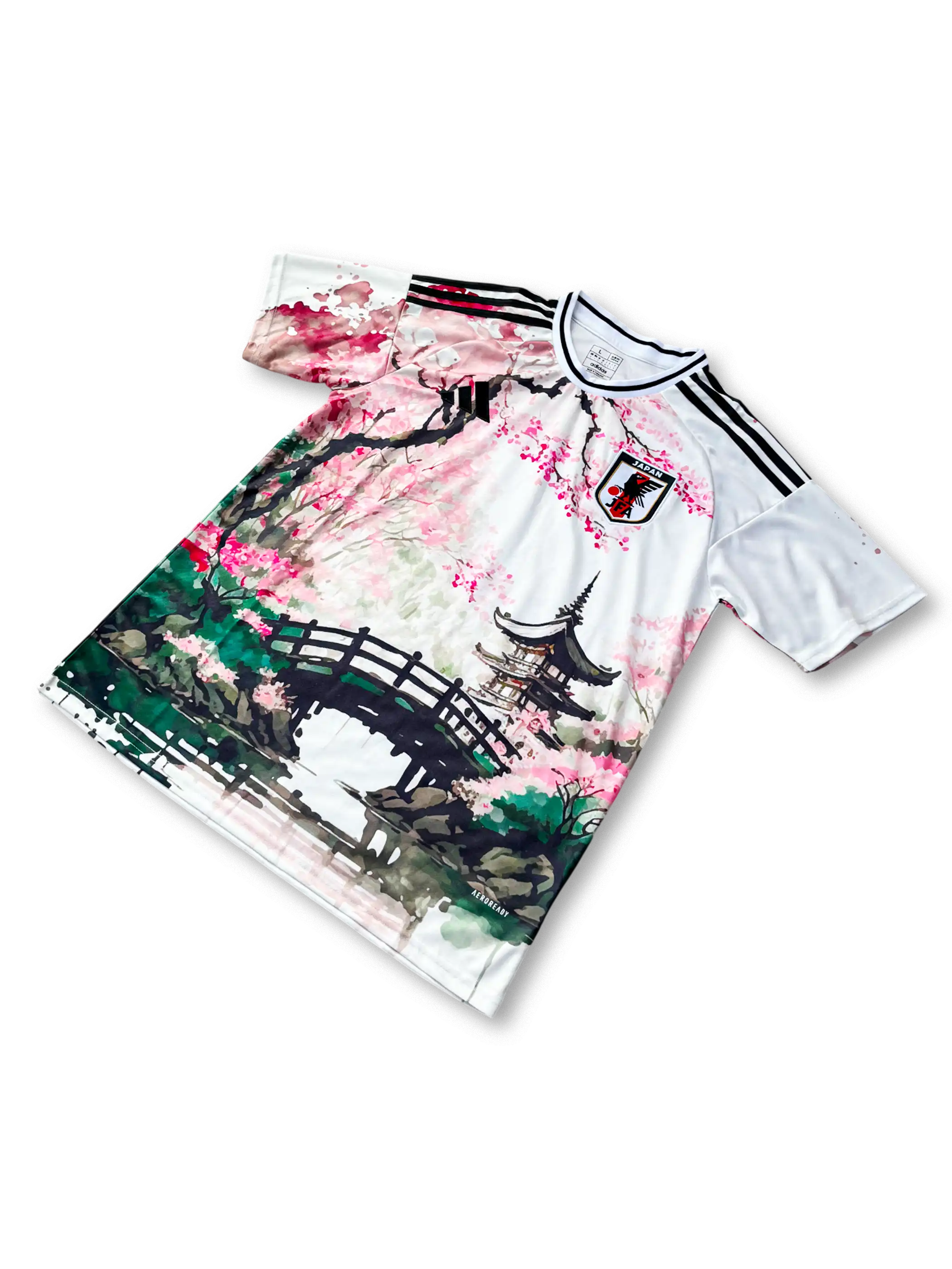 この2025–2026日本代表桜吹雪グラフィックユニフォームは、清潔感あるホワイトをベースに、前後全面に大柄の桜吹雪と池泉回遊式庭園の橋・五重塔をあしらったアートピースのようなデザインが特徴です。ネイビーブルーのリブ仕立てクルーネックと肩のアディダススリーストライプス、赤のサイドパイピングが鮮やかなコントラストを演出。ラグランスリーブ下のメッシュインサートにより高い通気性を確保し、軽量リサイクルポリエステルのAEROREADY素材が優れた吸汗速乾性を発揮します。襟裏には限定ナンバリング入りの認証タグを配し、「アートとサッカーの融合」を体現する高いコレクタブル価値を誇ります。