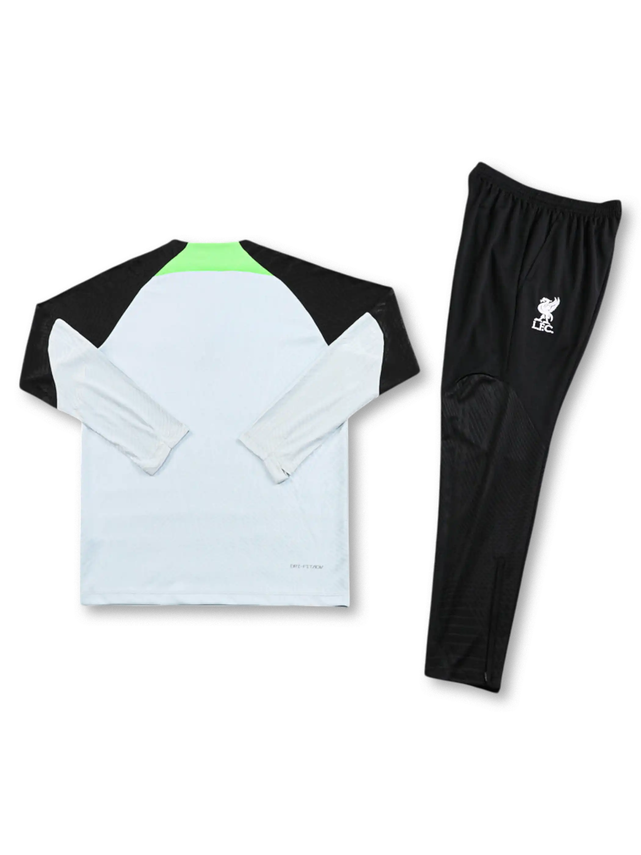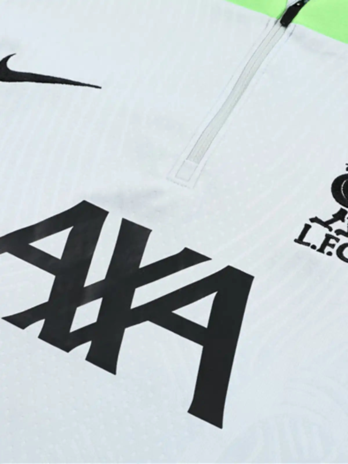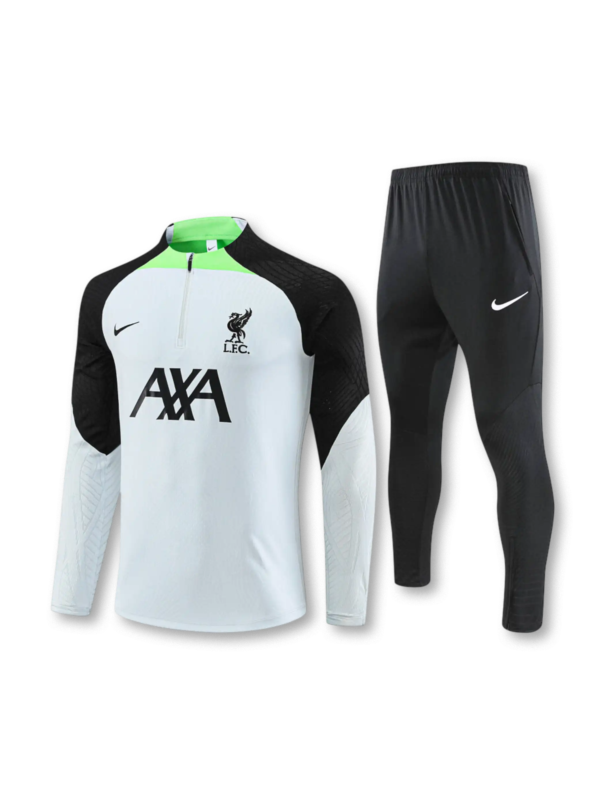 ホワイトの身頃にブラックの肩〜上腕切替を入れ、襟元に蛍光グリーンの差し色を効かせたトレーニングセット。トップはスタンドカラーのハーフジップ仕様で、胸元にクラブエンブレムとスウッシュ、フロントにAXAロゴを配置。パンツはブラック基調にスウッシュをまとめ、膝付近のテクスチャ表現で単調さを抑えた構成。素材はポリエステル系を前提に、通気性と扱いやすさを意識した上下セットとして運用できる。