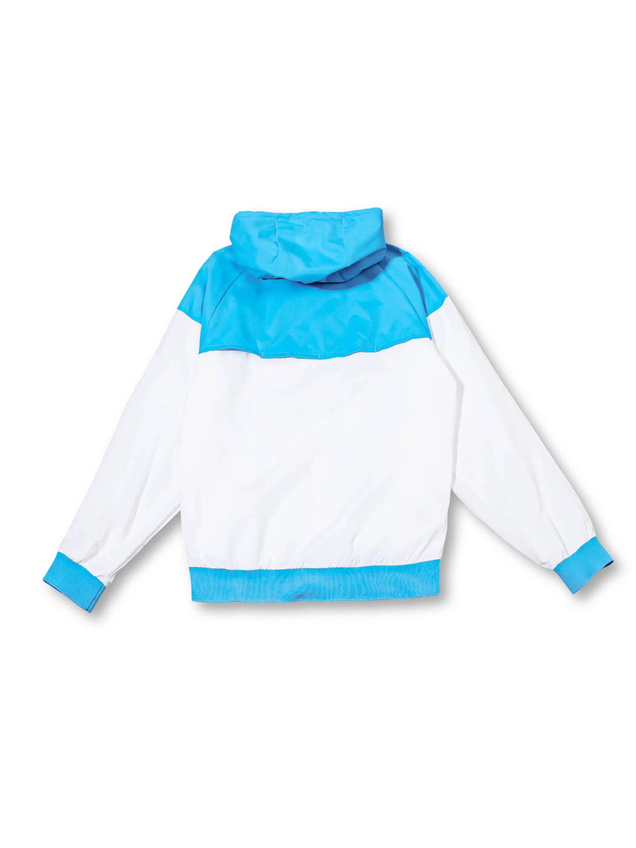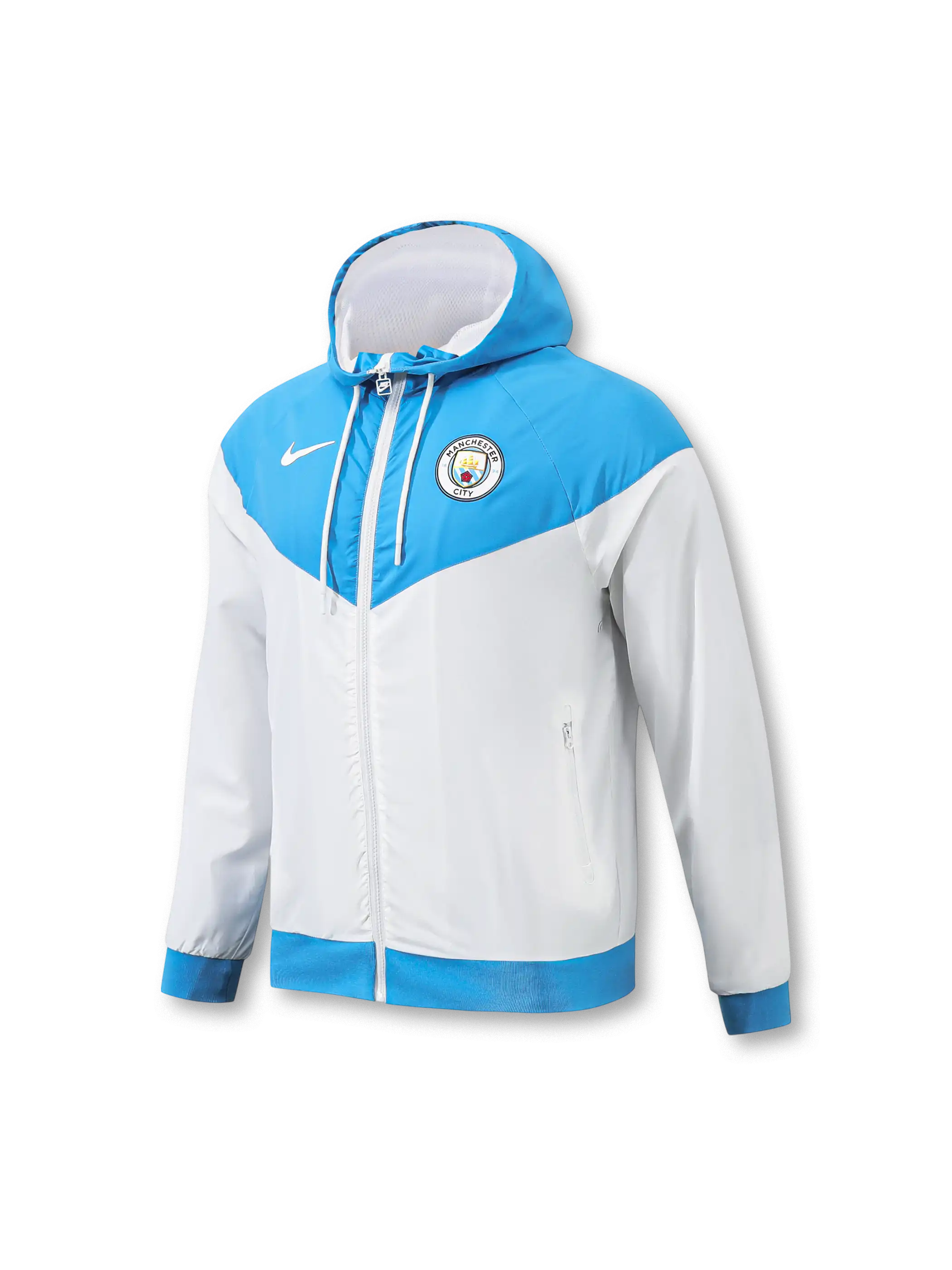 クラブカラーであるスカイブルーとホワイトを大きな切り替えで配置し、胸元にはスウッシュロゴと現行エンブレムを刺繍で施し、軽量防風素材と快適なシルエットによりトレーニングからタウンユースまで対応する現代的なウィンドジャケットとして仕上げられている。