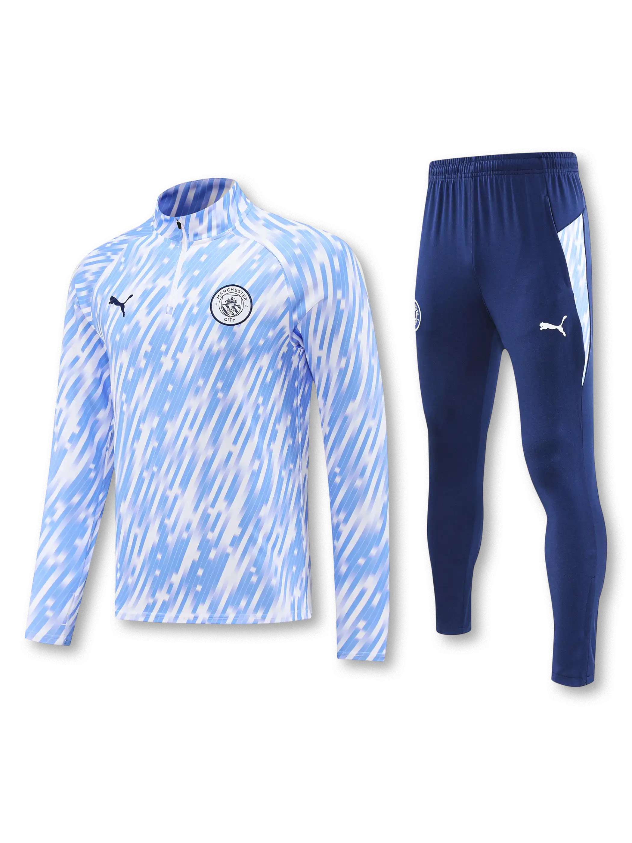 クラブを象徴するライトブルーを基調としたハーフジップトップと、ネイビーカラーのトレーニングパンツを組み合わせたセットアップ。トップスは全面にリズミカルなパターンを施し、視覚的な軽快さと通気性を両立。パンツは動作時の干渉を抑えるスリムシルエットで、日常的なトレーニングから移動時まで対応する実用設計。