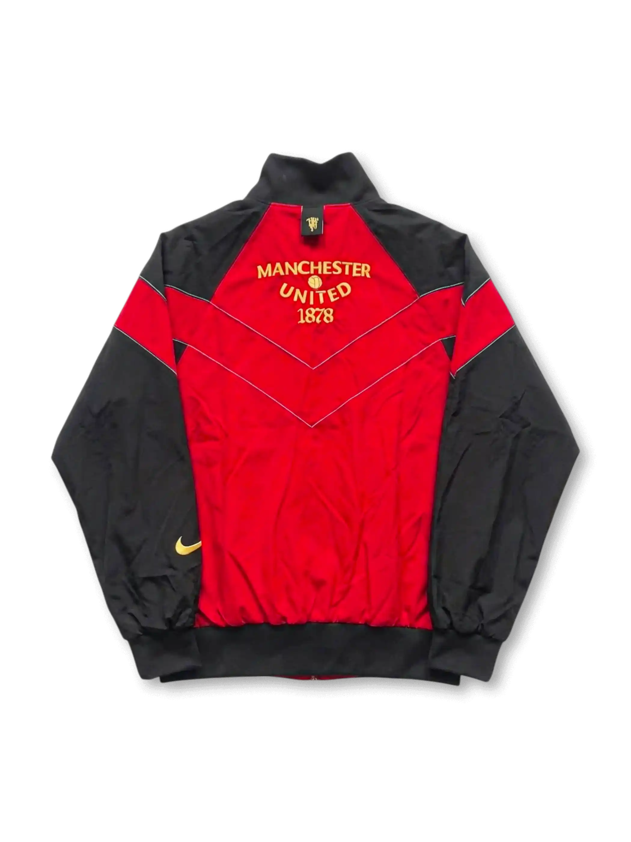 鮮やかなレッドボディにブラックスリーブを組み合わせ、前後に走るV字ラインでクラシックなスポーツウェアの印象を強めたトラックジャケット。胸元にはクラブエンブレムを配置し、袖にはスウッシュを加えることで視認性を整理しながら、背面にはMANCHESTER UNITED 1878のロゴを大きく配してクラブの歴史性を印象づけている。フルジップとスタンドカラー、軽量なナイロン系の表情により、日常着としても取り入れやすいライフスタイルモデルに仕上げられている。