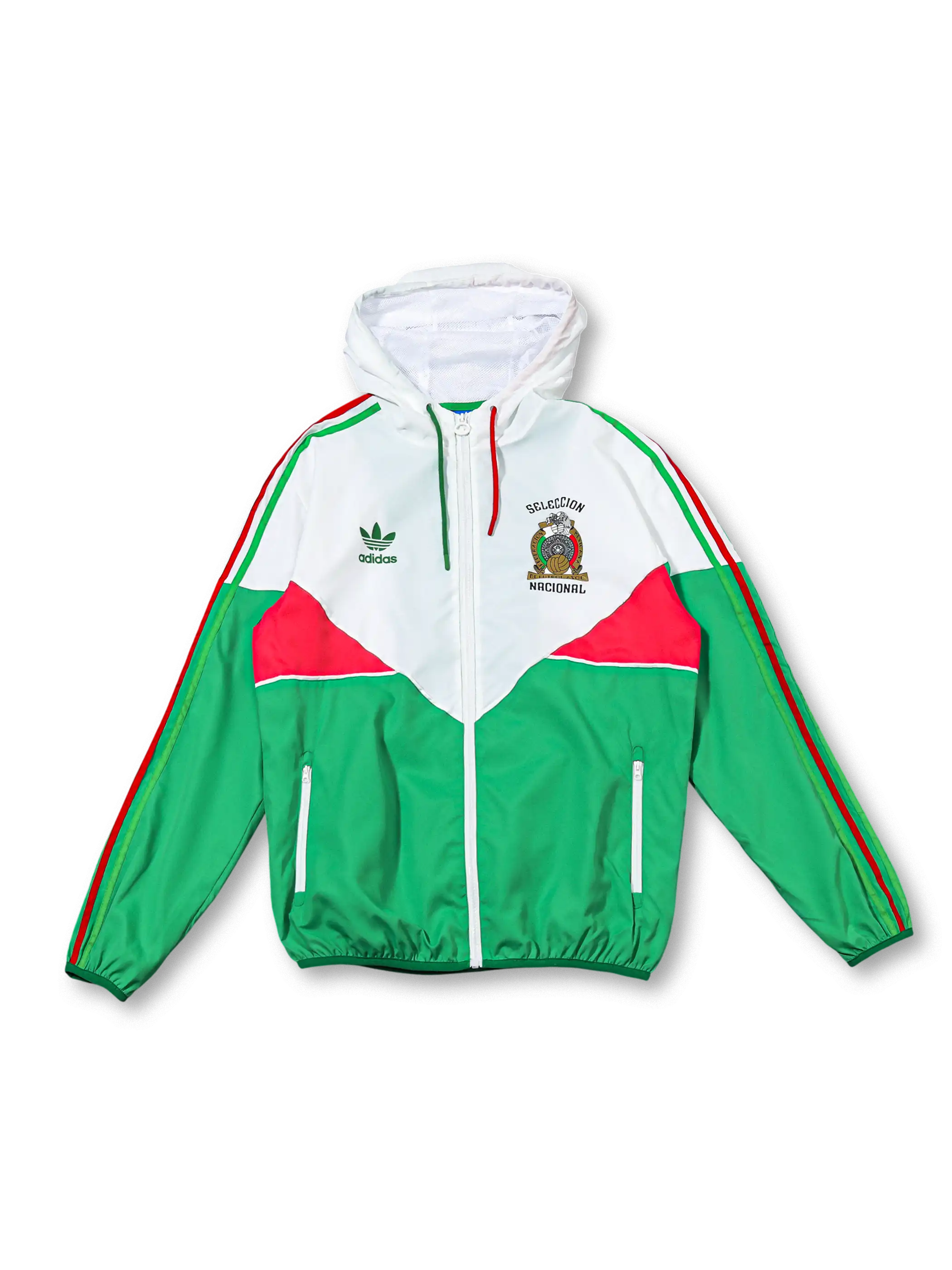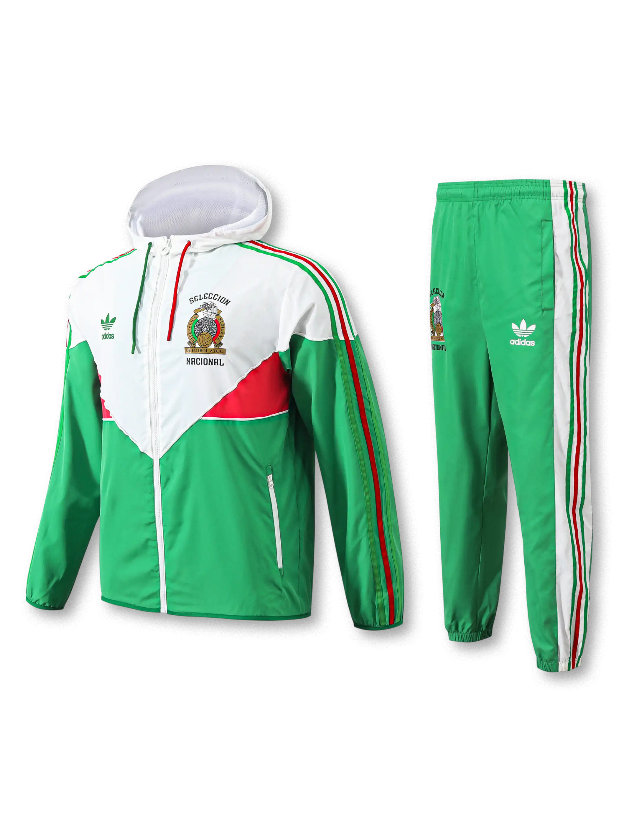 フード付きウィンドブレーカーと同色パンツを国旗色で統一し、胸元の代表エンブレムとトレフォイルロゴを左右に配置した構成で、軽量かつ通気性を確保するシェル素材を採用し、移動着や屋外トレーニングに対応する機能性を持ちながら、メキシコ代表らしい鮮やかな色彩を明確に表現する。