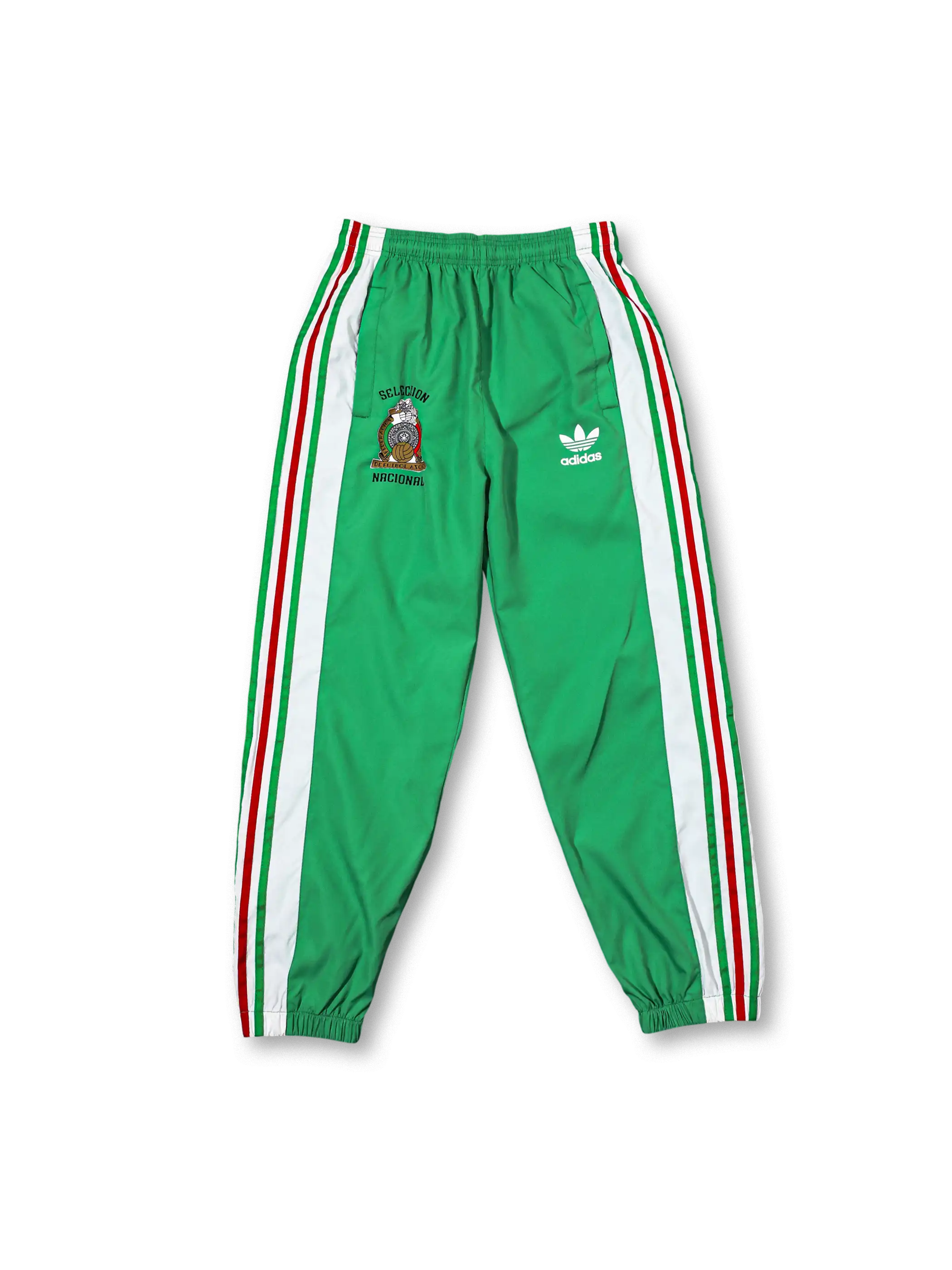 国旗色のグリーン・ホワイト・レッドを配した鮮明なトリコロール構成で、メキシコ代表エンブレムとadidasロゴを組み合わせた実用的なセットアップ。