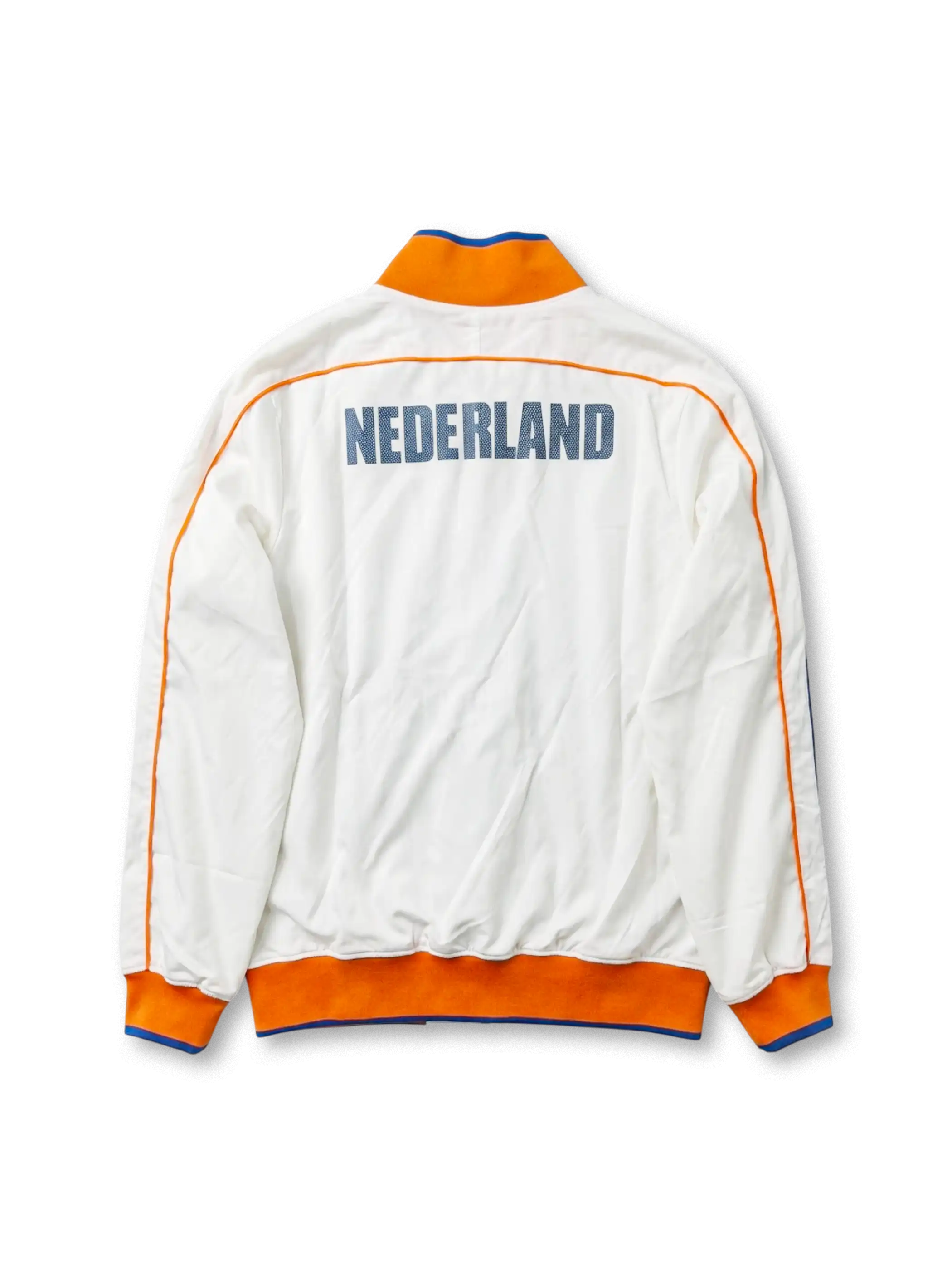 ホワイトを基調にオレンジとブルーを配した、オランダ代表らしい配色のチーム用トラックジャケット。移動着やトレーニング前後に使用されたモデル。