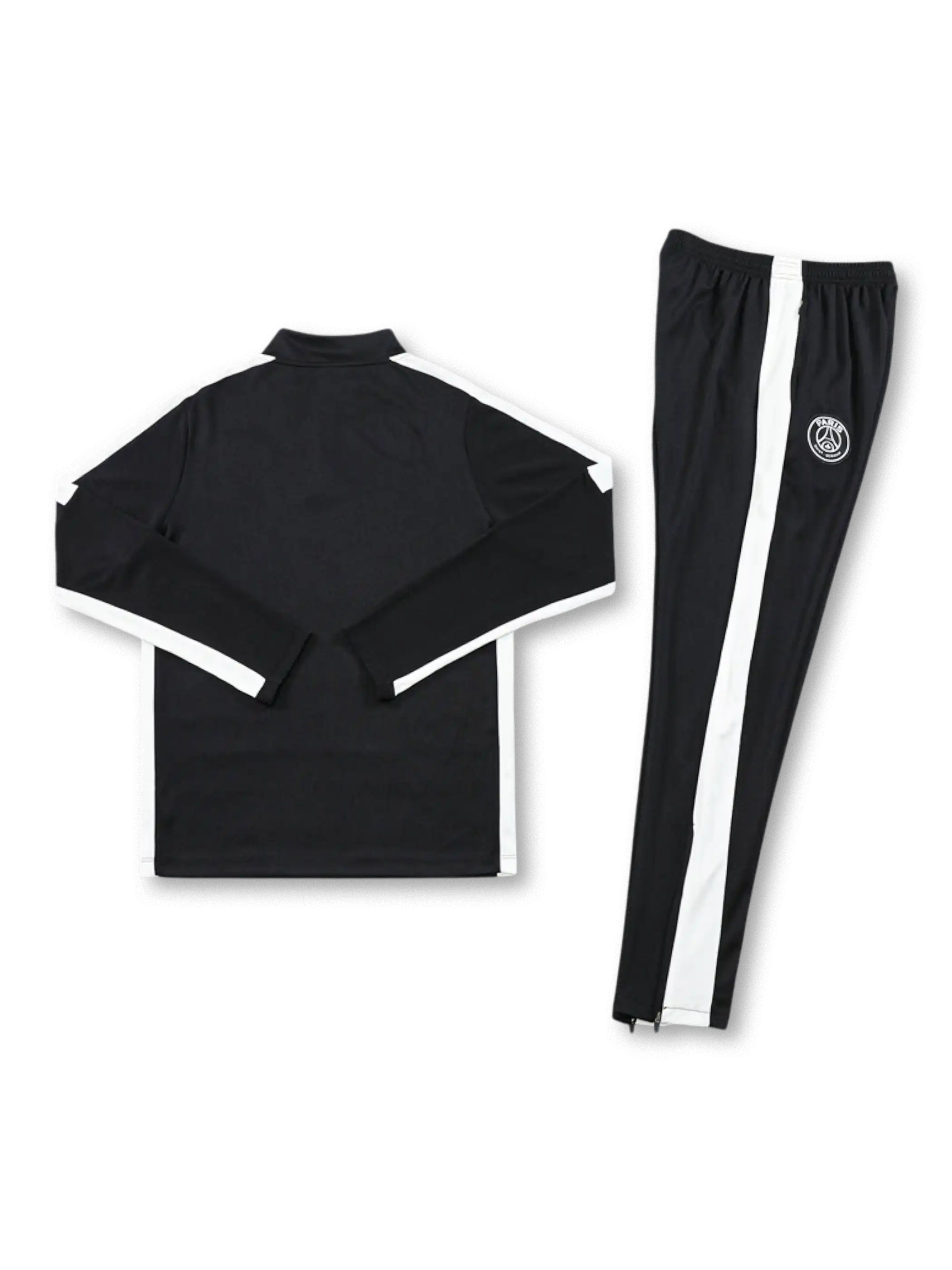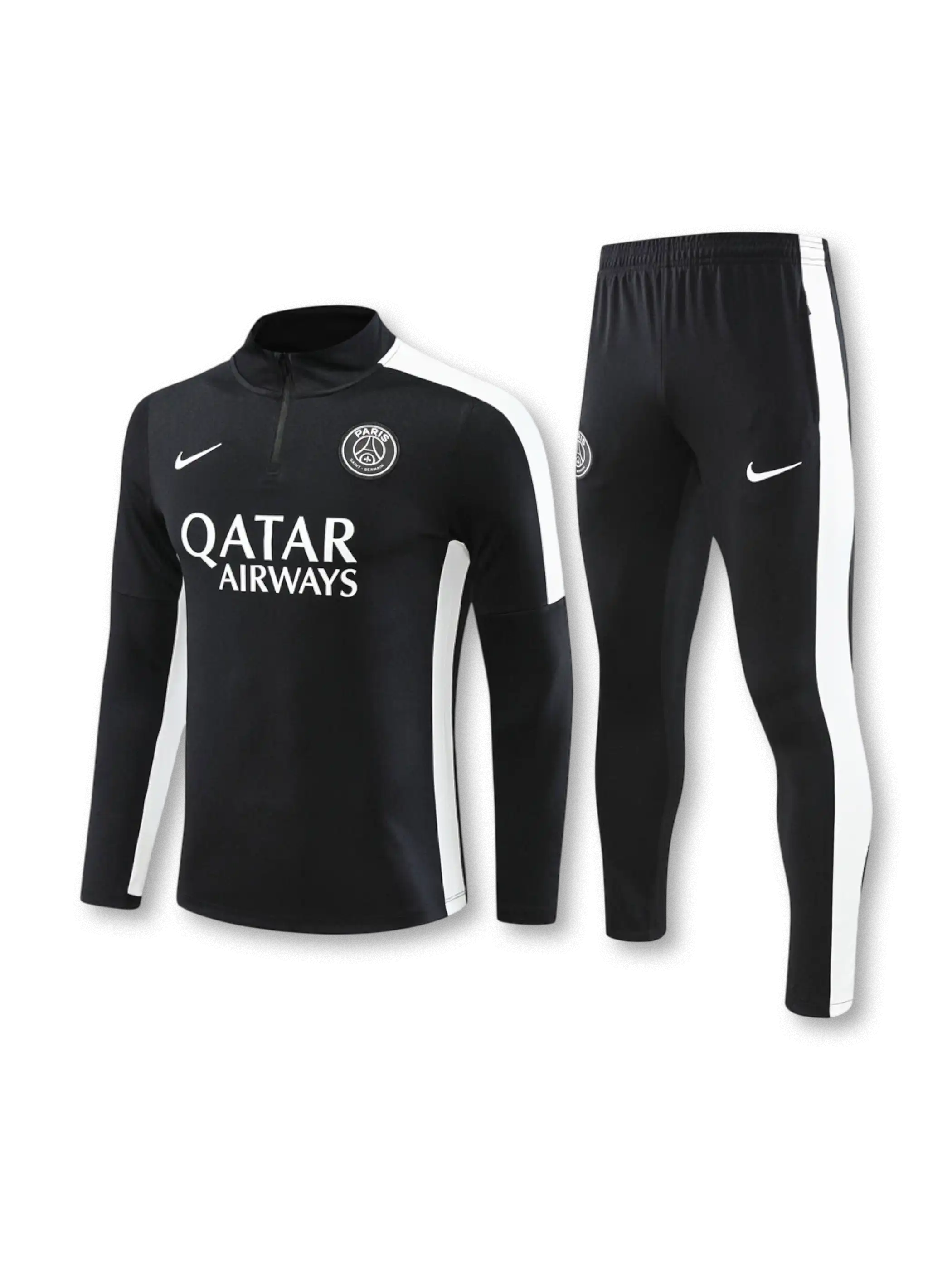 ブラック基調にホワイトの切替ラインを組み合わせた、上下統一デザインのトレーニングセット。トップはスタンドカラーのハーフジップ仕様で、胸元にクラブエンブレムとスウッシュ、フロントに「QATAR AIRWAYS」プリントを配置。パンツは縦のラインが視覚的なシャープさを作り、運動時の動きやすさを意識した構成。素材はポリエステル系を前提に、通気性と取り回しの良さを重視したセットアップとして扱える。