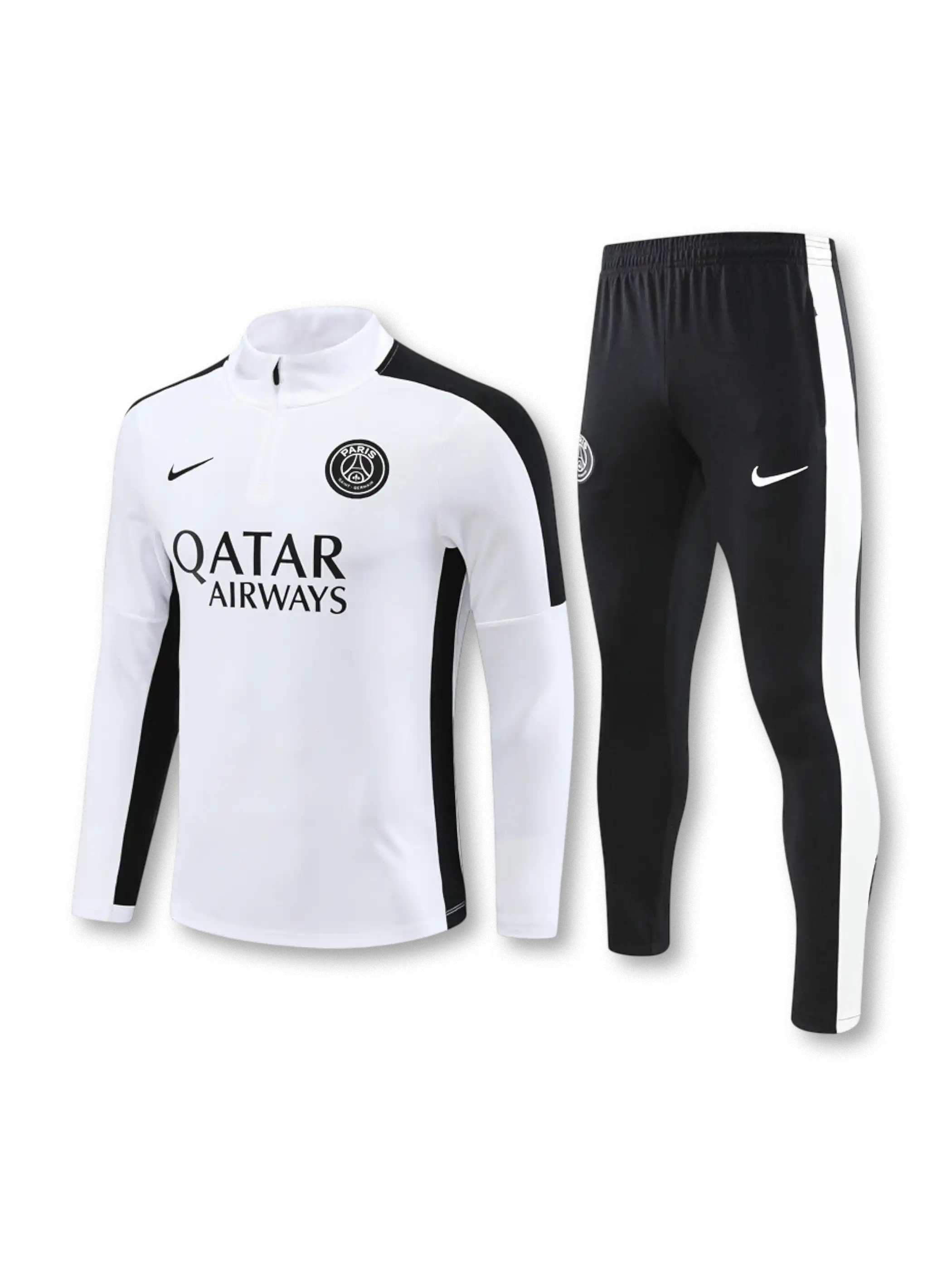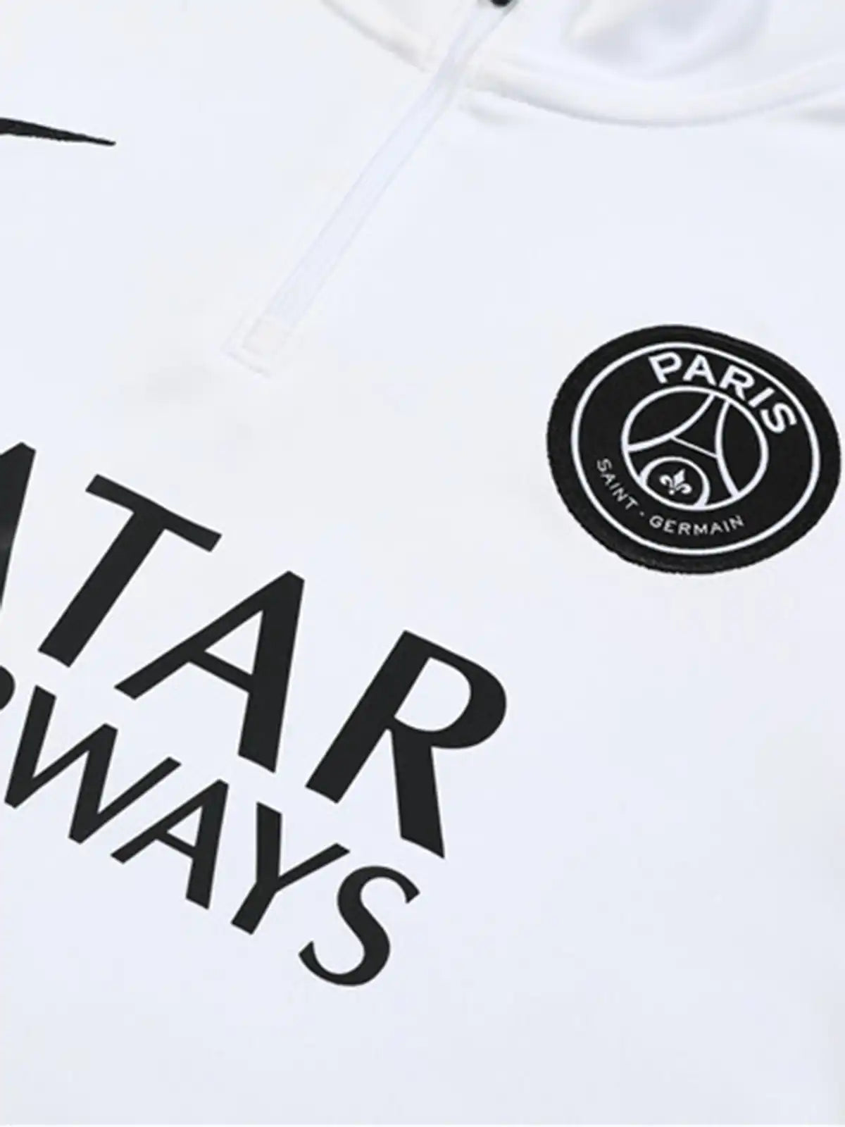 ホワイト基調のトップにブラックの切替ラインを配し、上下でコントラストを揃えたトレーニングセット。トップはスタンドカラーのハーフジップ仕様で、胸元にクラブエンブレムとスウッシュ、フロントに「QATAR AIRWAYS」プリントを配置。パンツは縦ラインでシルエットを引き締め、動作時の可動域を意識した設計で、ポリエステル素材ベースの扱いやすさと通気性を前提に運用できる。