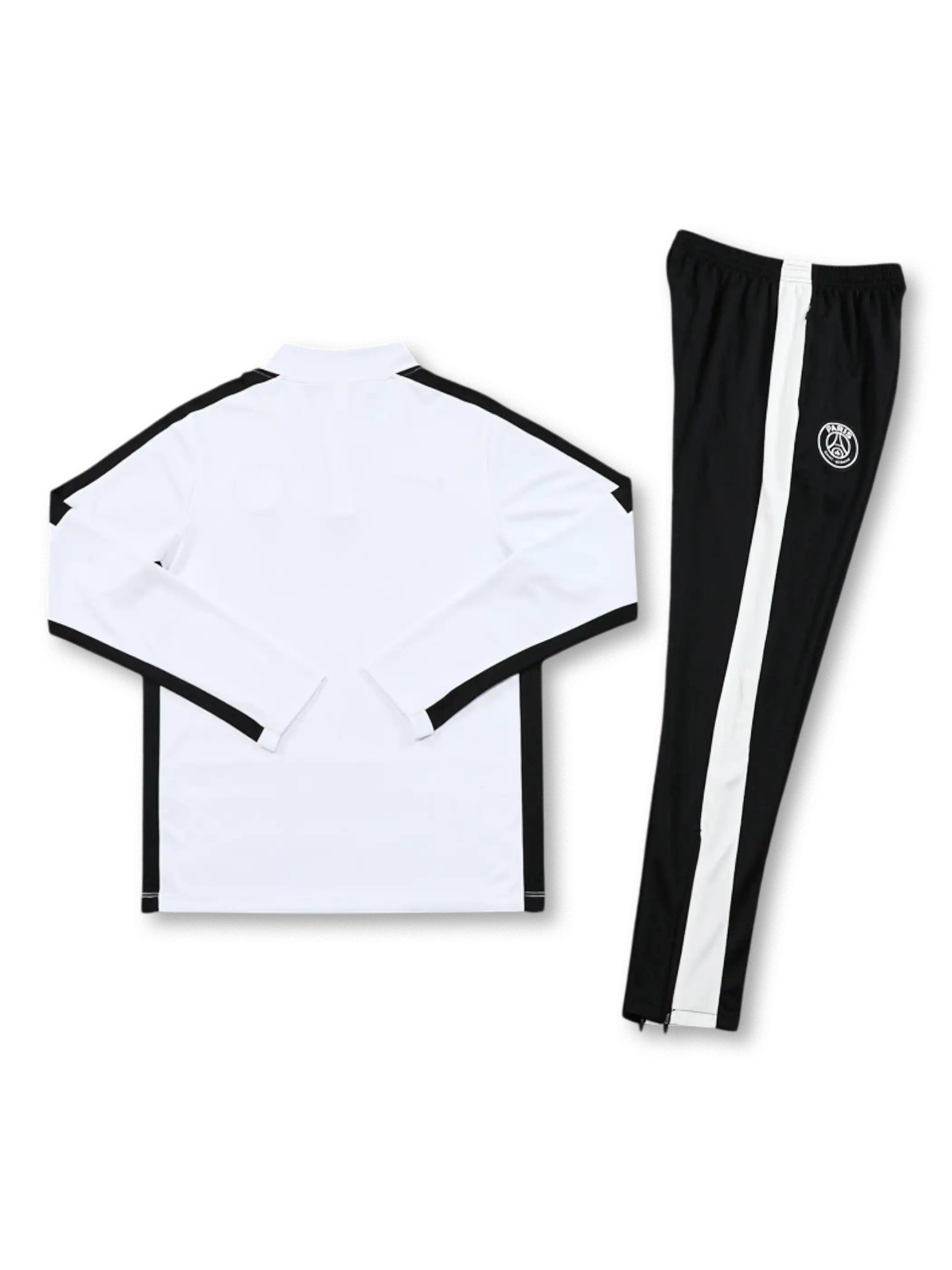 PSGのホワイト基調ハーフジップトップとパンツを揃えたトレーニングセット。
