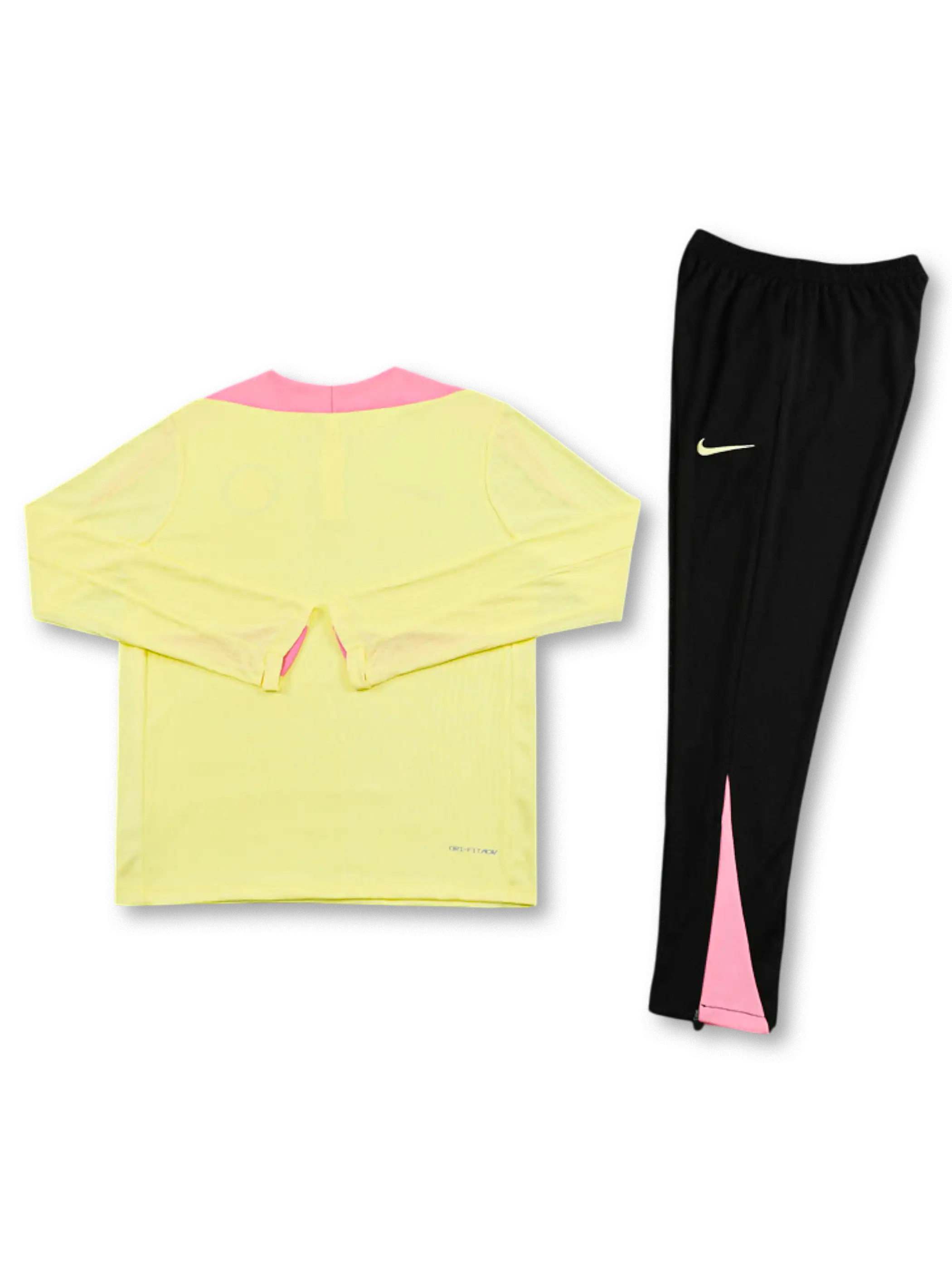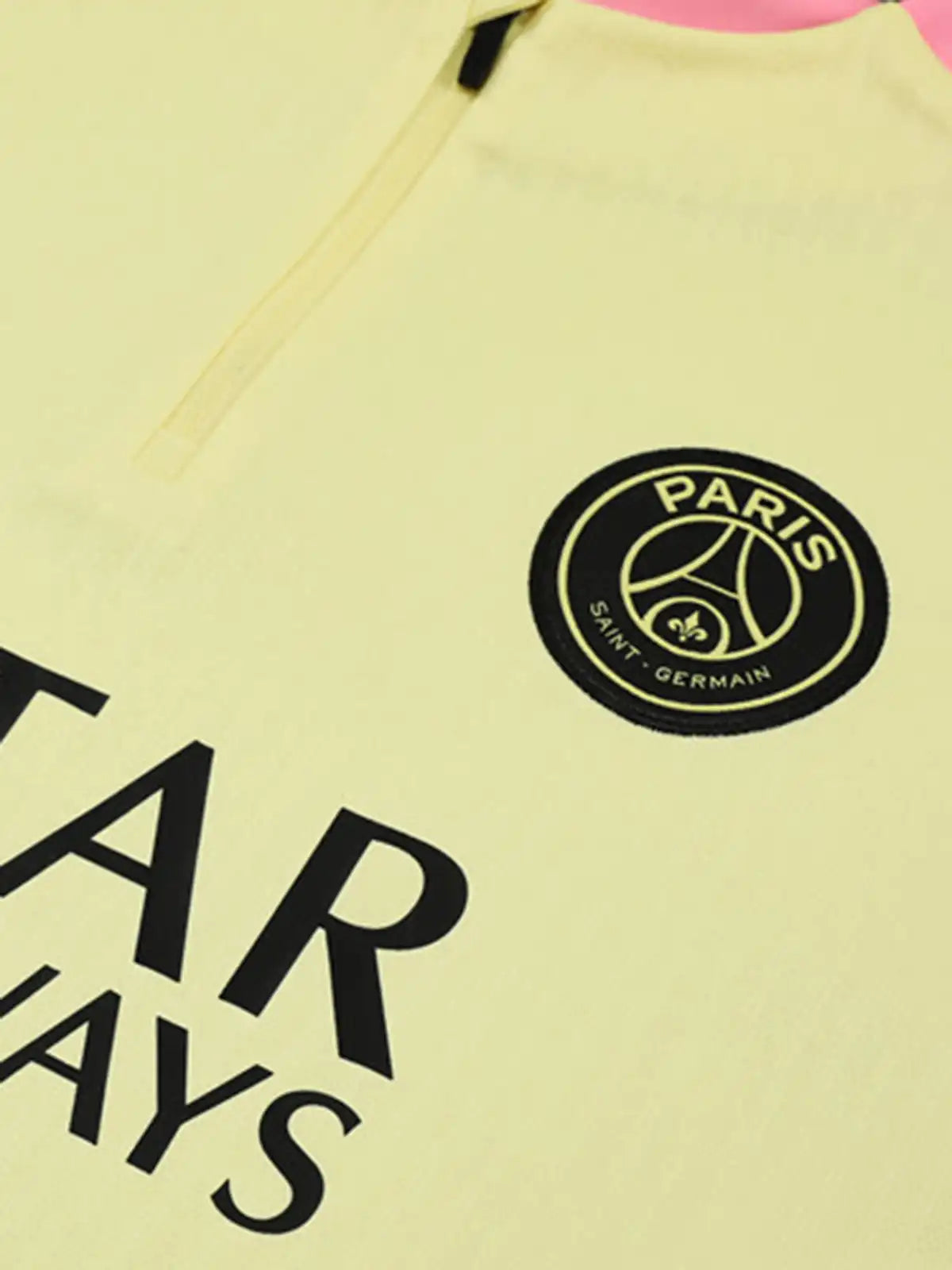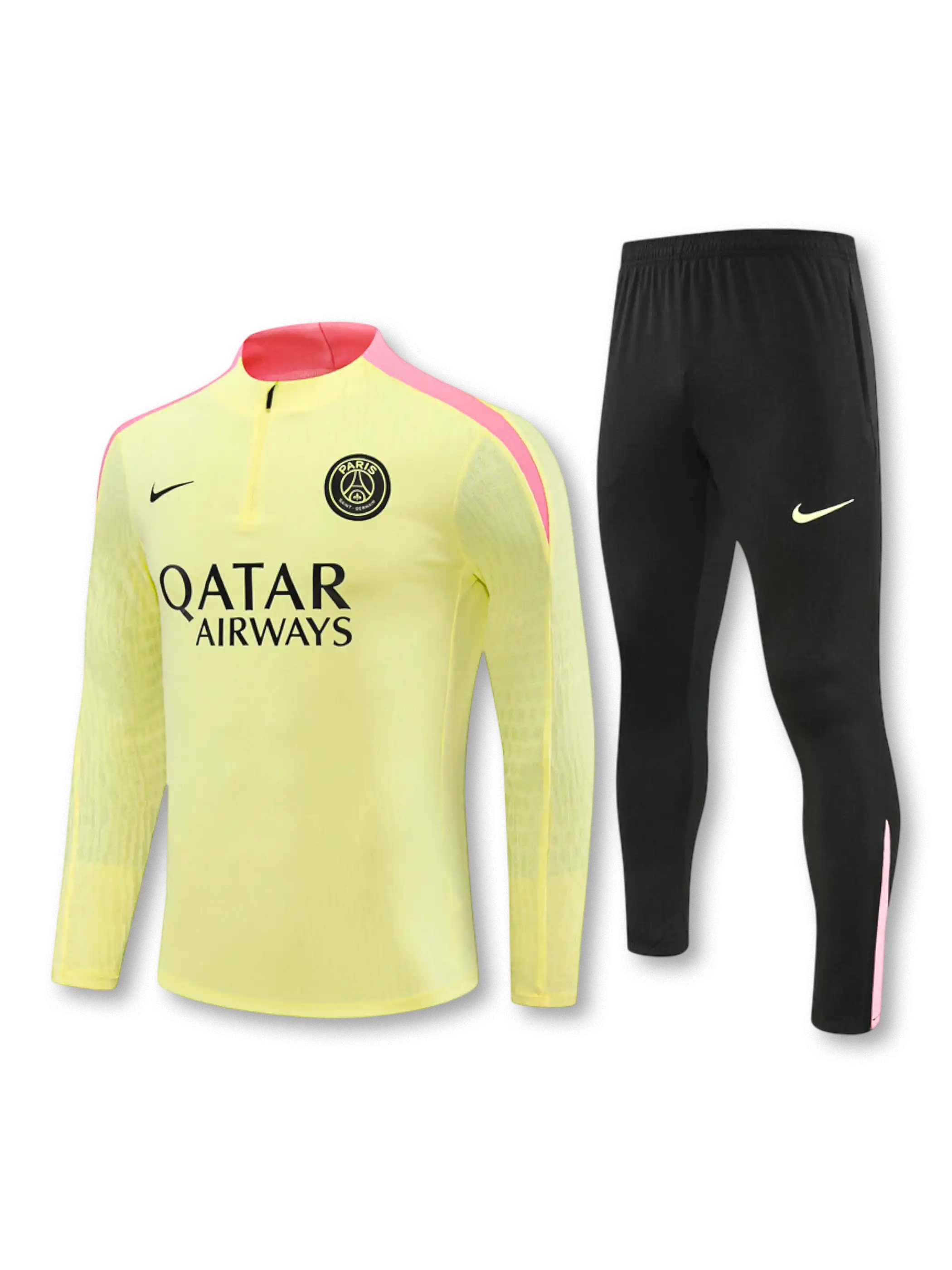 ペールイエローのボディにピンクの切替パネルを肩〜脇に配し、胸元のクラブエンブレムとスウッシュ、フロントのQatar Airways表記で要素を整理したデザイン。トップはスタンドカラーのハーフジップ仕様で着用調整がしやすく、リブ状テクスチャが単色でも表情を作る。パンツはブラック基調にエンブレム配置と裾側のピンク差し色を入れ、上下で統一感を出した構成。素材はポリエステル系を前提に、通気性と扱いやすさを意識したセットアップ。