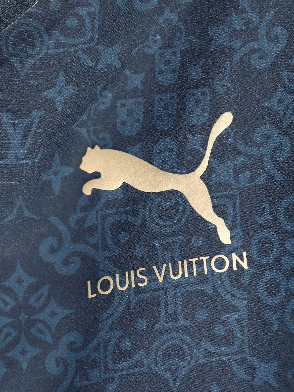 ネイビーベースにLVモノグラム×装飾花柄の全面トーン・オン・トーンジャカード、ゴールドPumaキャット・LOUIS VUTTONテキスト・FPFエンブレム、ゴールドパイピング袖口を配したコラボ限定モデル。