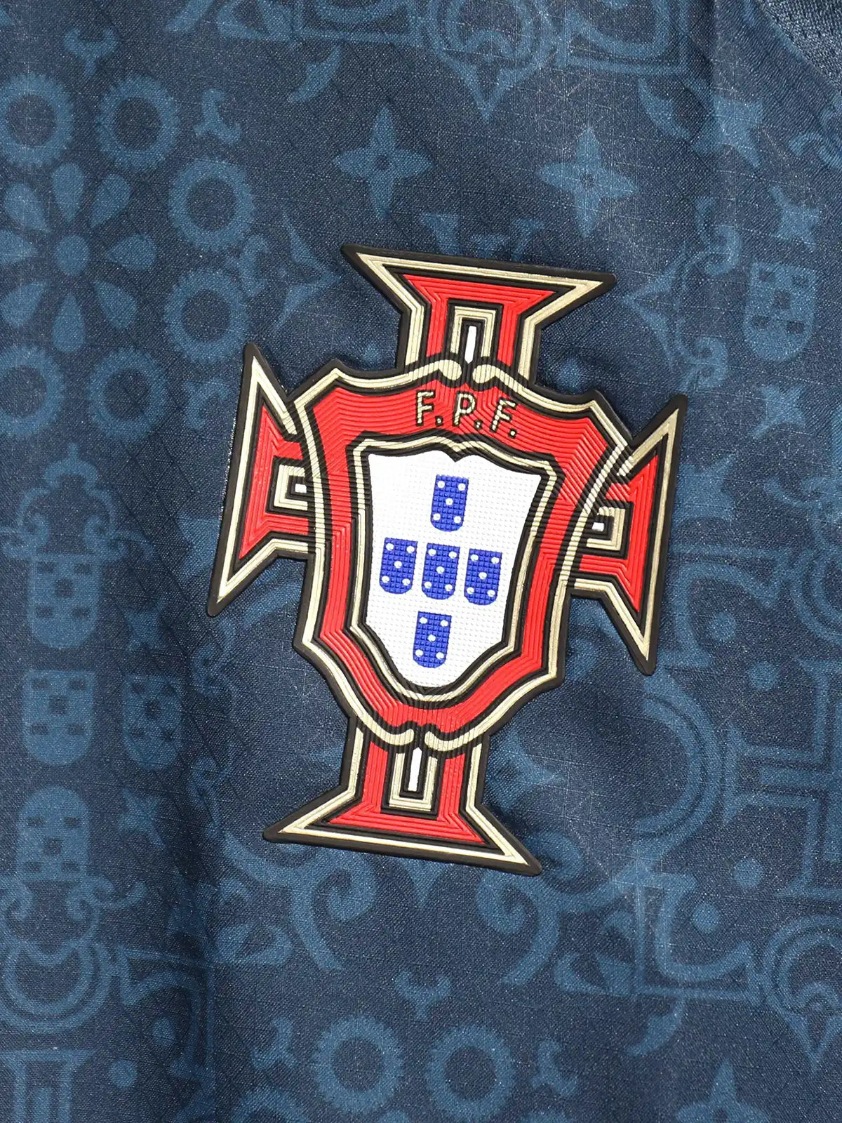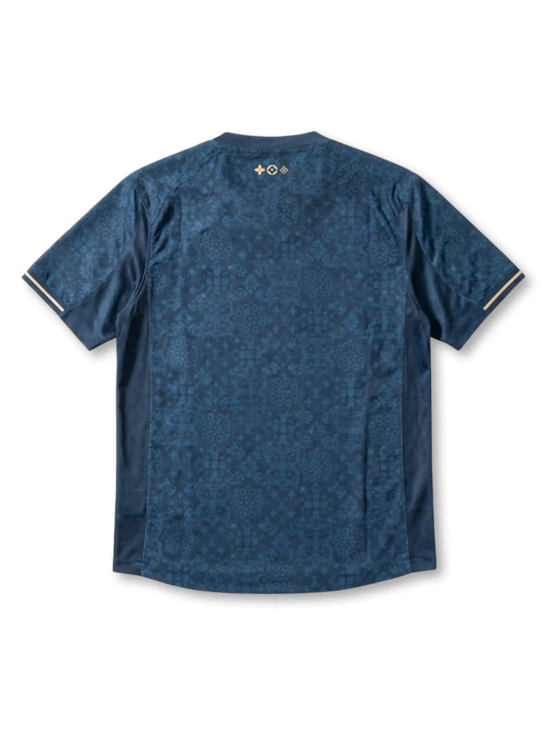 背面はネイビー総柄ジャカード構成・ネームなし仕様。カラー背面にLVモノグラムフラワー+菱形のコラボシンボルマーク(ゴールド)を配置。カラー内側にPumaタグを装着。Puma・Louis Vuitton・ポルトガル代表FPFの三者コラボレーション限定エディション。