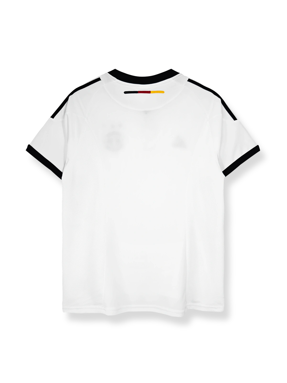 2002年日韓ワールドカップで準優勝を果たしたドイツ代表が着用したホームユニフォームは、シンプルな白基調に黒のアクセントを施したミニマルデザインで、ゲルマン魂を象徴する一着。