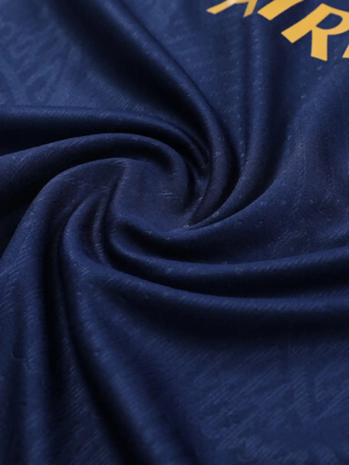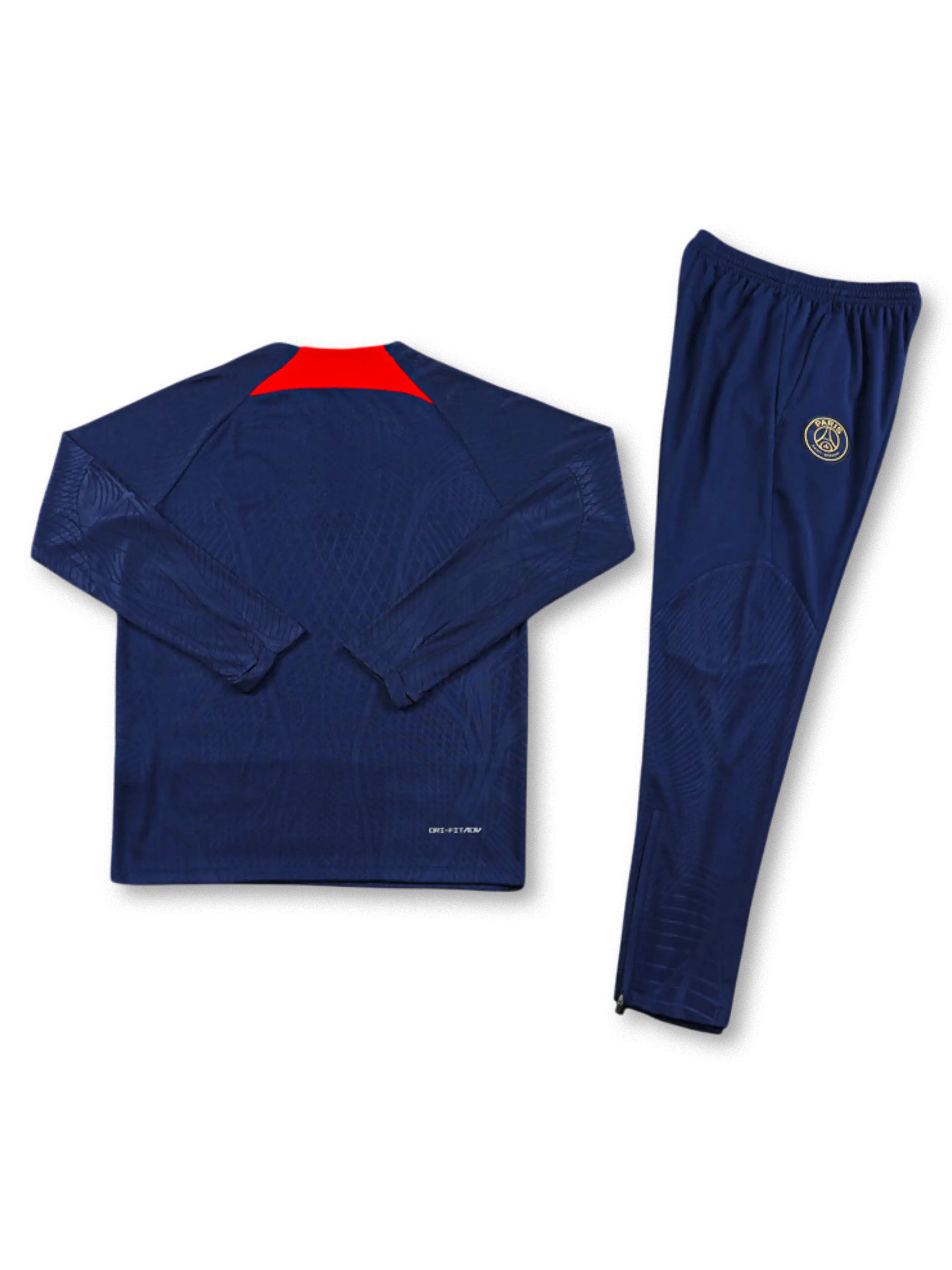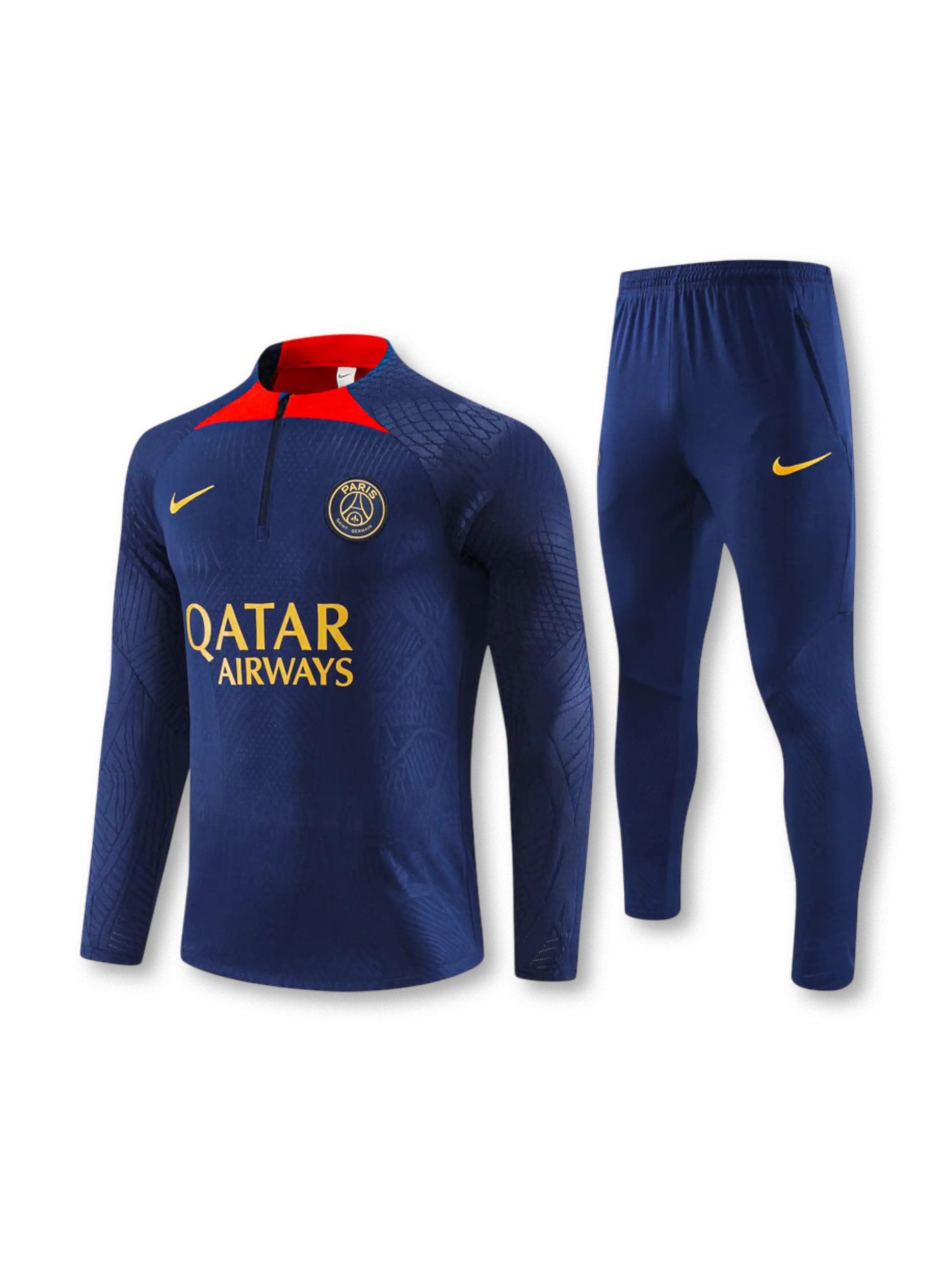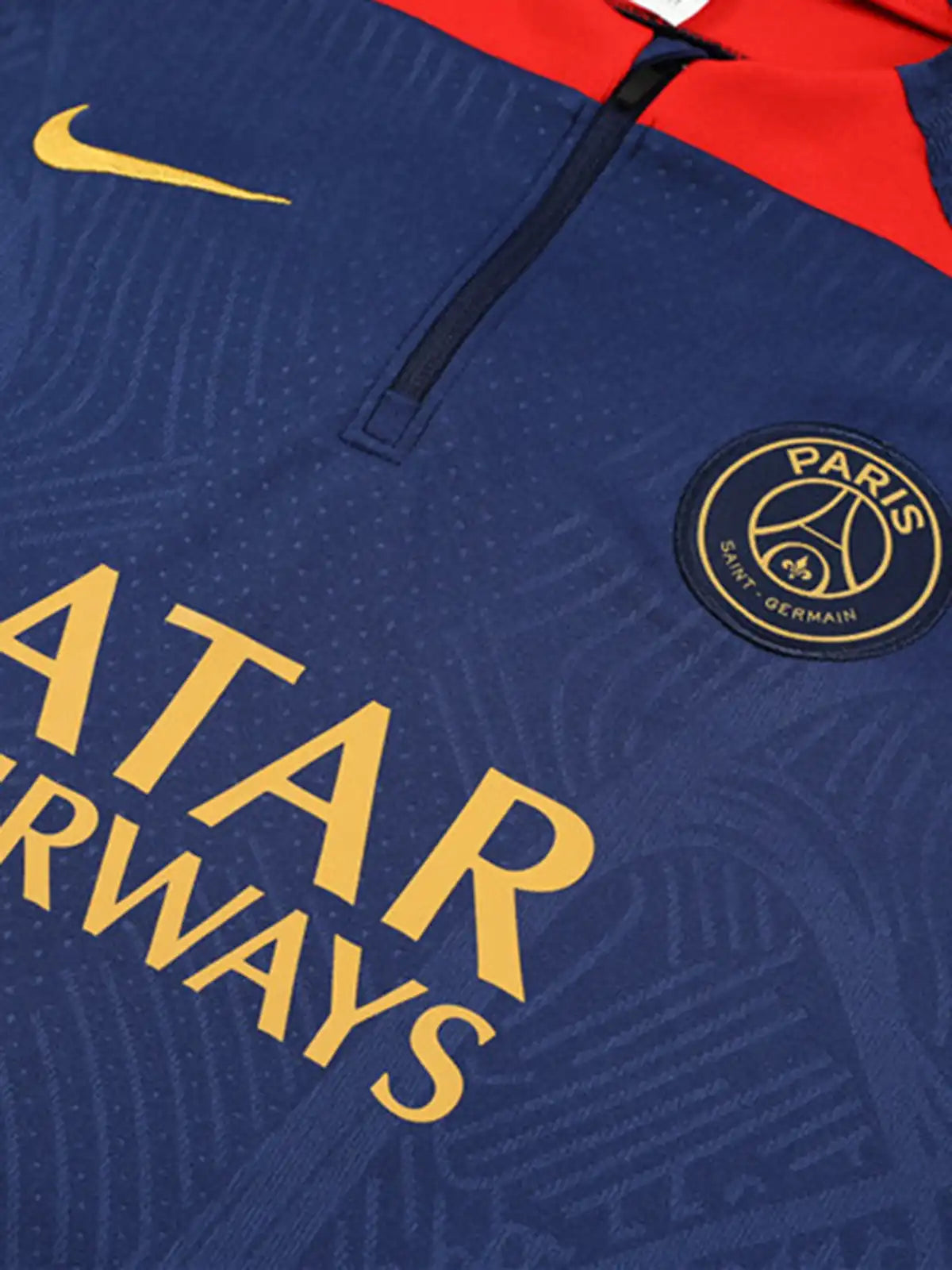 トップはネイビーベースに同系色の総柄テクスチャを施し、胸部にクラブエンブレムとNikeスウッシュ、スポンサー「QATAR AIRWAYS」をゴールドで配置。襟元はハーフジップ仕様で温度調整がしやすく、赤のアクセントパネルが首周りの識別点となる。パンツはネイビー基調に膝周りの立体パターンを備え、上下で統一感のある選手仕様トレーニングセットとして成立している。