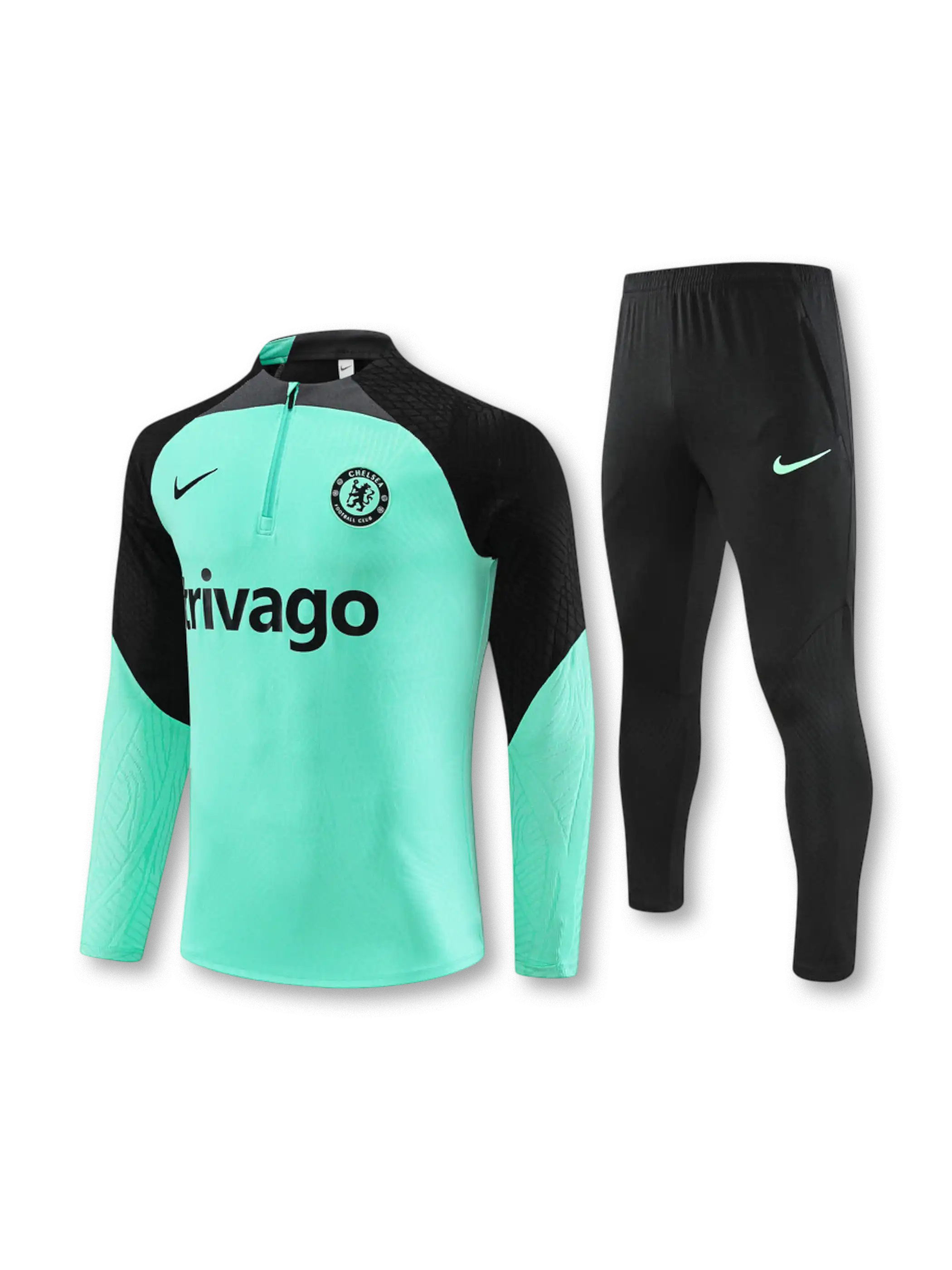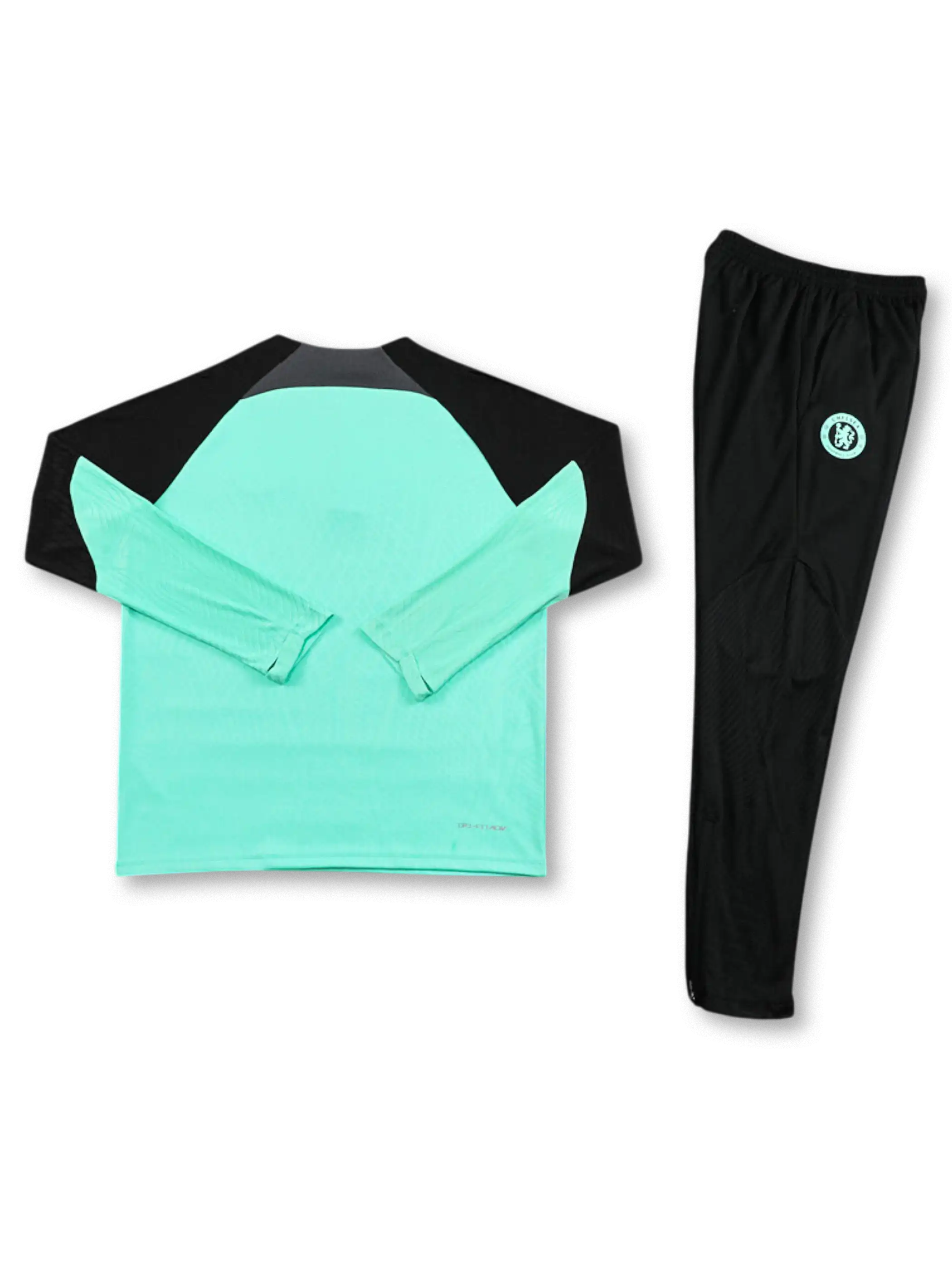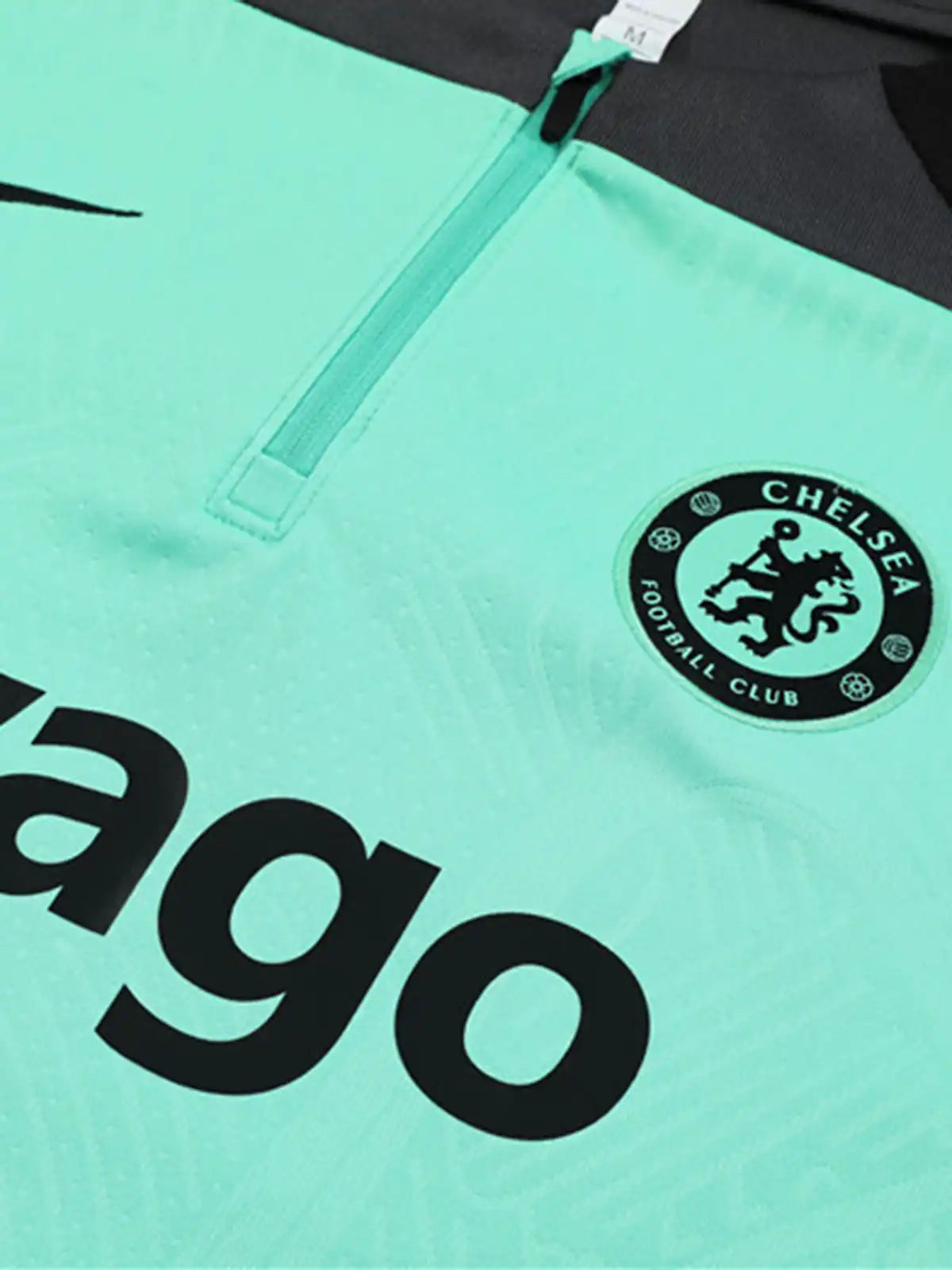 ミントグリーンの身頃にブラックスリーブを切り替え、胸元のクラブエンブレムとブランドロゴ、フロントの「Emirates Fly Better」プリントで要素を整理したデザイン。トップはスタンドカラーのジップ仕様で着用調整がしやすく、袖口のラインが配色アクセントとなる。パンツはブラック基調にエンブレム配置とスリーストライプスを組み合わせ、上下で統一感を作る。素材はポリエステル系を前提に、通気性と扱いやすさを意識した構成。