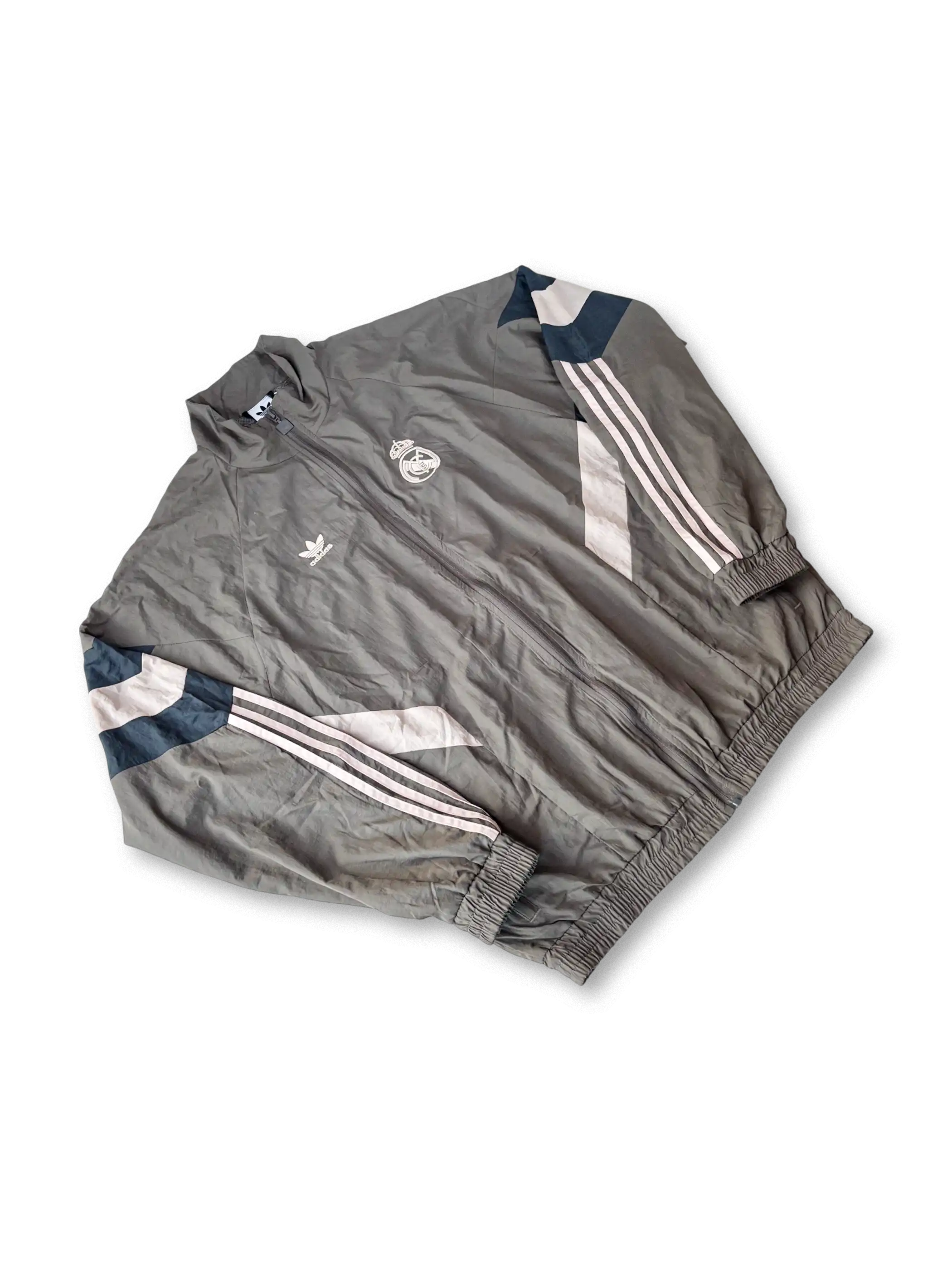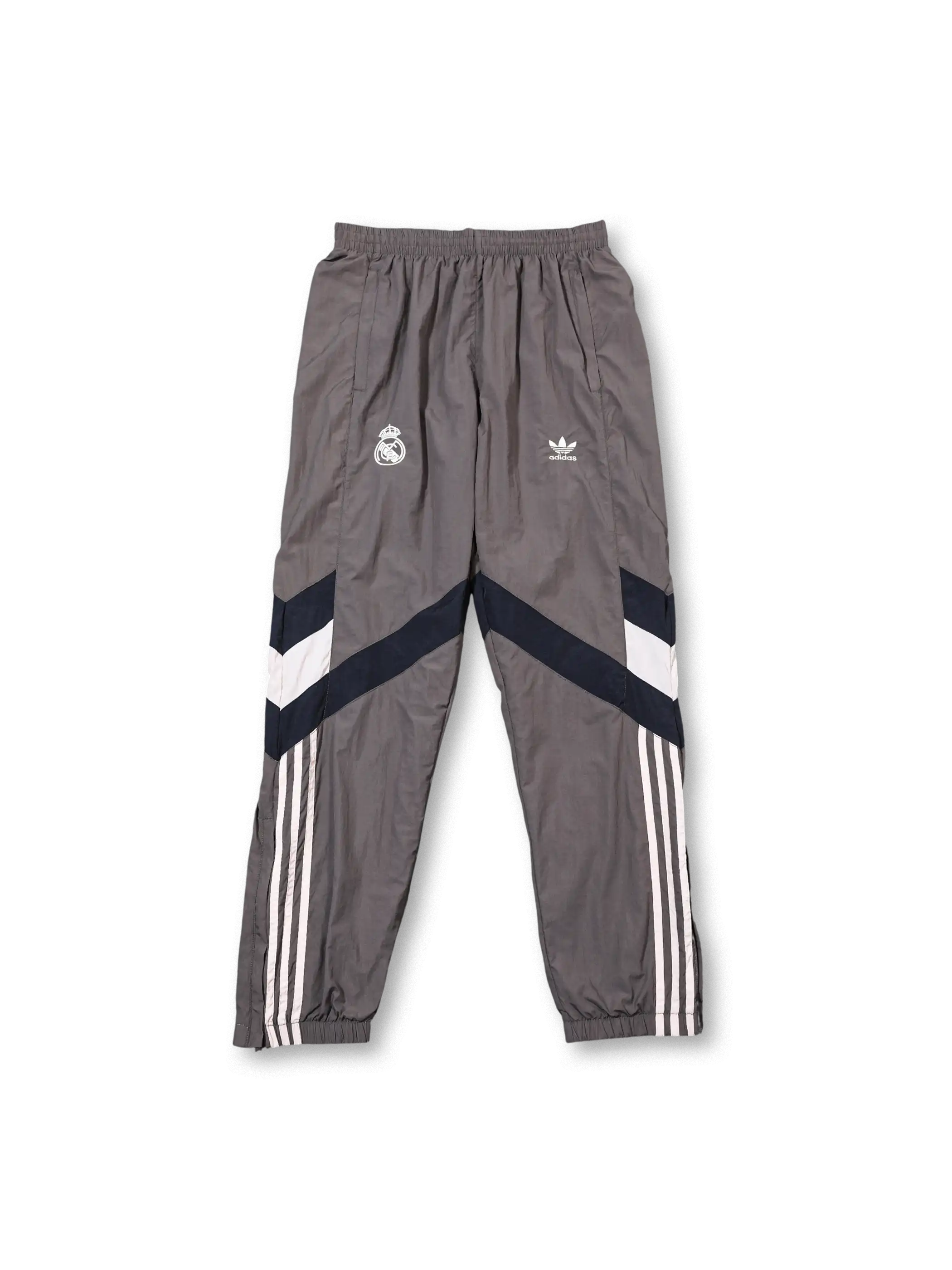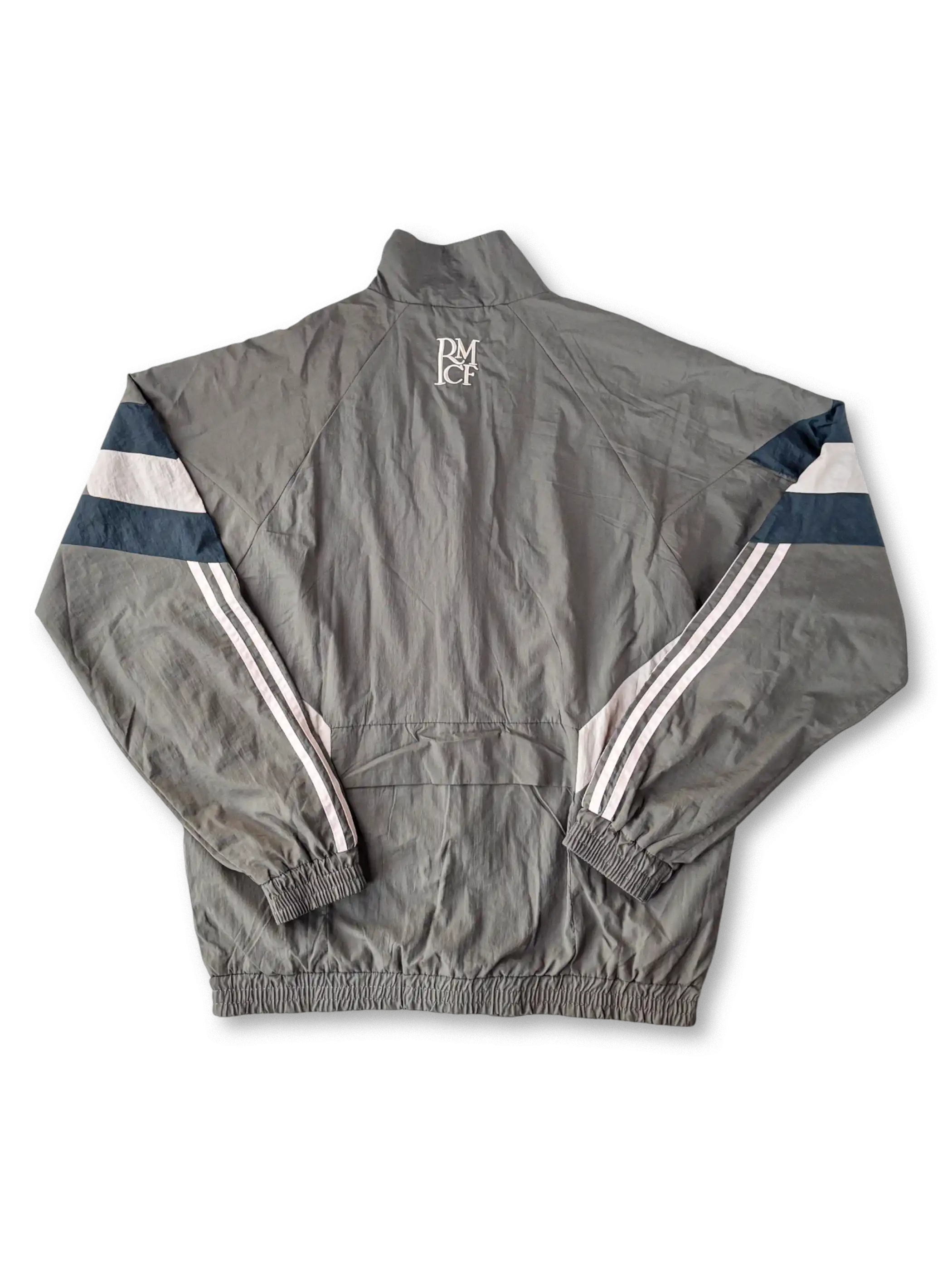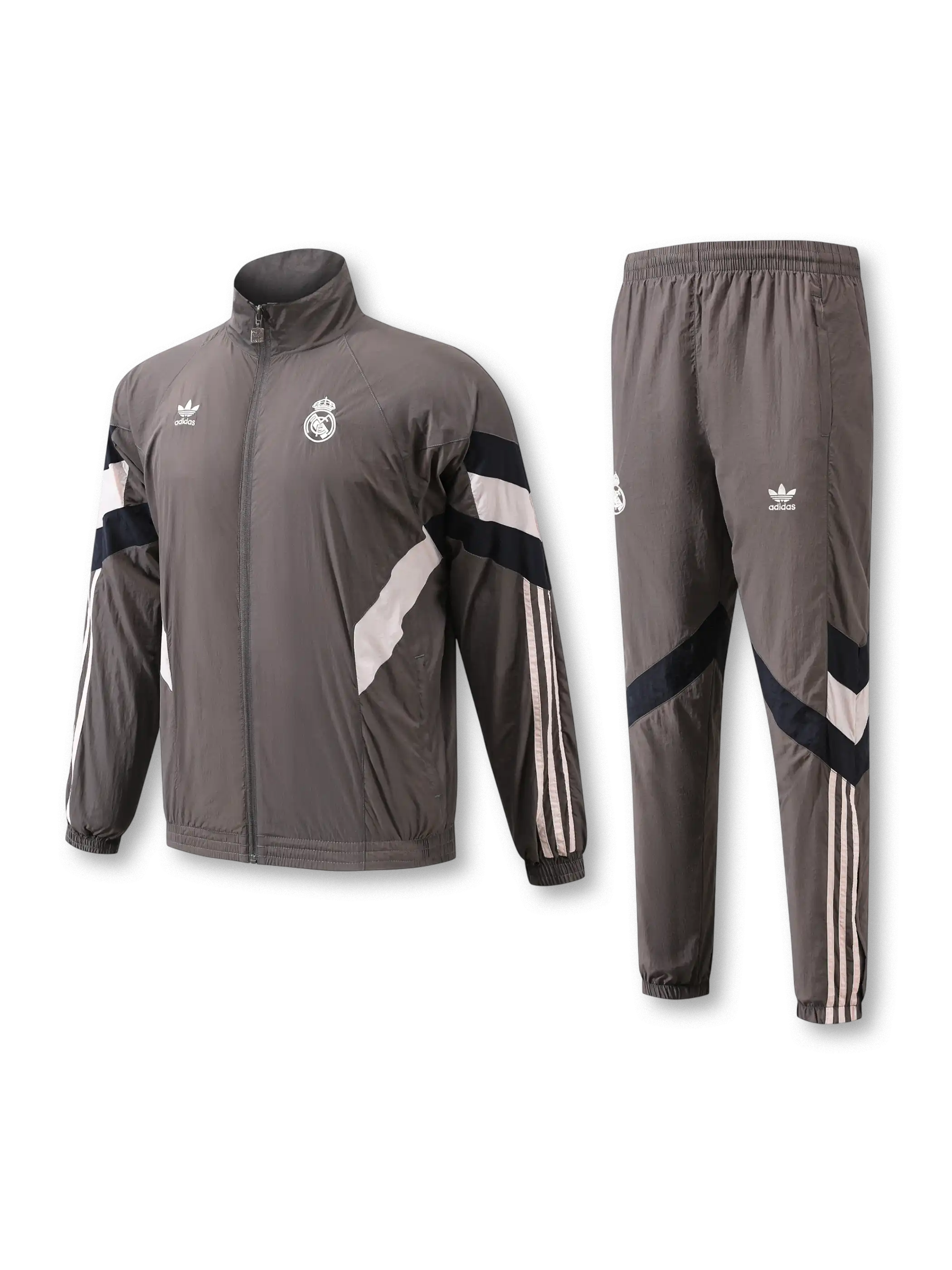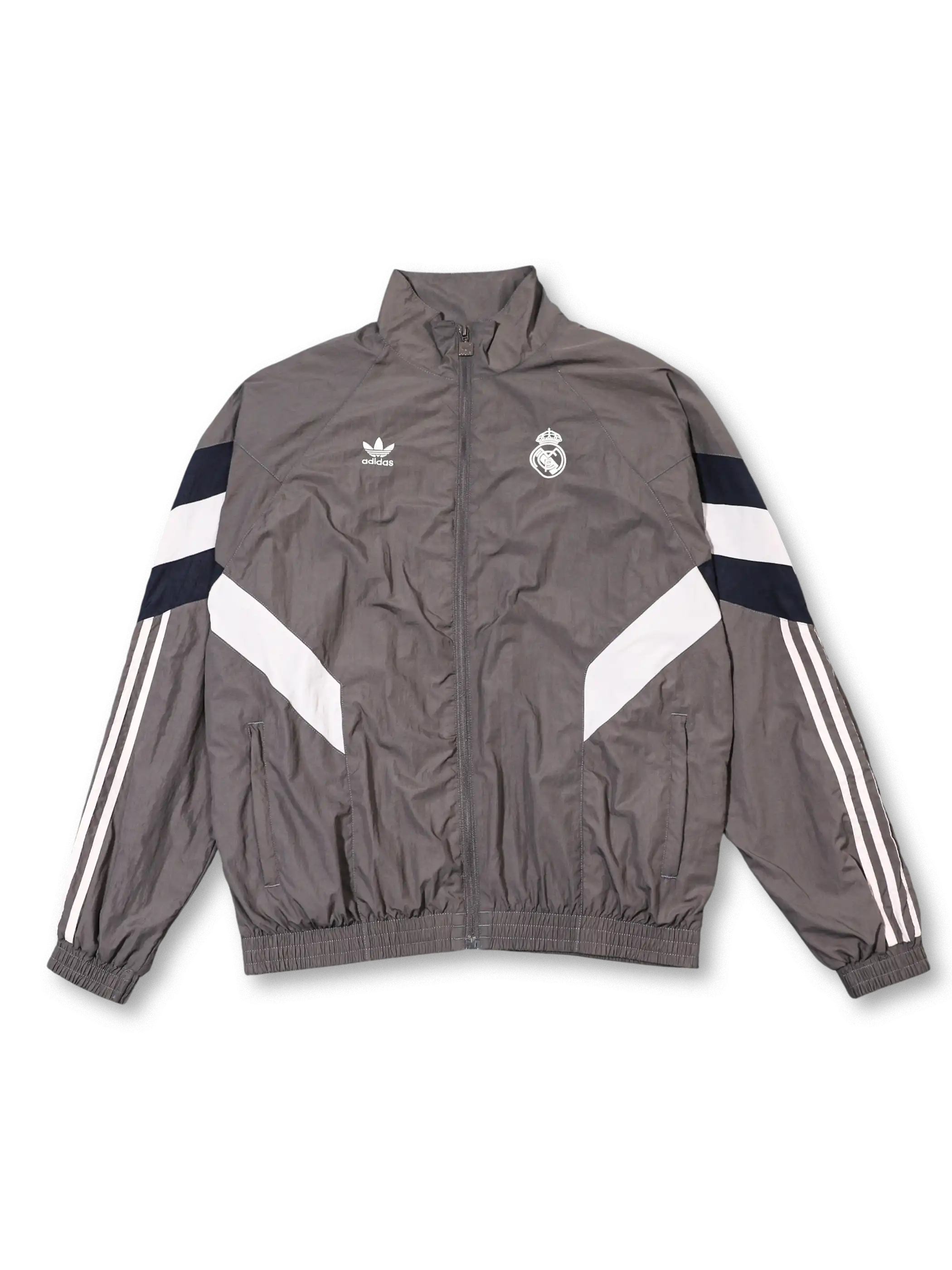 グレートーンにホワイトとネイビーの切替を施した、レアル・マドリードの90年代風レトロトラックスーツ。
