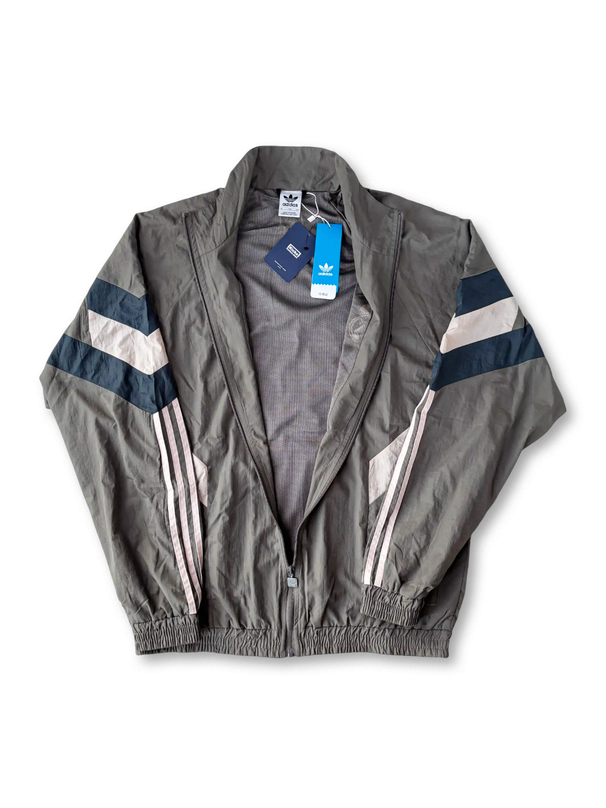シックなグレーを基調にホワイトとネイビーのシャープな切替ラインを組み合わせ、三つ葉ロゴとクラブ章がクラシックな存在感を演出する。軽量ウーブン素材による快適な着用感と、象徴的な3ストライプがスポーティーなアクセントとなり、トレーニングからタウンユースまで幅広く対応するバランスの良いレトロアイテムに仕上がっている。