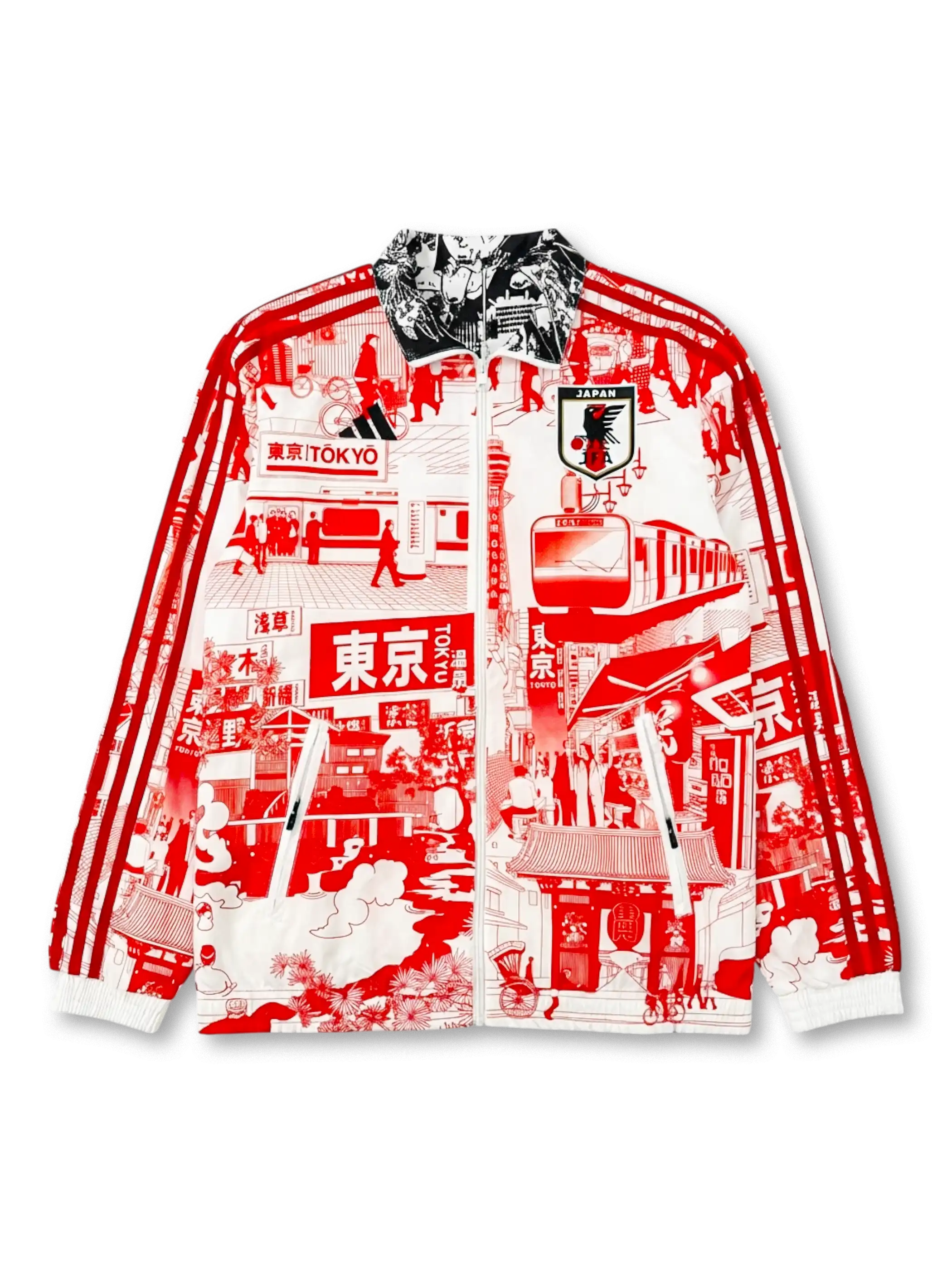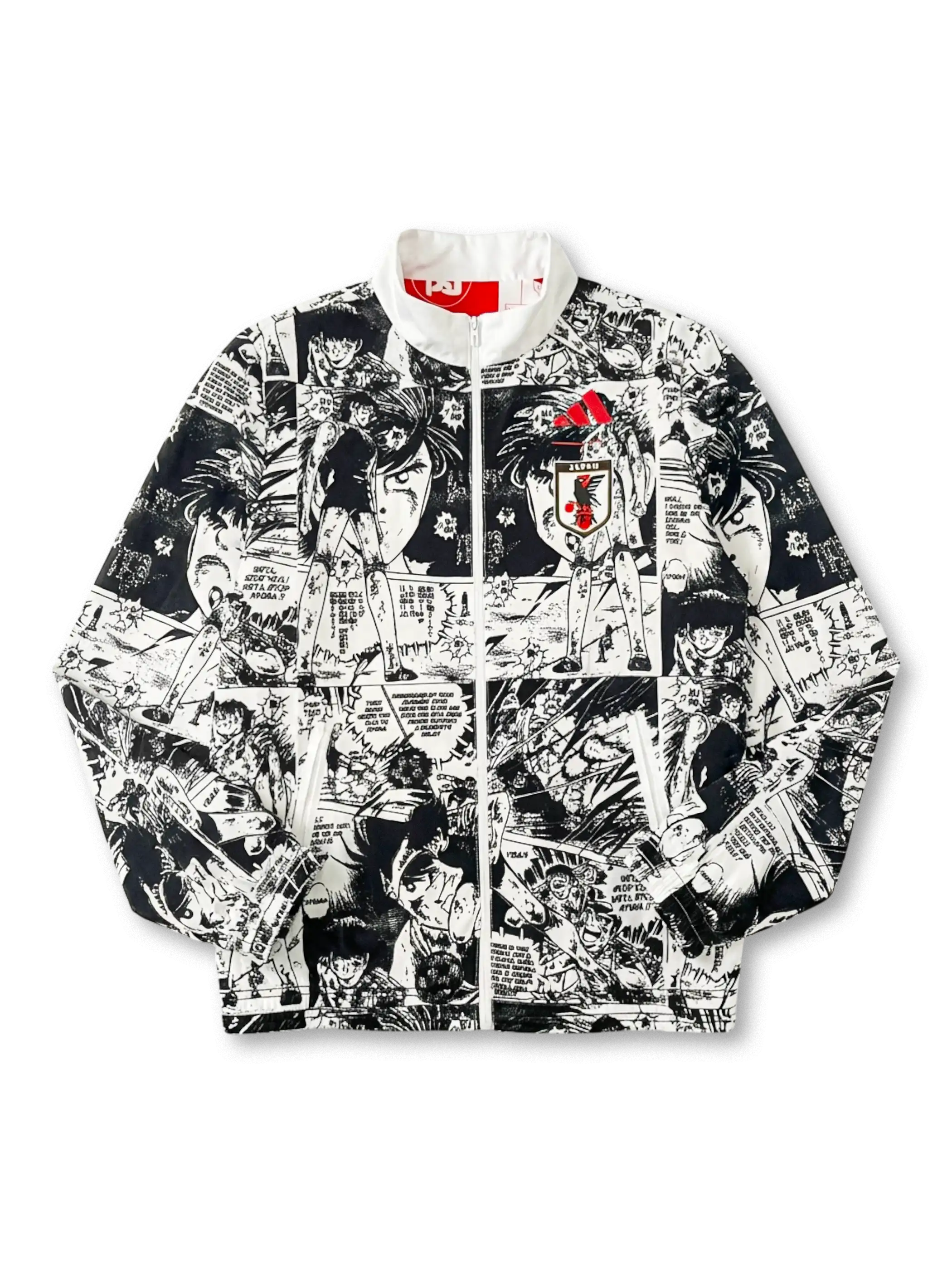 赤白面は浅草や雷門、電車、街路風景など東京の象徴を線画で描き、黒白面は漫画パネルを全面に配置した高密度グラフィックが特徴で、軽量素材とリバーシブル構造により二つの表情を持つ実用性を備える。肩のスリーストライプスや日本代表エンブレムがアクセントとなり、タウンユースでも存在感のある復刻デザインとして再構築された一着。
