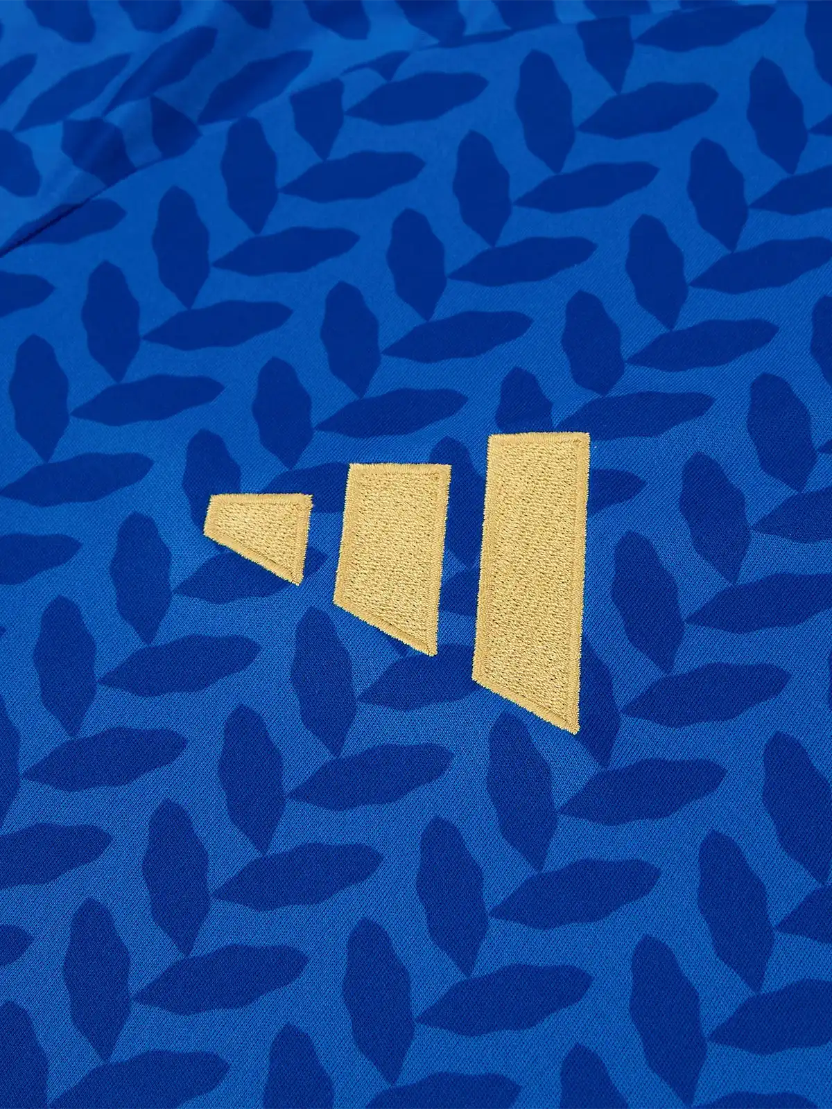 イタリア代表を象徴するアッズーリブルーを基調に、全体へリーフ調の織り柄を施した特徴的なデザイン。肩にはゴールドのスリーストライプスを配置し、カラーリングのコントラストが上質感を演出。軽量ポリエステル素材を採用し、通気性と快適性に優れたスタンダード仕様のホームユニフォームとして仕上げられている。