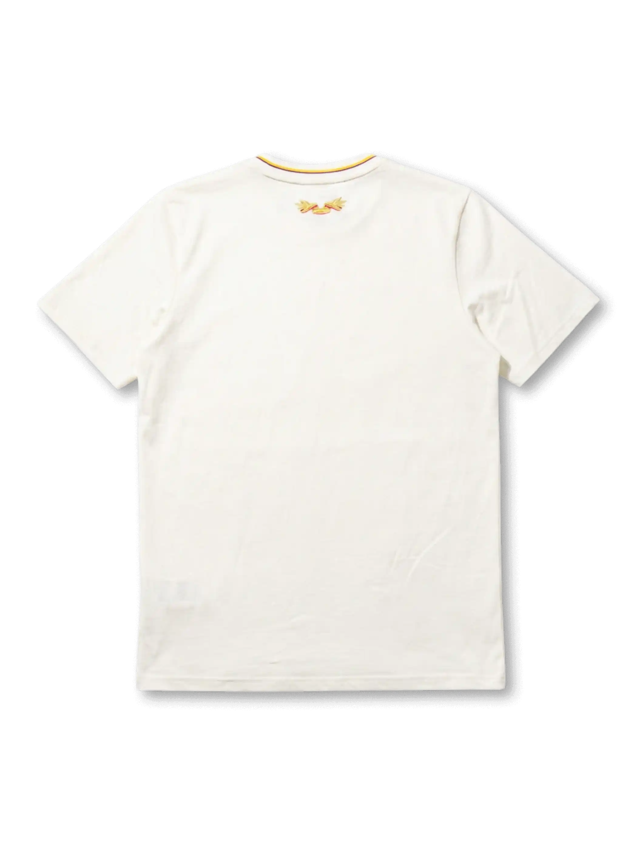 ベースカラーはクリームホワイト(オフホワイト)。クルーネック型カラーはイエロー×ブルー×レッドのトリコロールリブ仕様で、コロンビア国旗のカラーを正確に再現したトリプルストライプトリムが施されている。背面カラー部にはゴールドの双翼モチーフ装飾ラベルを配置。袖はノーライン仕様でシンプルに構成されている。