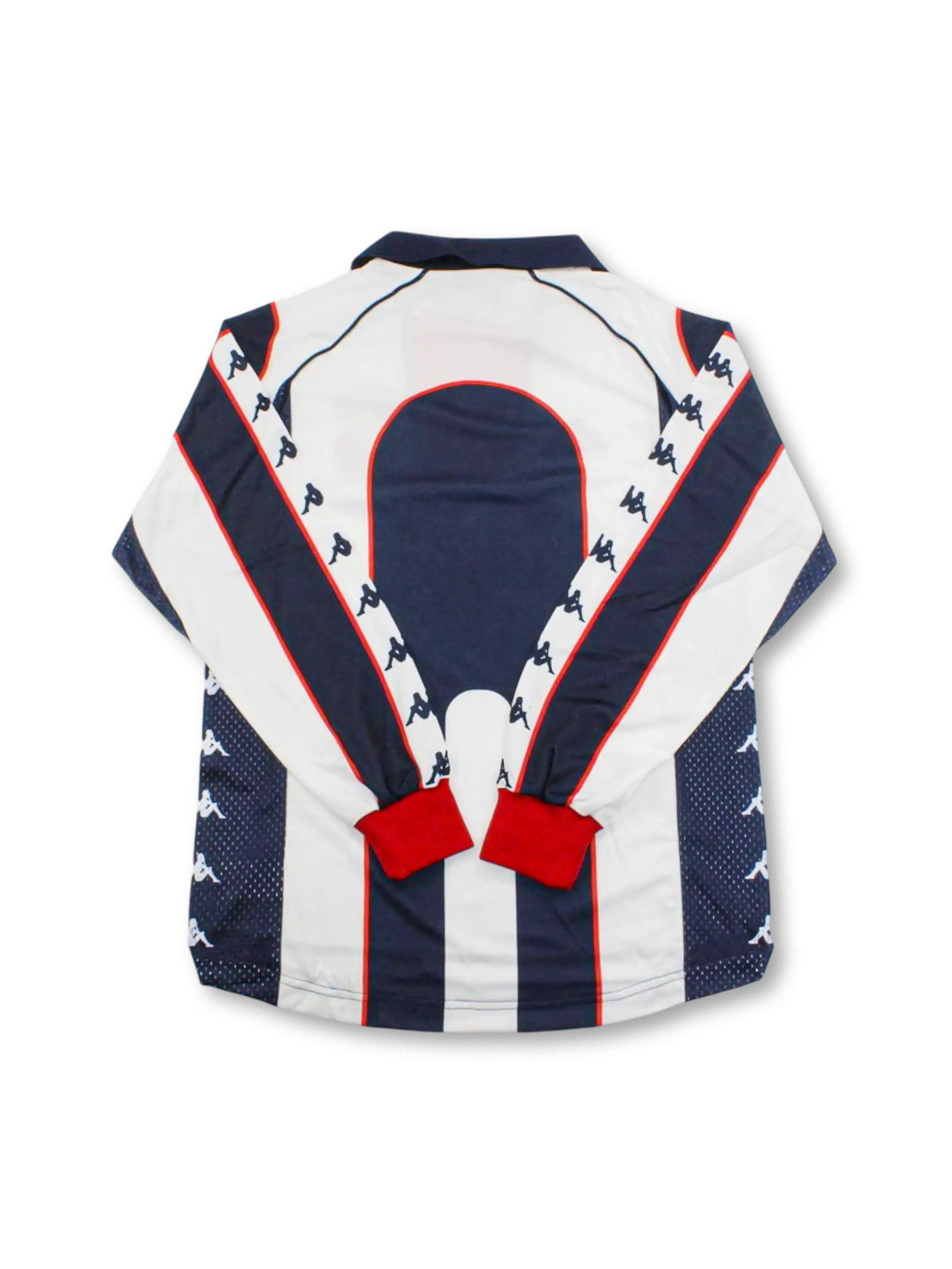 ホワイトを基調にネイビーとレッドを配した鮮やかなコントラスト。サイドには通気性を高めるメッシュ素材を採用し、Kappaロゴテープが袖と裾を彩るデザイン。胸中央には「PILS」スポンサーが存在感を放ち、当時のバルカンサッカーの熱気を象徴するユニフォーム。