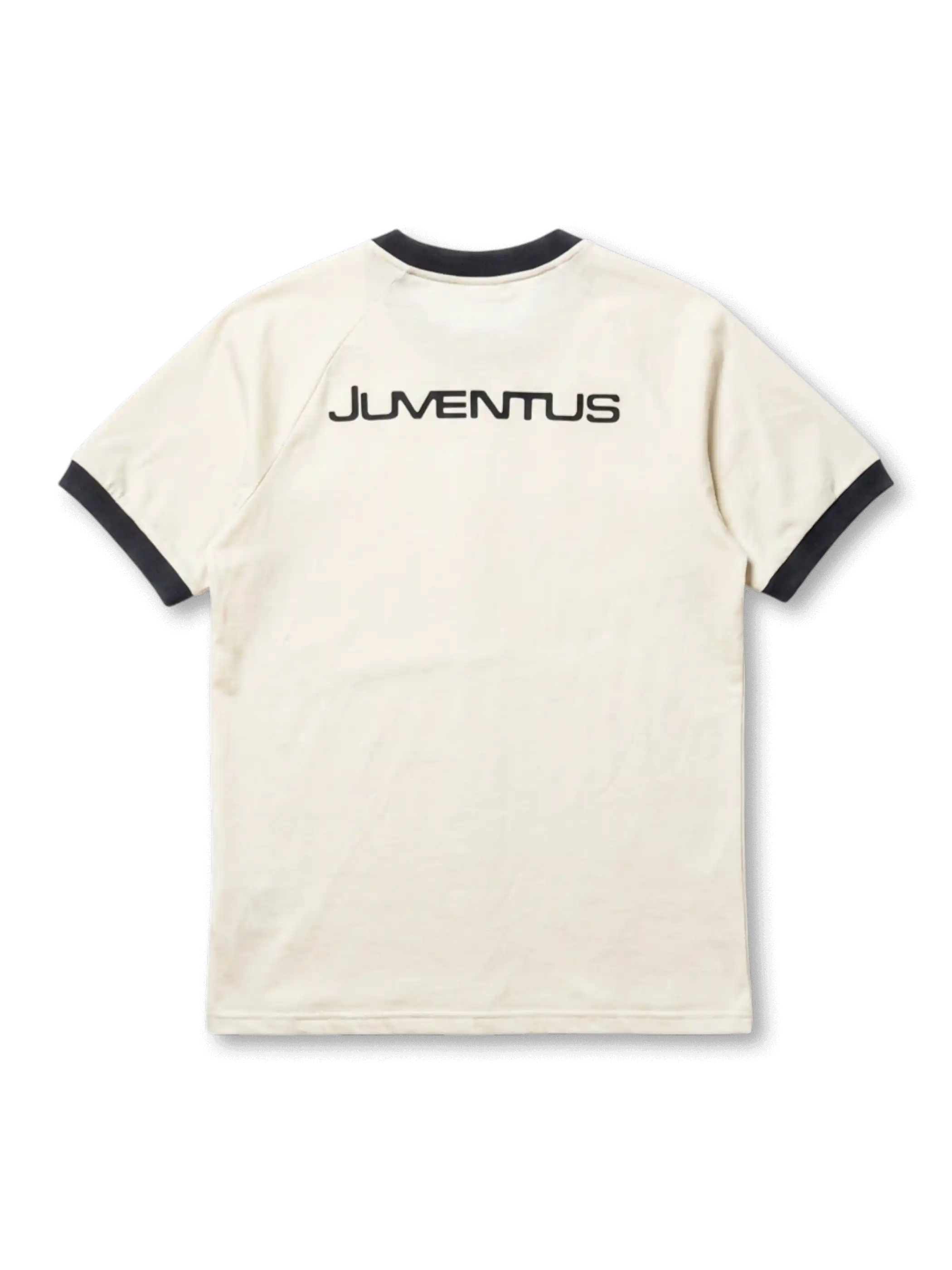 背面上部には「JUVENTUS」のレトロサンセリフテキストをブラックで表記しており、現行のJロゴ以前に使用されていたクラブテキストロゴのタイポグラフィを参照した復刻的なグラフィックを採用。身頃はクリーム単色無地で統一されている。
