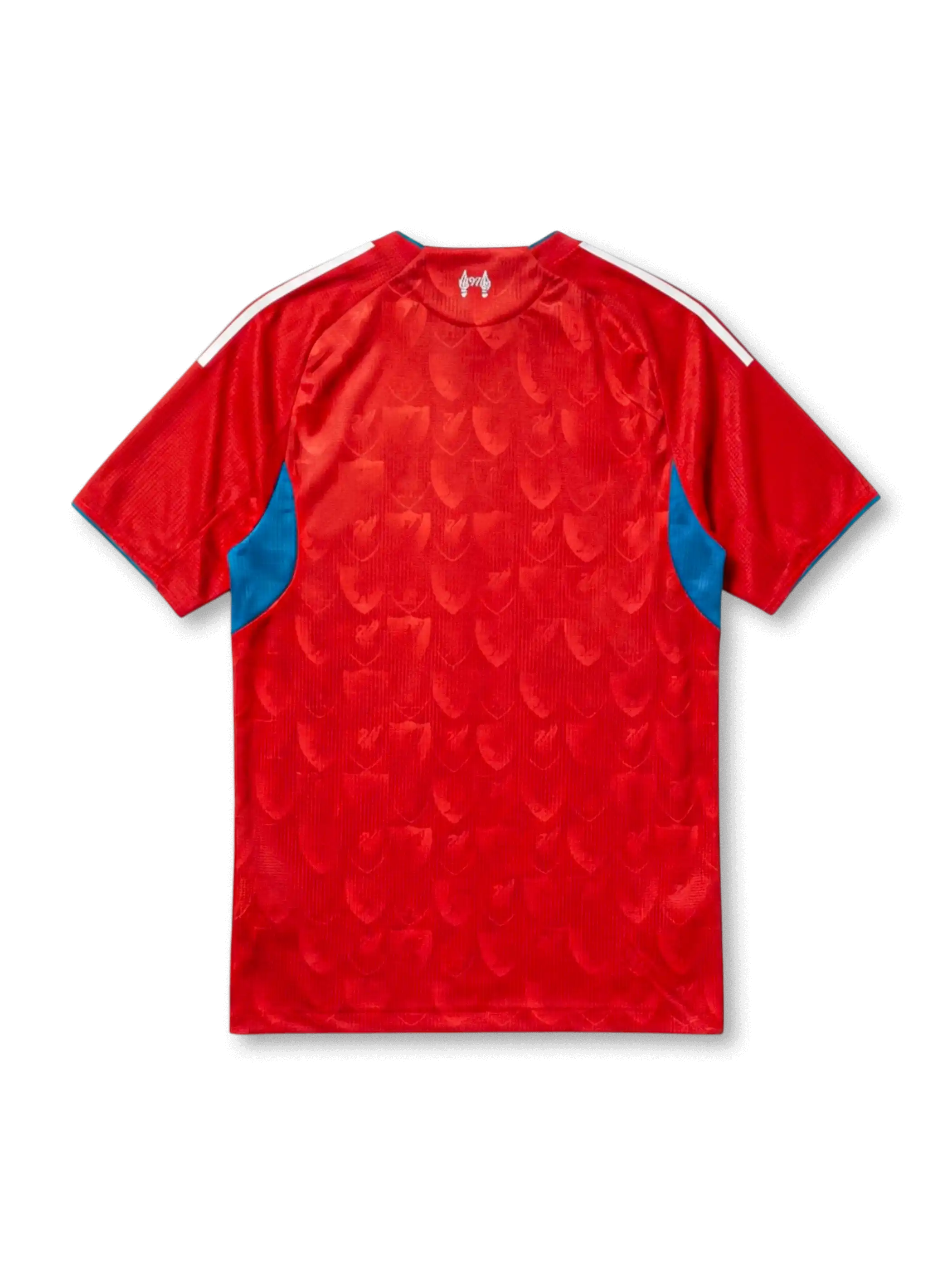 ベースカラーはレッド。全面にLFCのシールド(盾)モチーフとリヴァーバード(肝の鳥)を組み合わせたトーテムテクスチャをトーン・オン・トーンのジャカードプリントで施した構成。光沢のある素材と相まってパターンが陰影として浮かび上がる上品な仕様で、クラブのヘリテージモチーフを現代的に再解釈したデザイン言語となっている。