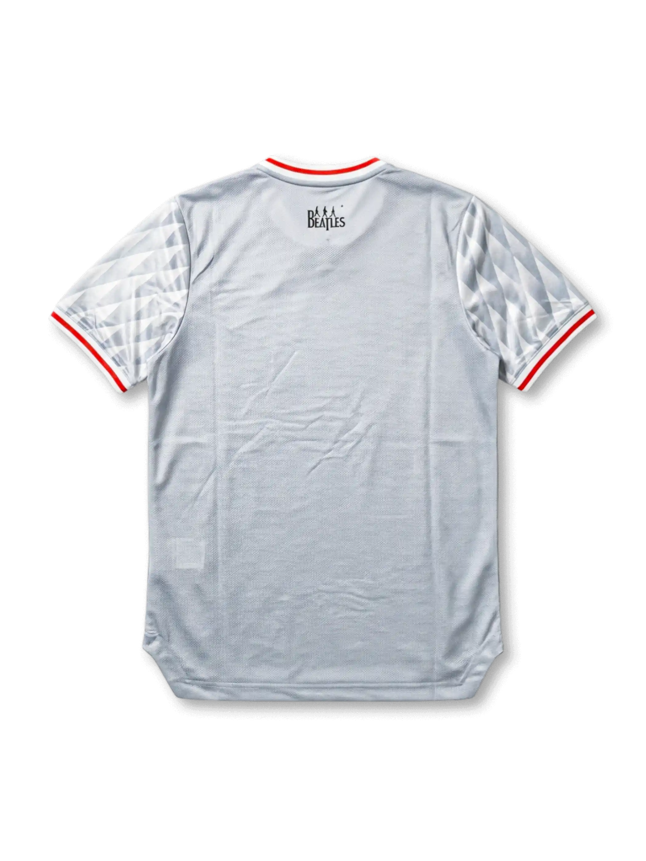 背面カラー部に「BEATLES」のシルエットロゴ(4人のシルエット付き)をブラックでプリント。裾右側にFORMOTIONの技術タグを確認。ネームなし仕様。adidas OriginalsとリバプールFCおよびザ・ビートルズの三者コラボレーションとして展開された限定エディション。