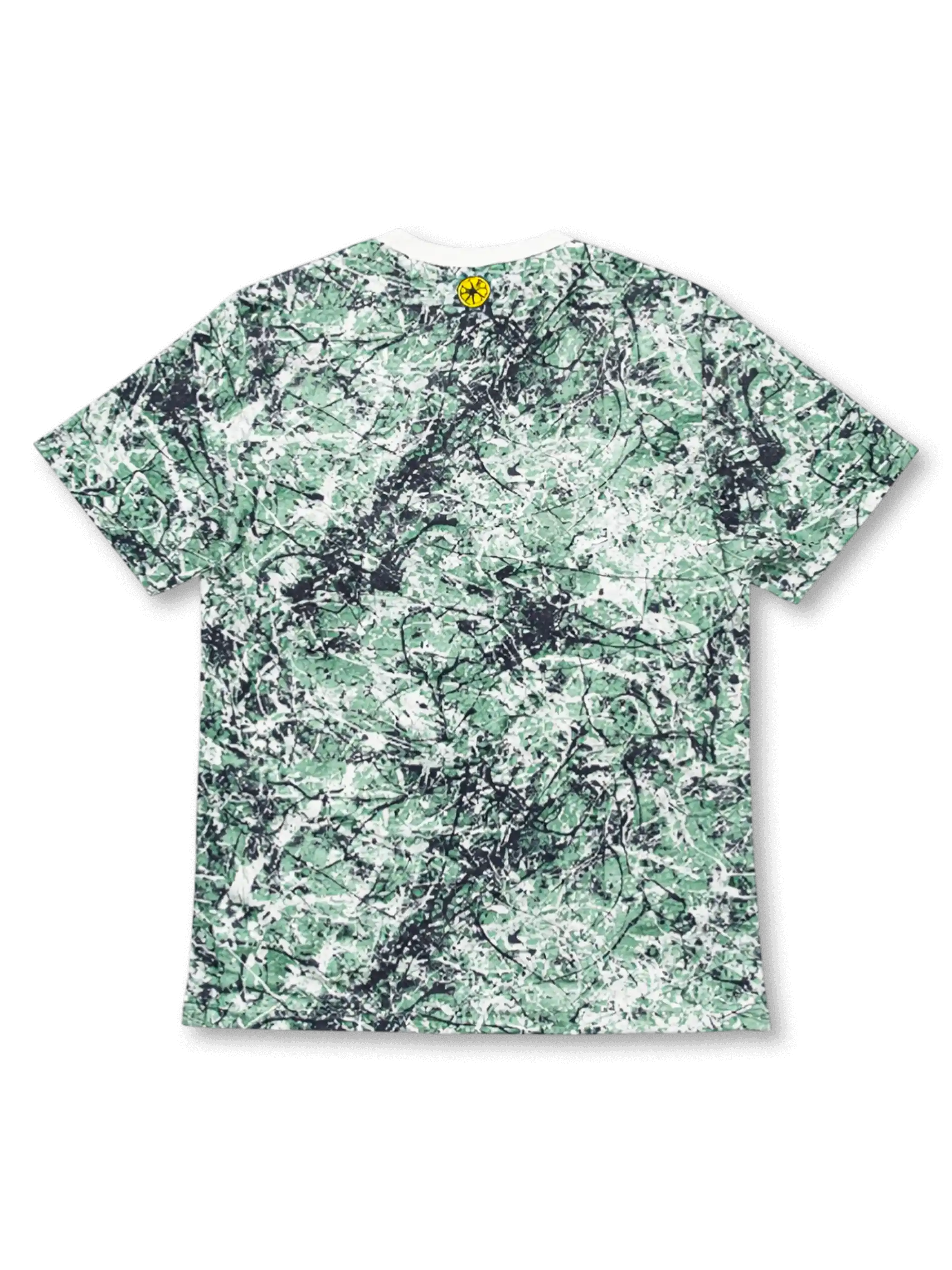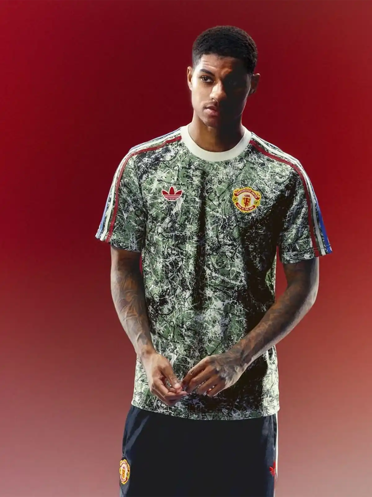 グリーン・ブラック・ホワイトの3色ペイントスプラッターを全面配置し、既発売のクリームホワイト版・マルチカラー版と異なる第三のカラーウェイとして独立したコレクション性を持つ。白丸首カラーに「THE STONE ROSES」のゴールド刺繍を直接施し、三者正式コラボの最も明確なブランド表明を実現。肩部にブルー×ホワイト×レッドのトリコロールストライプ、左胸に赤adidas Originalsトレフォイルロゴ、右胸にマンチェスター・ユナイテッド丸型クラブエンブレムを配置したシリーズ最高希少モデル。