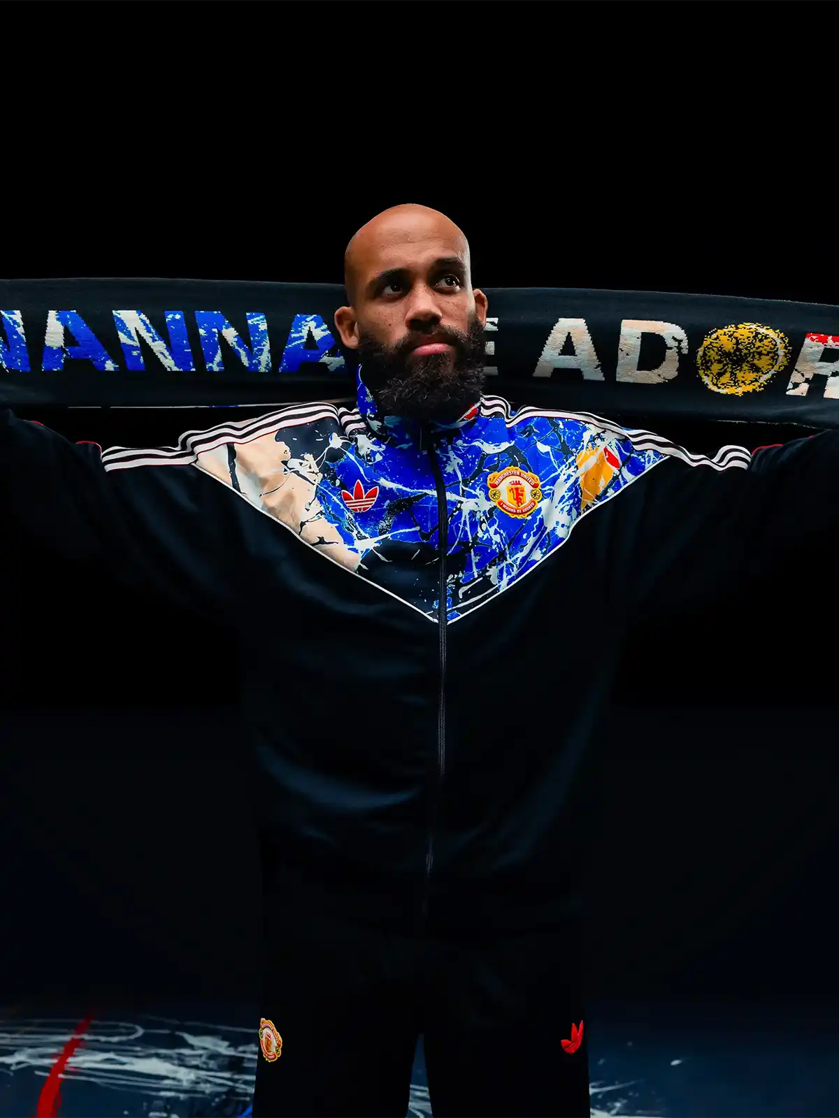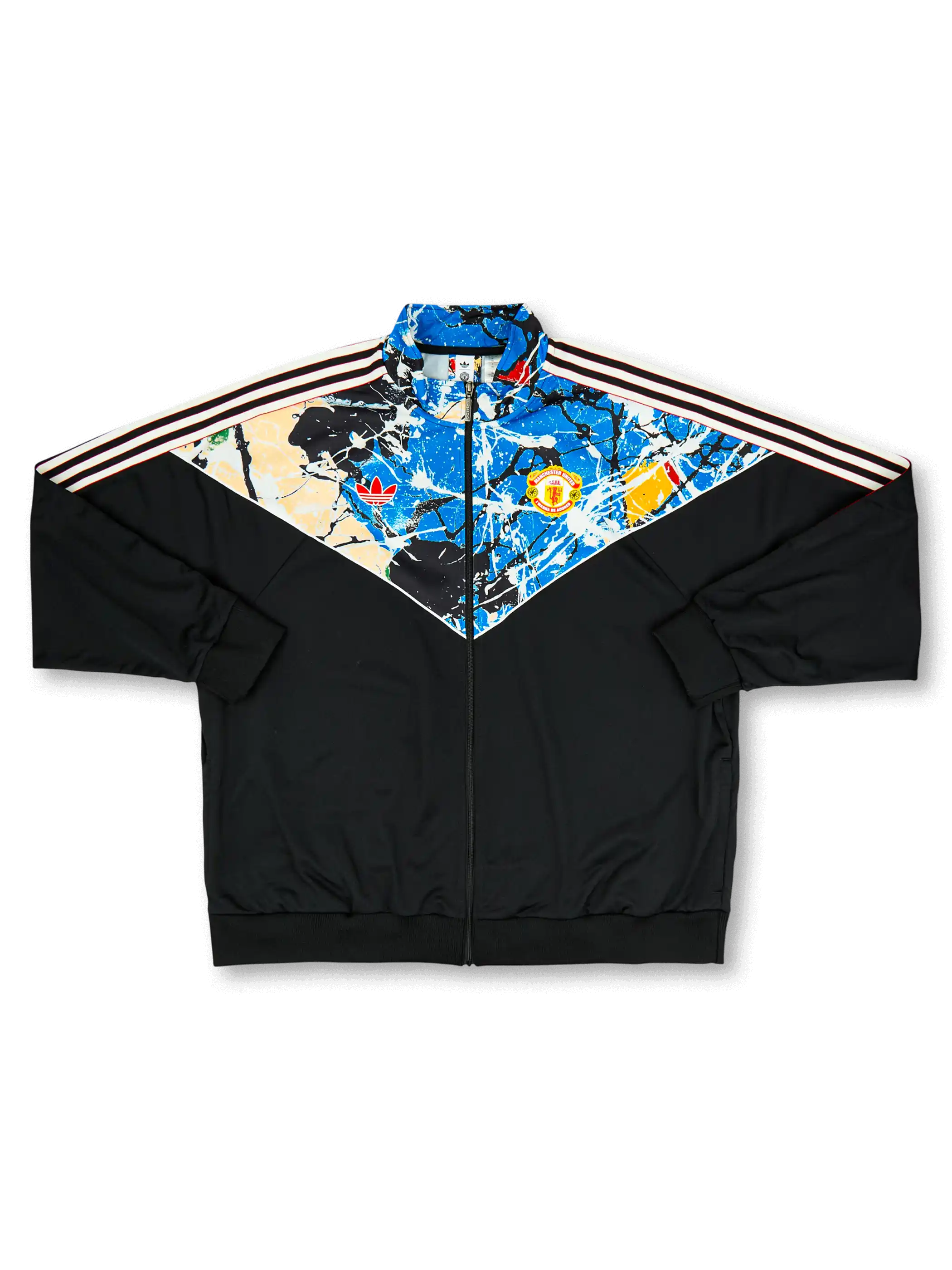 ブラック×ブルー・マルチカラースプラッシュプリントのV型胸パネル、ピンク3本ストライプ・adidasトレフォイルロゴ・マンUエンブレムを配したadidas Originalsコラボトラックトップ。