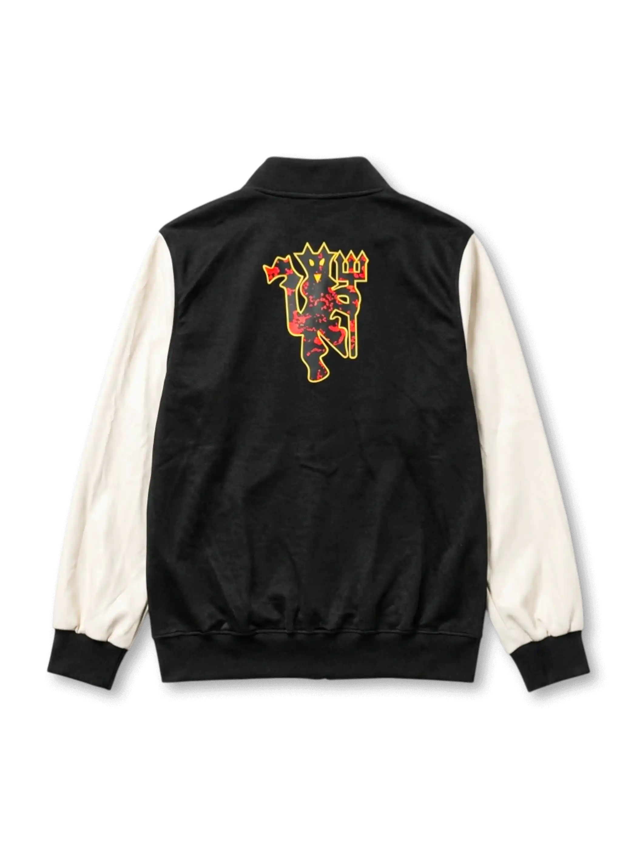 ブラックボディ×クリームホワイト袖のバーシティ構成に、前面ゴールドadidasトレフォイル・MUエンブレム・Tezosスポンサーロゴ、背面に大型レッド×イエロースプラッターMUレッドデビルプリントを配したadidas Originals×Tezosコラボボンバージャケット。
