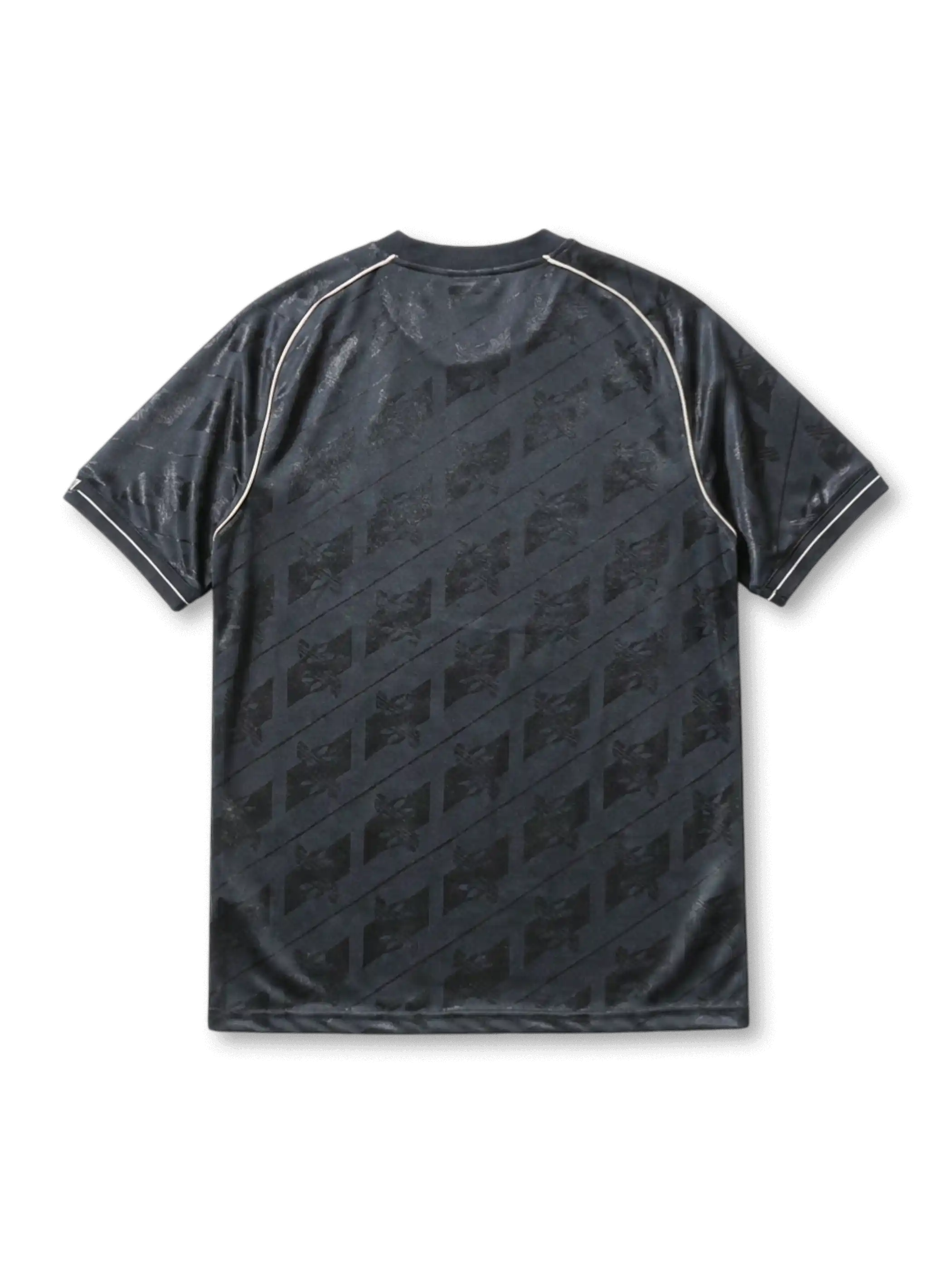 背面はブラックジャカード全面構成・ネームなし仕様。両サイドにクリームパイピングラインが入り、袖口のRMテキストトリムは前後継続して配置される。光沢素材×ジャカードパターン×ゴールドアクセントの組み合わせにより、試合用ユニフォームとは異なるプレミアム感を持つOriginalsライフスタイルモデルとして展開。