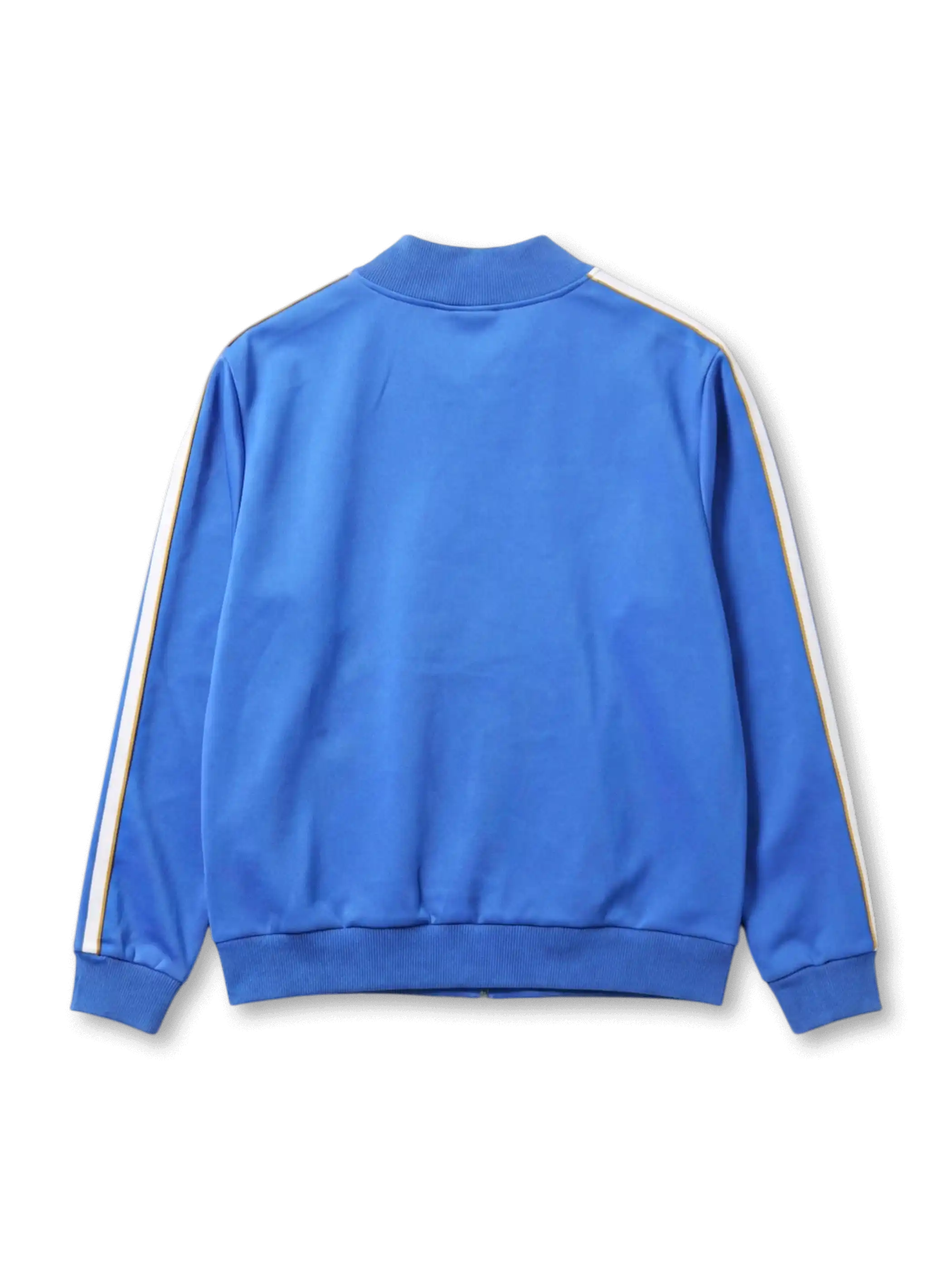 ボディ全体にロイヤルブルーを配し、袖の3ストライプとリブにオフホワイトを組み合わせたクリーンな二色構成。左胸にはadidasトレフォイルロゴ、右胸にはレアル・マドリードの現行エンブレムをゴールドと白の刺繍で配置。フルジップ仕様でスタンドカラーを採用し、裾と袖口はリブ仕上げ。左裾にはadidas Originalsとレアル・マドリードのダブルロゴを織り込んだヘリテージラベルを備える。非試合用・復刻ライフスタイルラインとして、1980年代のアウェイカラーを現代的なシルエットで再現した一着。
