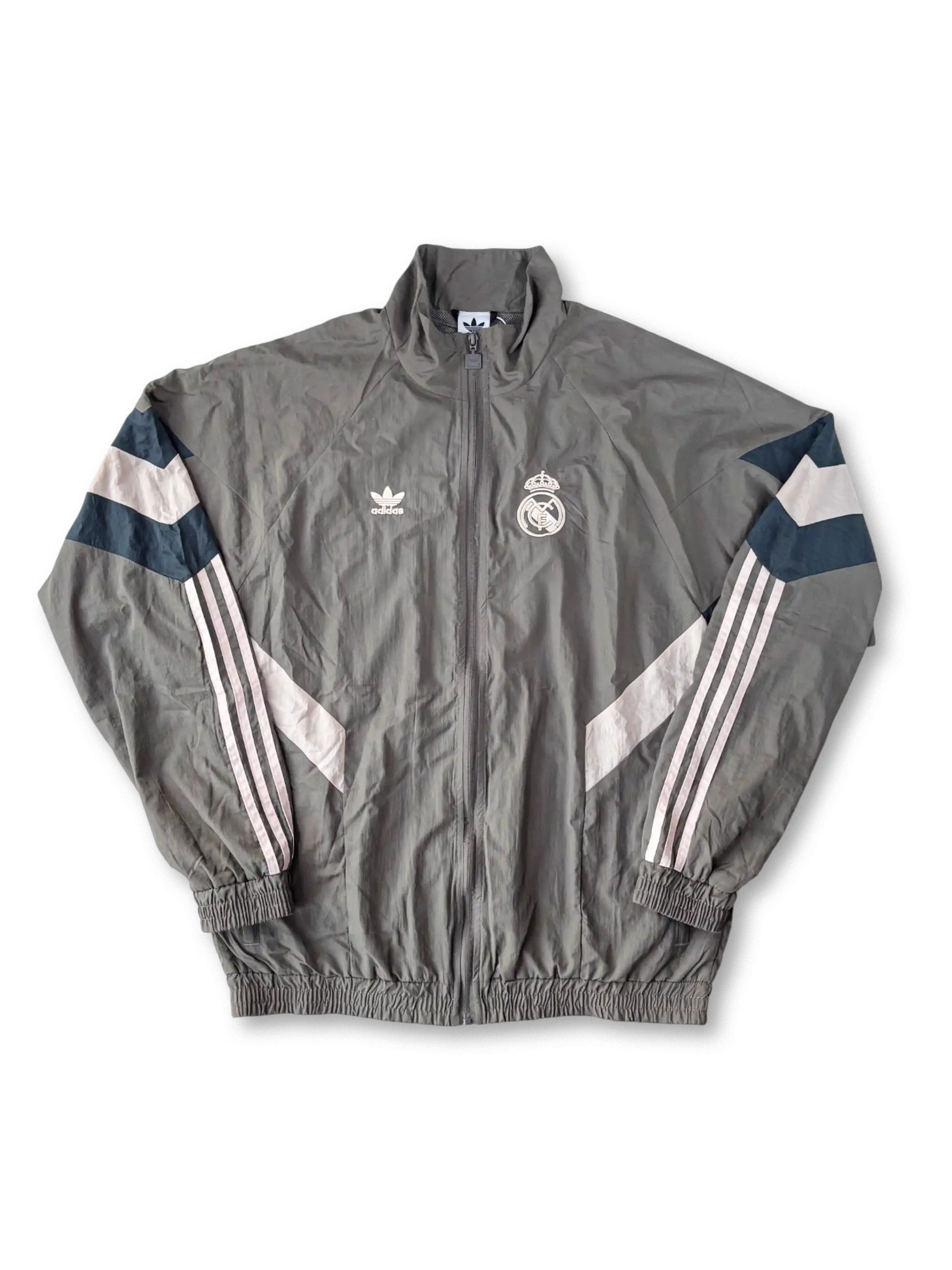 グレートーンにホワイトとネイビーの切替を施した、レアル・マドリードの90年代風レトロトラックスーツ。