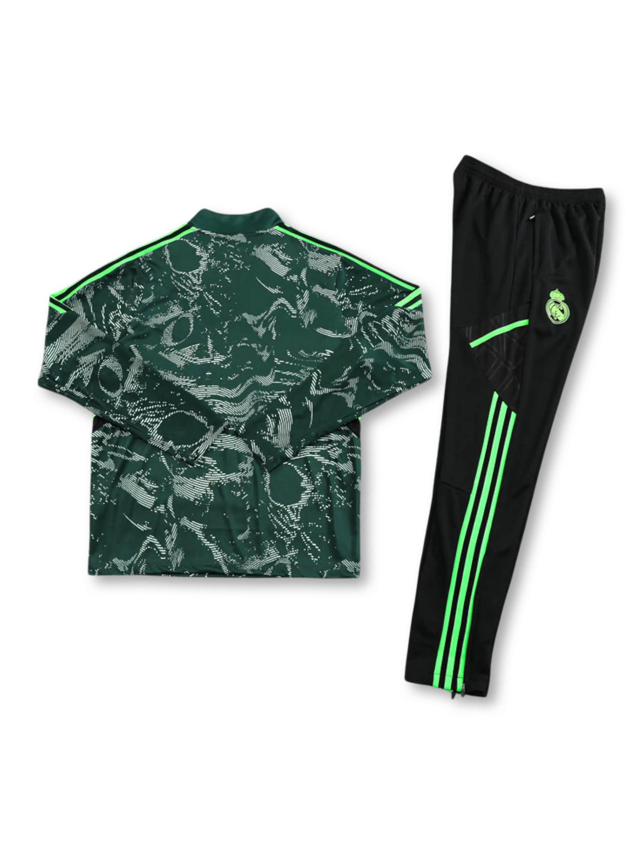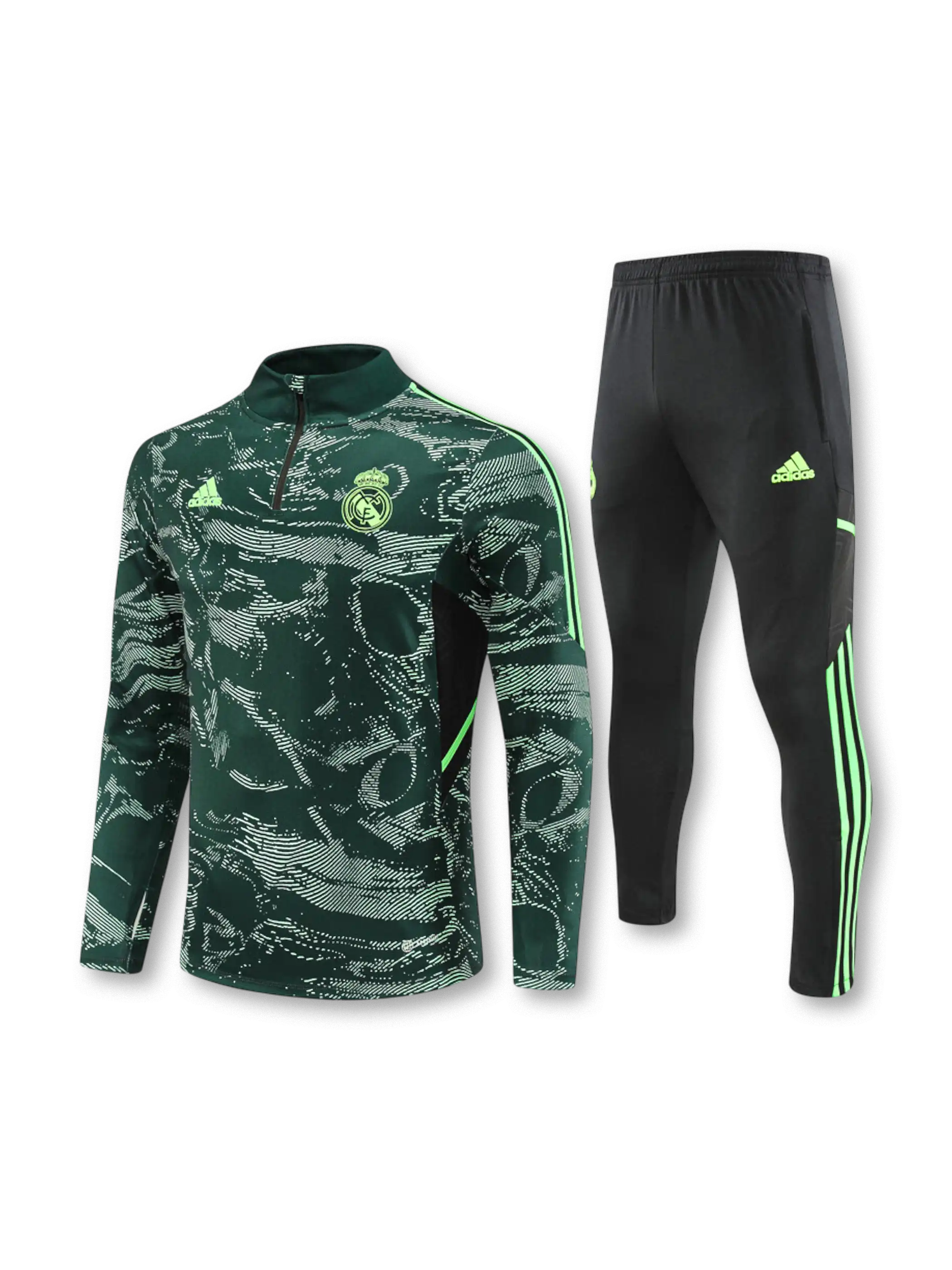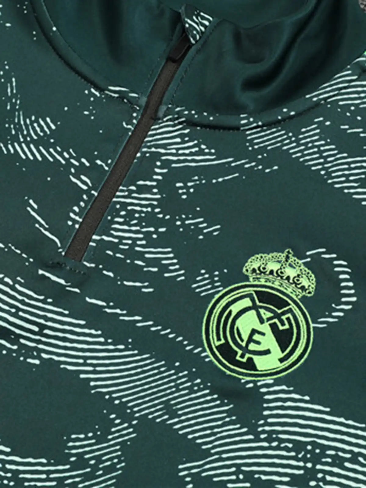 グリーンのカモ柄にネオングリーンのラインを効かせた、UCL仕様のレアル・マドリード ハーフジップトレーニングセットアップ。