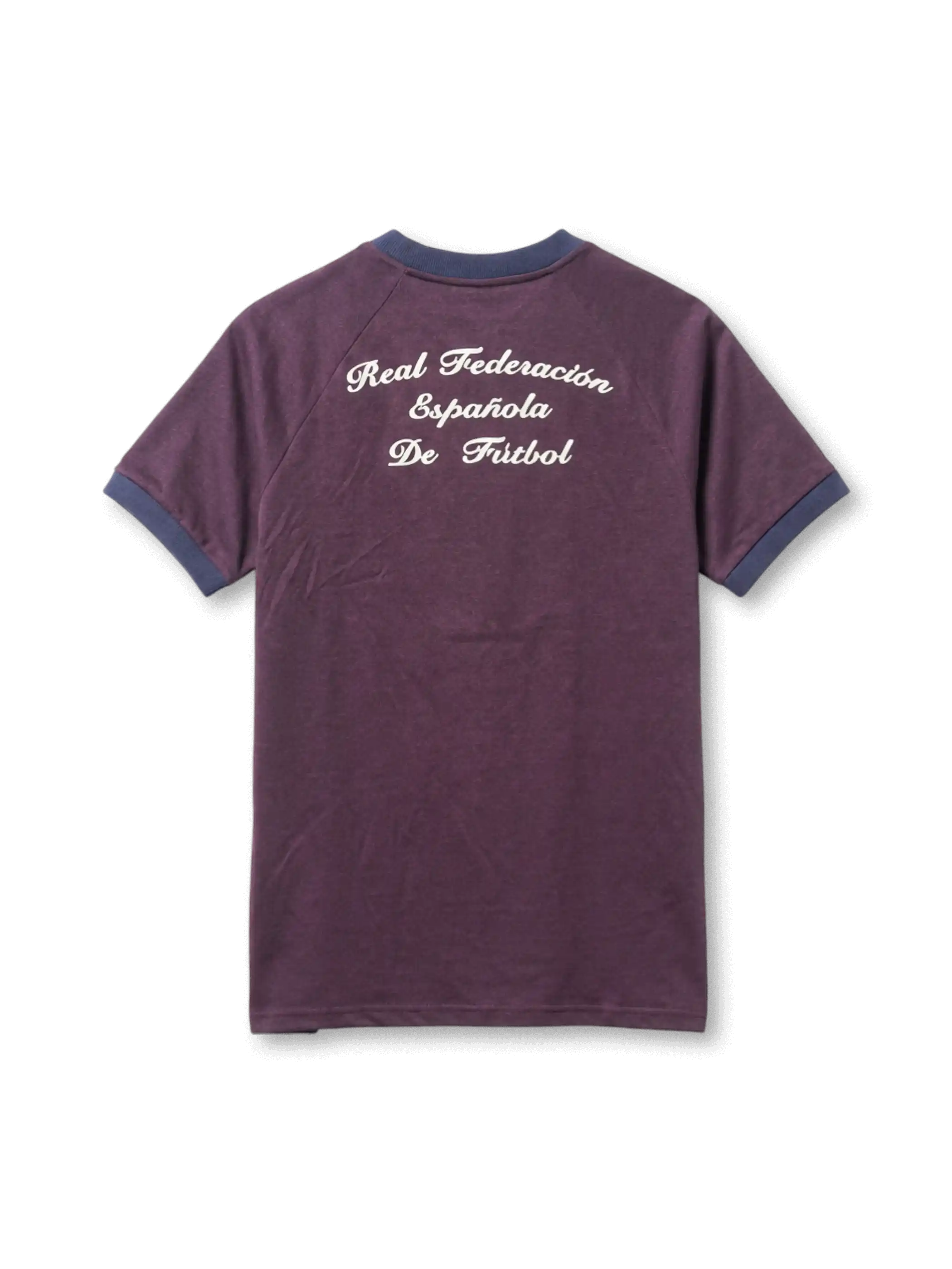 落ち着いたパープル系ボディにホワイトのスリーストライプを配置し、胸元にはトレフォイルロゴとスペイン代表エンブレムをプリント。背面には「Real Federación Española De Fútbol」のクラシック書体ロゴを採用し、アーカイブ感のある構成に仕上げている。ラグランスリーブ仕様により肩周りの可動域を確保し、日常着としても取り入れやすいバランス。
